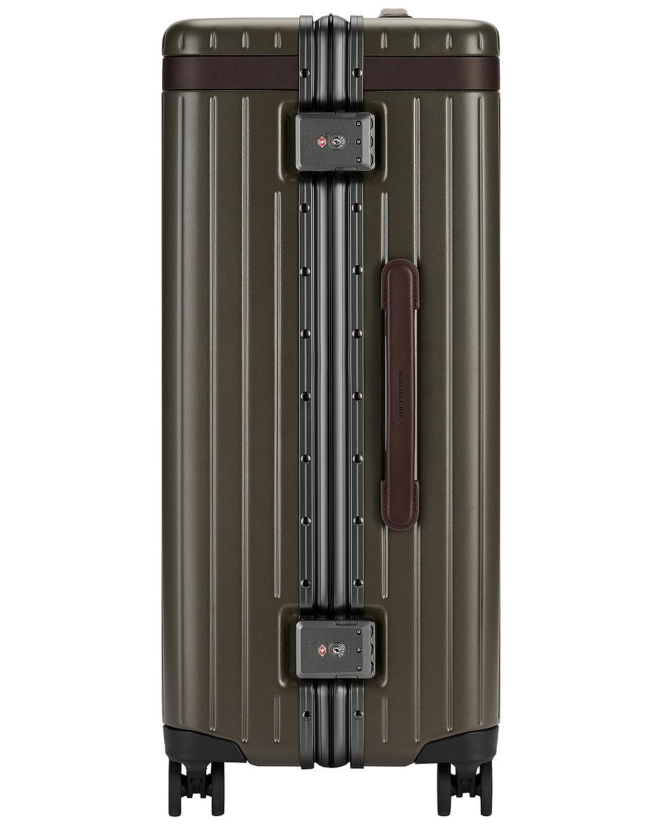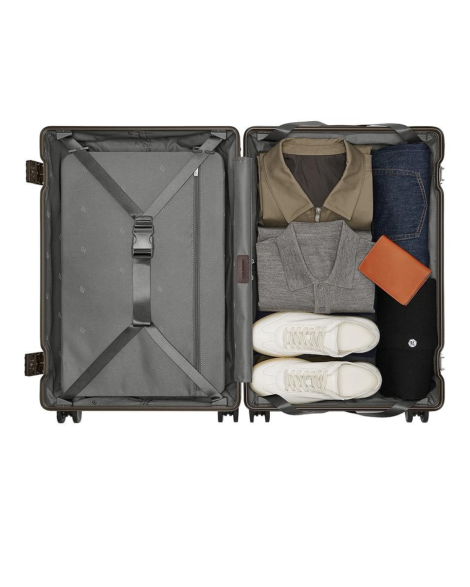 suitcasePolycabonate shell cabin with aluminum frameLining: 100% recycled polyesterLeather trims / Made in China / Lock closure / Any-stop trolley handle / 2 sets of compression straps and compression pad / 2 interior zipped pockets / 360 spinner wheels / Measures approx 28.5x45.2x68.6 cm / 11.2x17.8x27" / Our Style No. CEDF-WY5 / Manufacturer Style No. CF10312 /