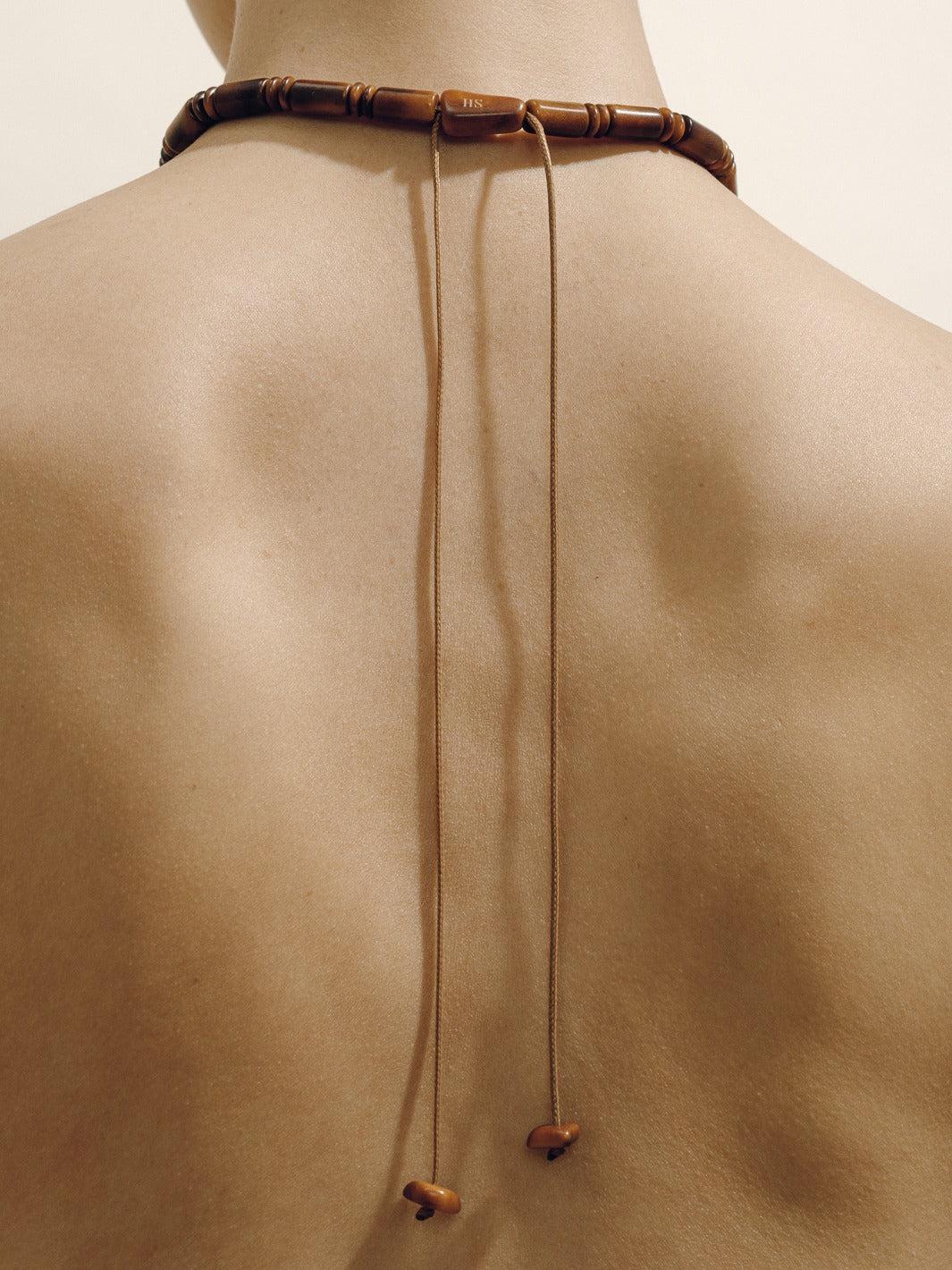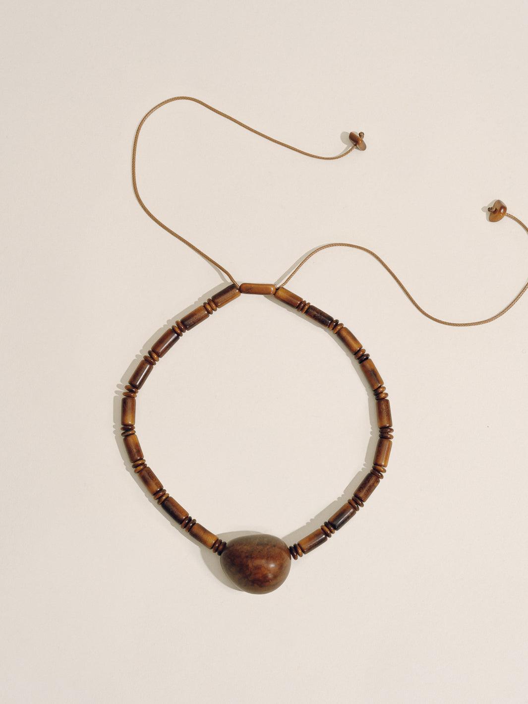 Hand-carved from sustainably sourced tagua seeds, this minimalist choker reflects the precision of handcraft and the elegance of raw material. Known as "vegetable ivory," tagua is the seed of the Phytelephas palm — valued for its smooth texture, durability, and sculptural quality.Each bead is shaped by hand using traditional techniques. Natural variations in color and shape make each piece one of a kind.Designed to be worn as a choker, with a refined, minimal finish. Adjustable drawstring closure ensures a tailored fit.