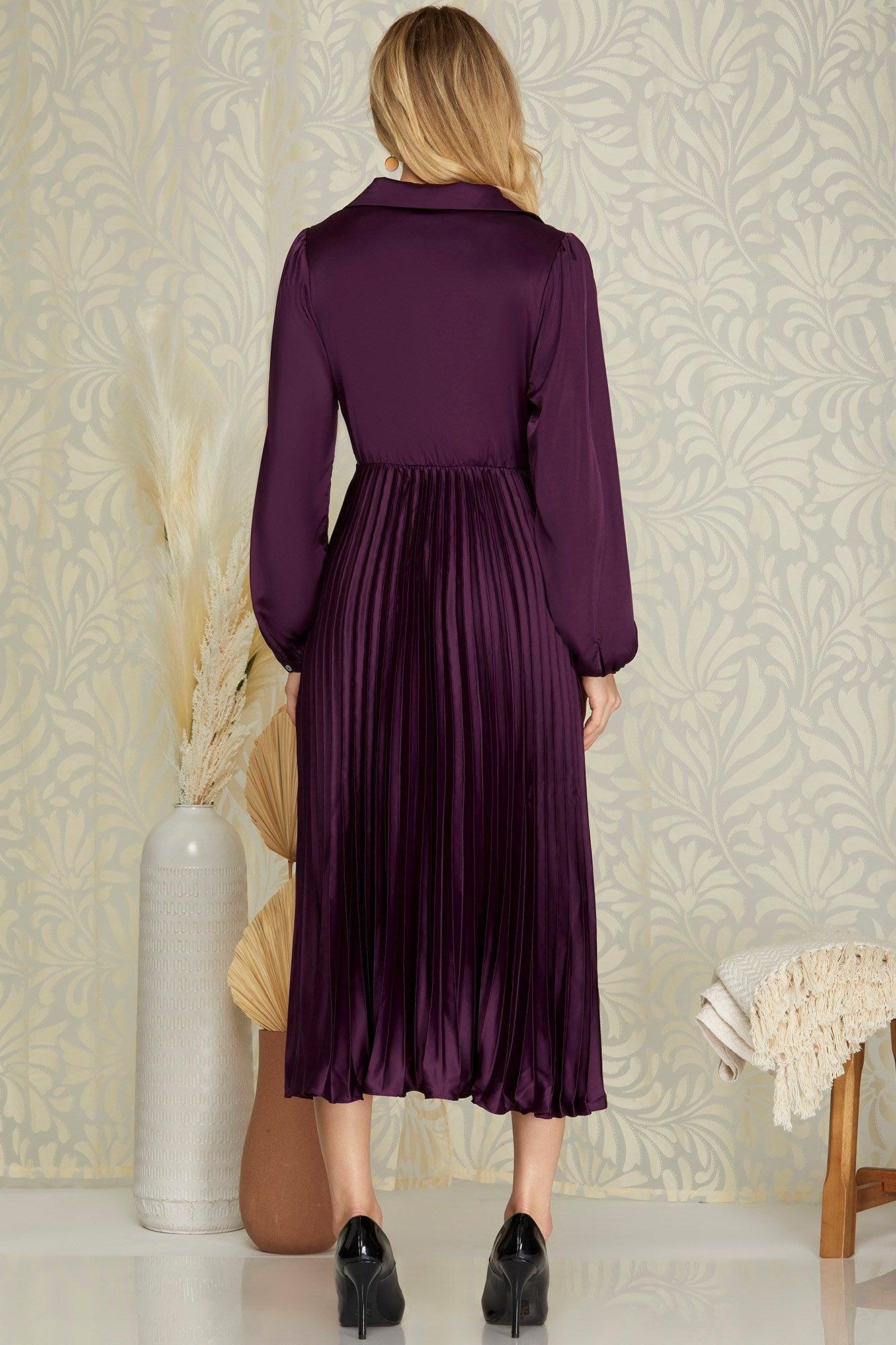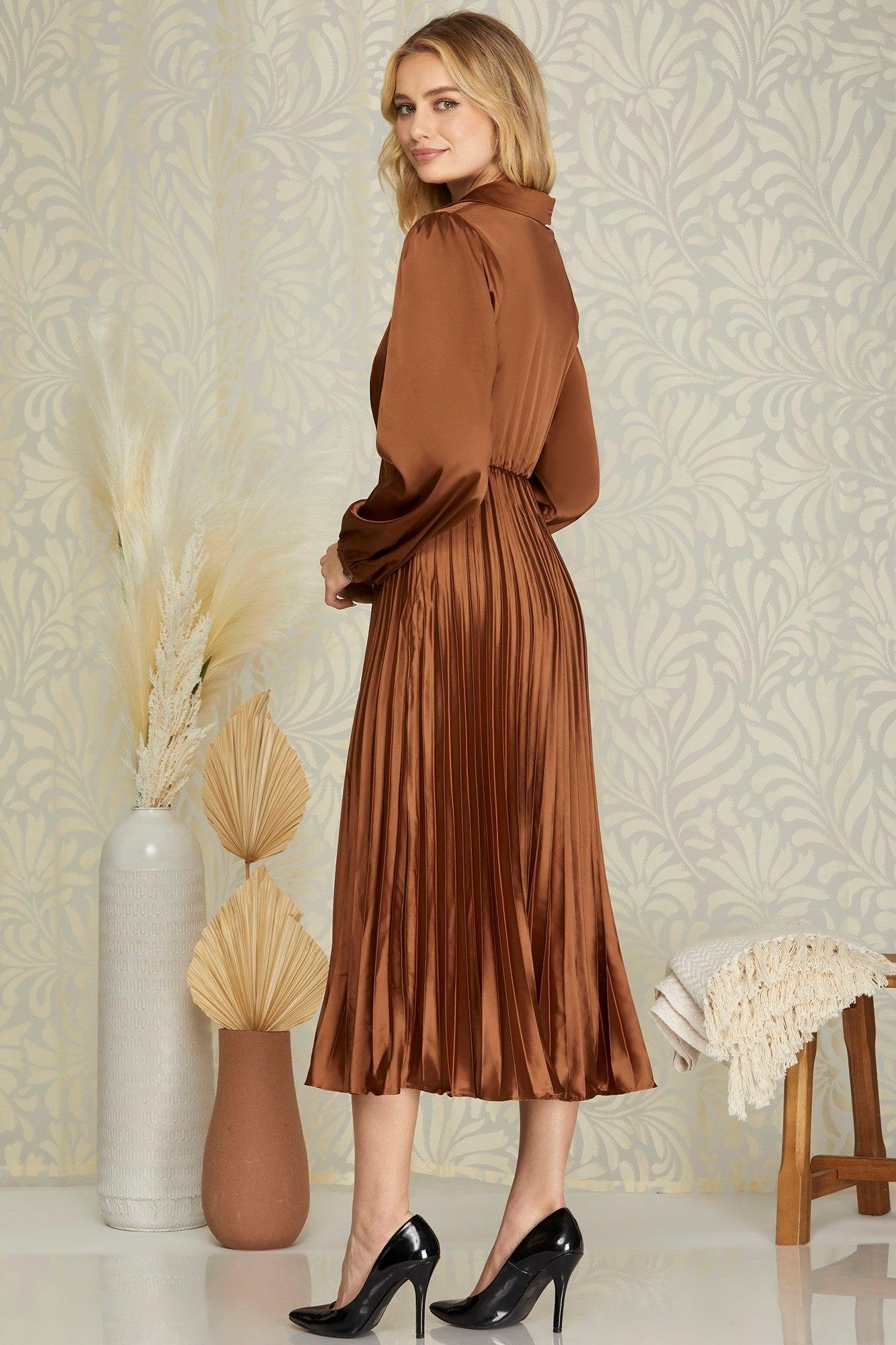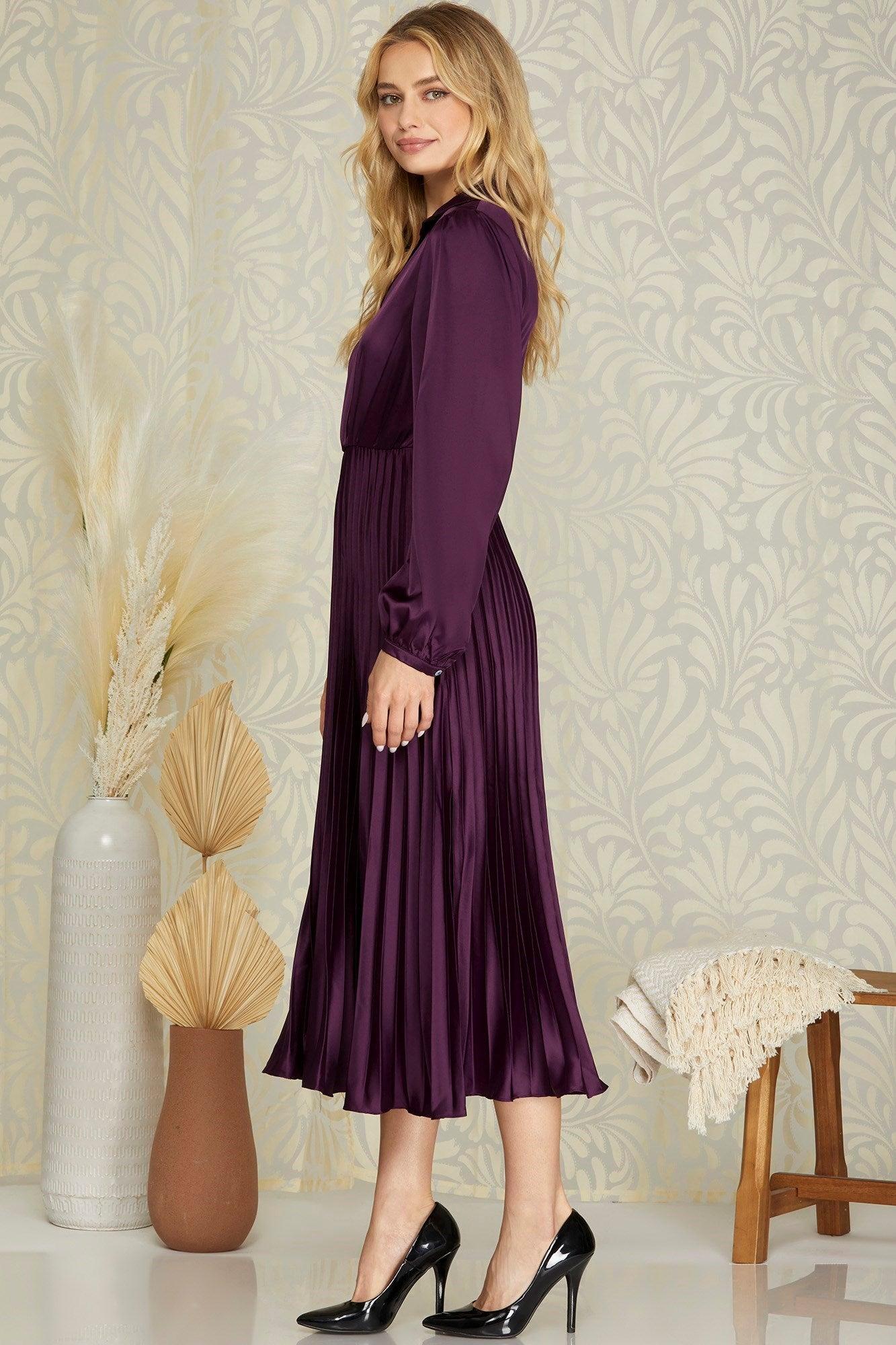 Embrace timeless sophistication with our Surplice Long Sleeve Woven Satin Pleated Midi Dress. Crafted from luxurious satin, this dress drapes effortlessly over your silhouette, promising a graceful and glamorous look for any occasion. The surplice neckline adds a touch of allure, while the long sleeves provide just the right amount of coverage to keep you feeling both comfortable and chic.