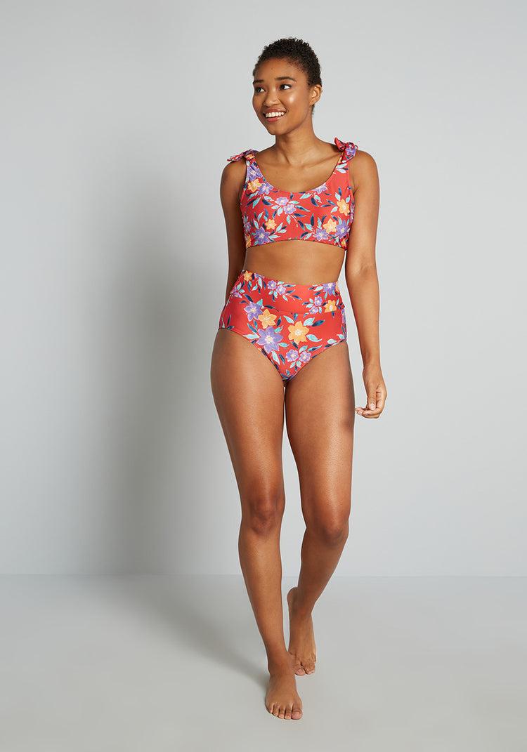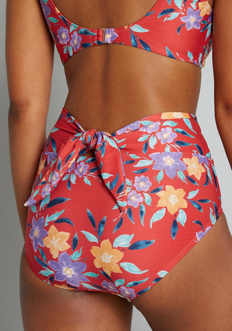 With a flirty, decorative tie detail at the back, these red bikini bottoms from our ModCloth namesake label are retro silk floral prints that meet the seaside. Thanks to its flattering silhouette and exclusive vintage-inspired floral print made-up of purple and orange flowers with teal green and blue hued leaves with hints of bright ivory that scatter all over, this high-waisted swimwear separate is ready to elevate your seaside or poolside swim look no matter what bikini top and cover-up you pair with it.Shell: 88% Polyester, 12% Spandex. Lining: 86% Nylon, 14% Spandex. Hand wash. Fully lined. Imported