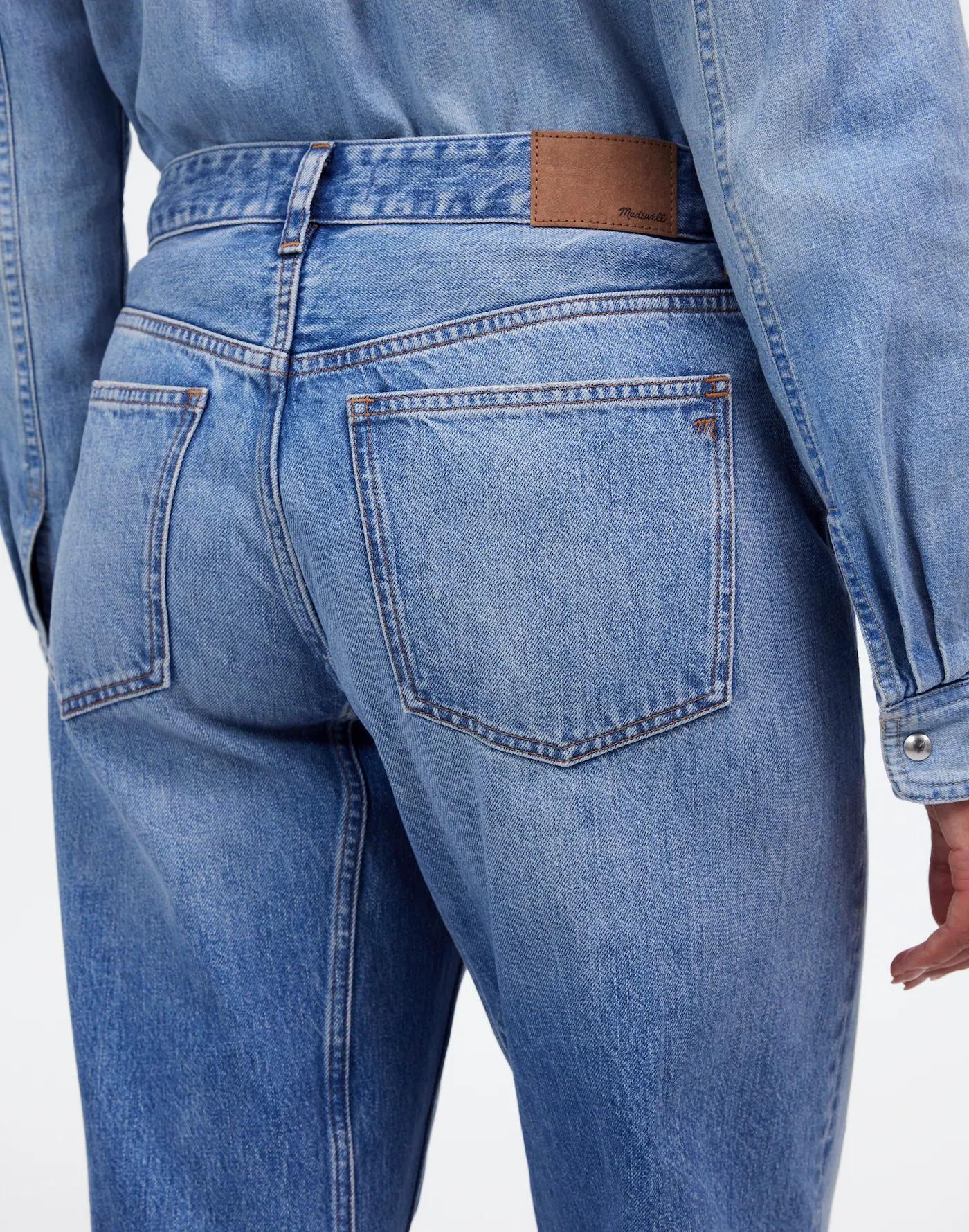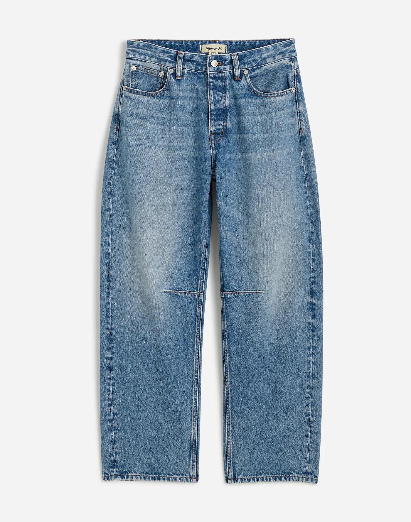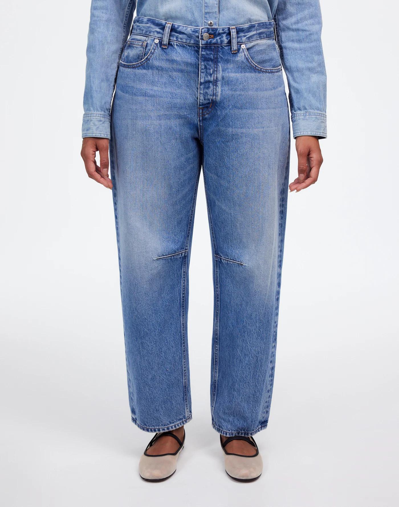 The cut: anchored at the waist with an oversized fit, these barrel-leg jeans have darts at the knees for an articulated curved look. Designed for an hourglass shape (see: narrower waist with a contoured band, a longer rise and a little extra room at the hips and thighs).