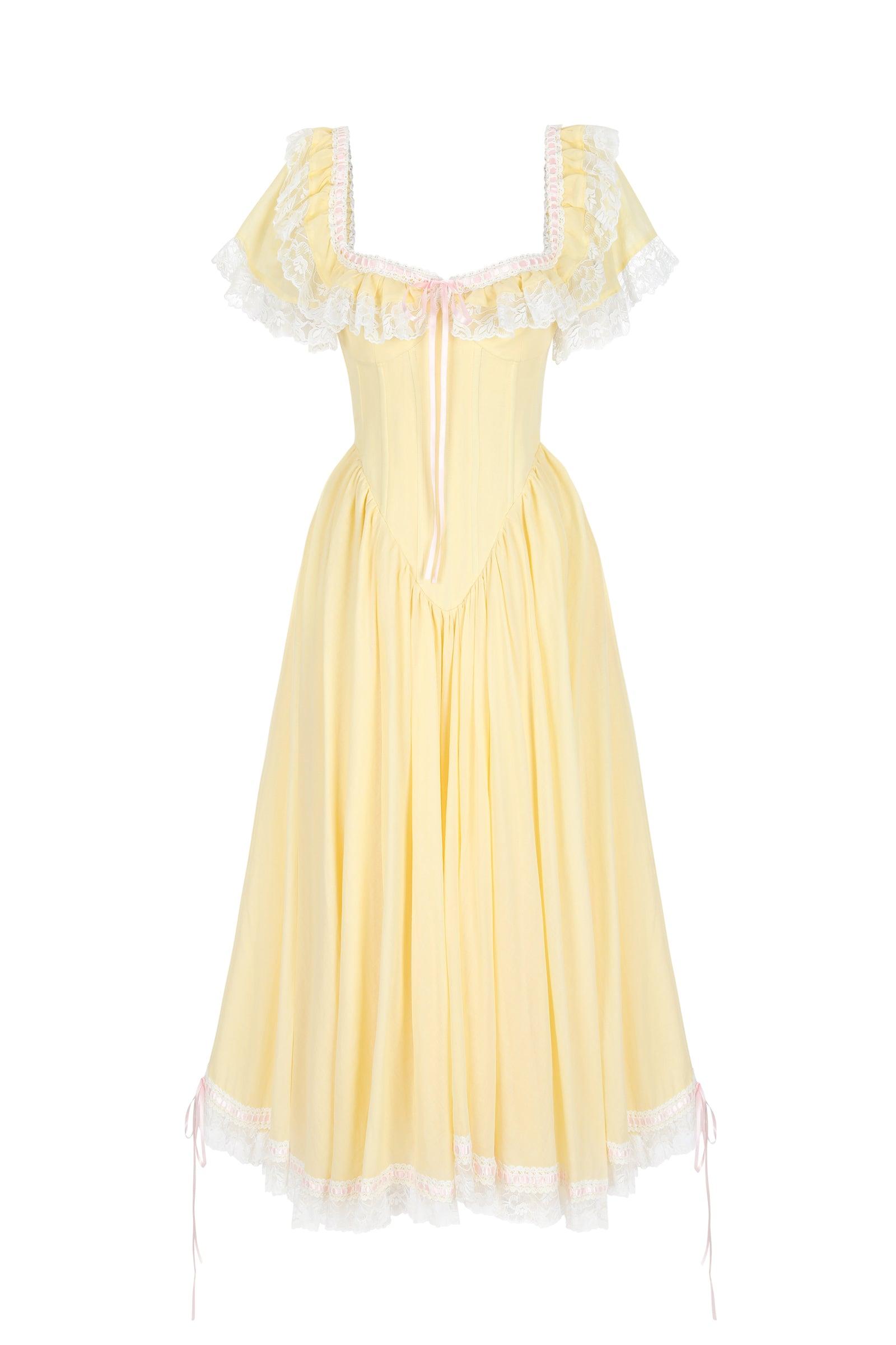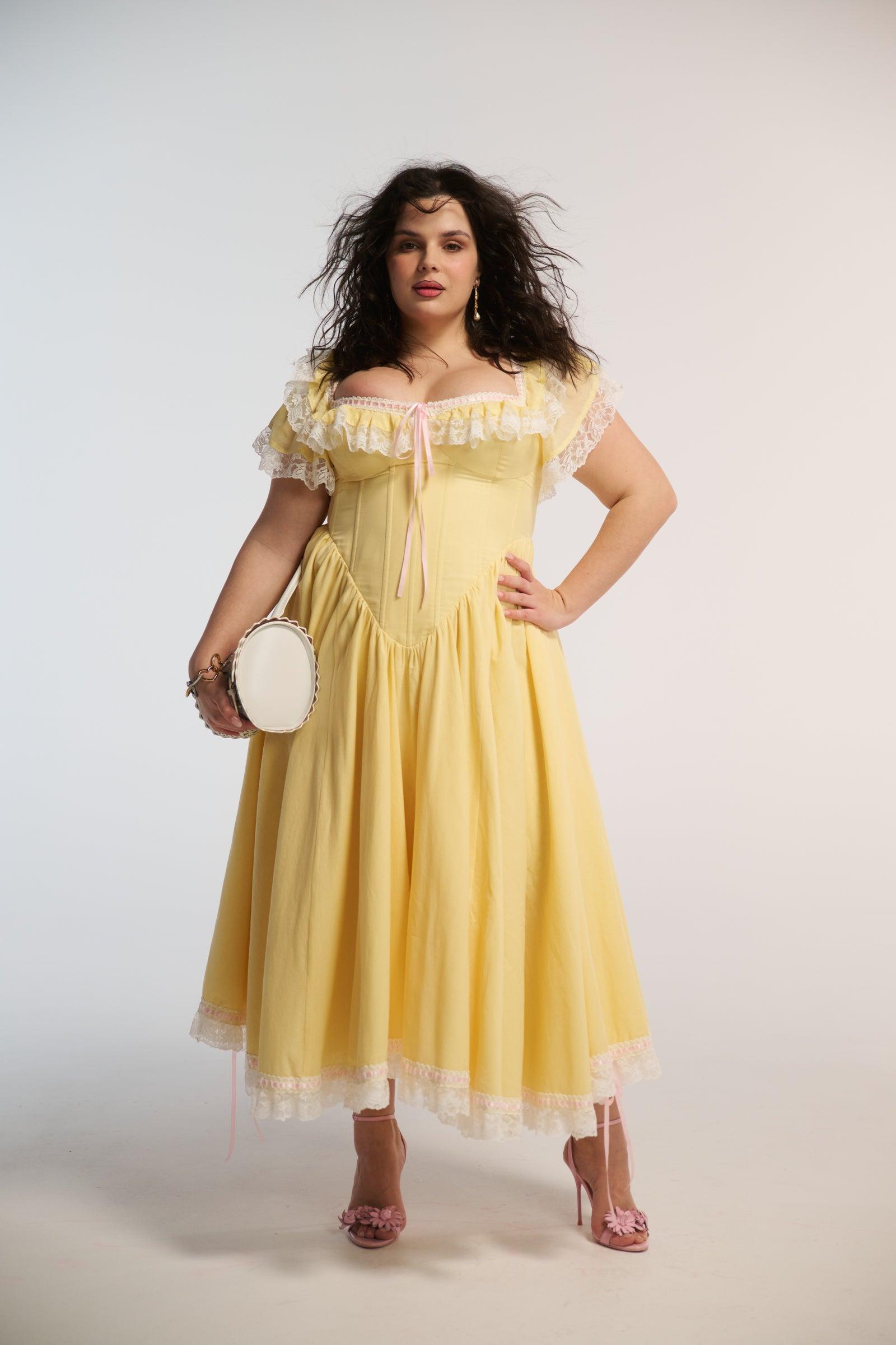 Custard yellow, like a 1960s Jello mold. Yellow was the playful color of that era, and this cotton gauze Basque waist corset midi channels that energy. Underwire cups and boning at the waist for structure, side bustling, corset lacing at back, lace trim throughout. Bold, sweet, unapologetically feminine. Cotton gauze Basque waist corset midi dress Underwire cups and boning at waist Lace trim throughout Elastic sleeves can be worn up or down Corset lacing at back Side bustle detail for skirt adjustability Lined at bust Center back invisible zipper closure Fabric: 100% Sheer Cotton Gauze Alicia is 5’4” and a size XXL in Selkie. Her measurements are 38” bust, 37” waist, 47” hip.