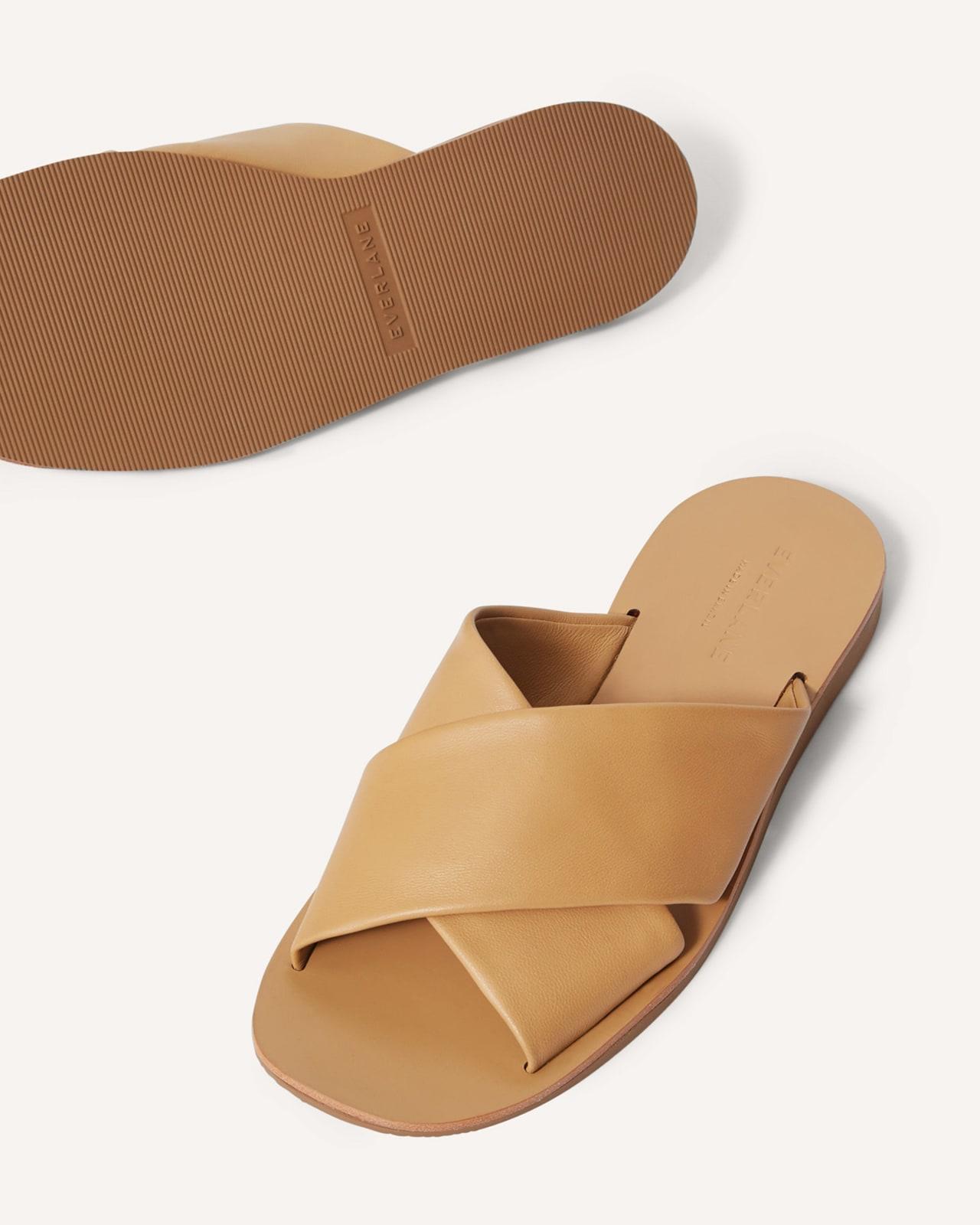 The ease of your summer flip-flops meets the polish of your favorite flats. Made of buttery soft leather the Day Crossover Sandal features a tapered square toe a flexible footbed that gives with every step and a few updates from the last renditionlike a slightly raised sole and a wider better fit throughout. Plus the criss-cross straps are folded over for added comfort and less chafingtalk about a win-win. Day Crossover Sandal by Everlane in Light Taupe, Size 8.5