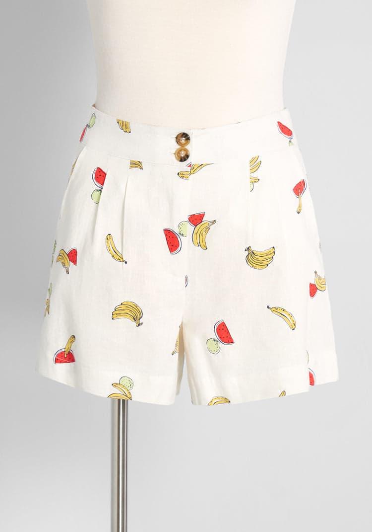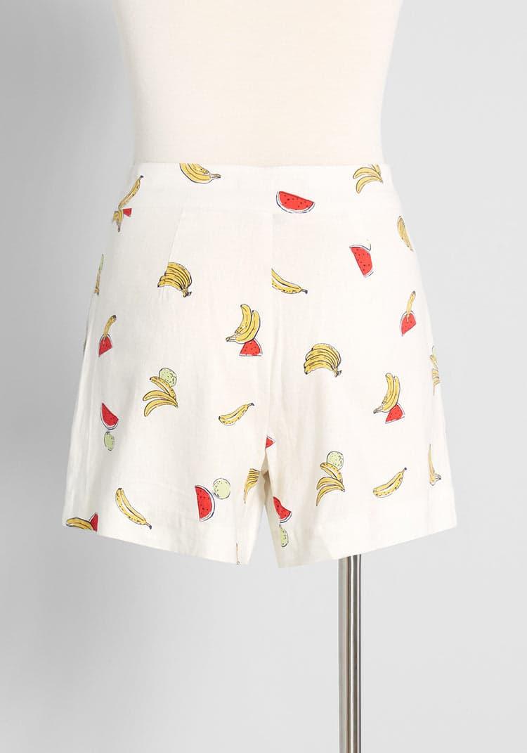 Made of a breathable, lightweight viscose-linen blend weave, these white high-rise shorts from our ModCloth namesake label are too good to pass up for the warm and sunny days summer has in-store. Featuring an exclusive illustrated print of yellow bananas, red watermelon slices, and green melons bunched together that are all scattered throughout, this pair of shorts are more than just flattering, they’re fun! With a dual button-front closure at the zip fly, subtle pleating at the front to add fullness to the leg opening, and a cinched high-waist, their vintage-inspired summer style cannot be denied.Shell: 55% Linen, 45% Viscose. Contrast: 100% Cotton. Machine wash. Side pockets. Semi-sheer. Front zipper with button closure. Imported Fabric provides stretch. 4=11 inches Rise 4=3.5 inches Inseam 16W=13.5 inches Rise 16W=3.75 inches Inseam