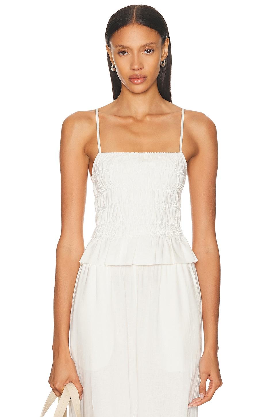 top50% linen, 47% rayon, 3% spandex / Hand wash / Pull-on styling / Adjustable shoulder straps / Elastic straps at back / Smocked fabric at front / Linen fabric / Item not sold as a set / Made in China / Our Style No. SOLF-WS10 / Manufacturer Style No. SU25-R2308LIN-OW / Model is wearing size S.