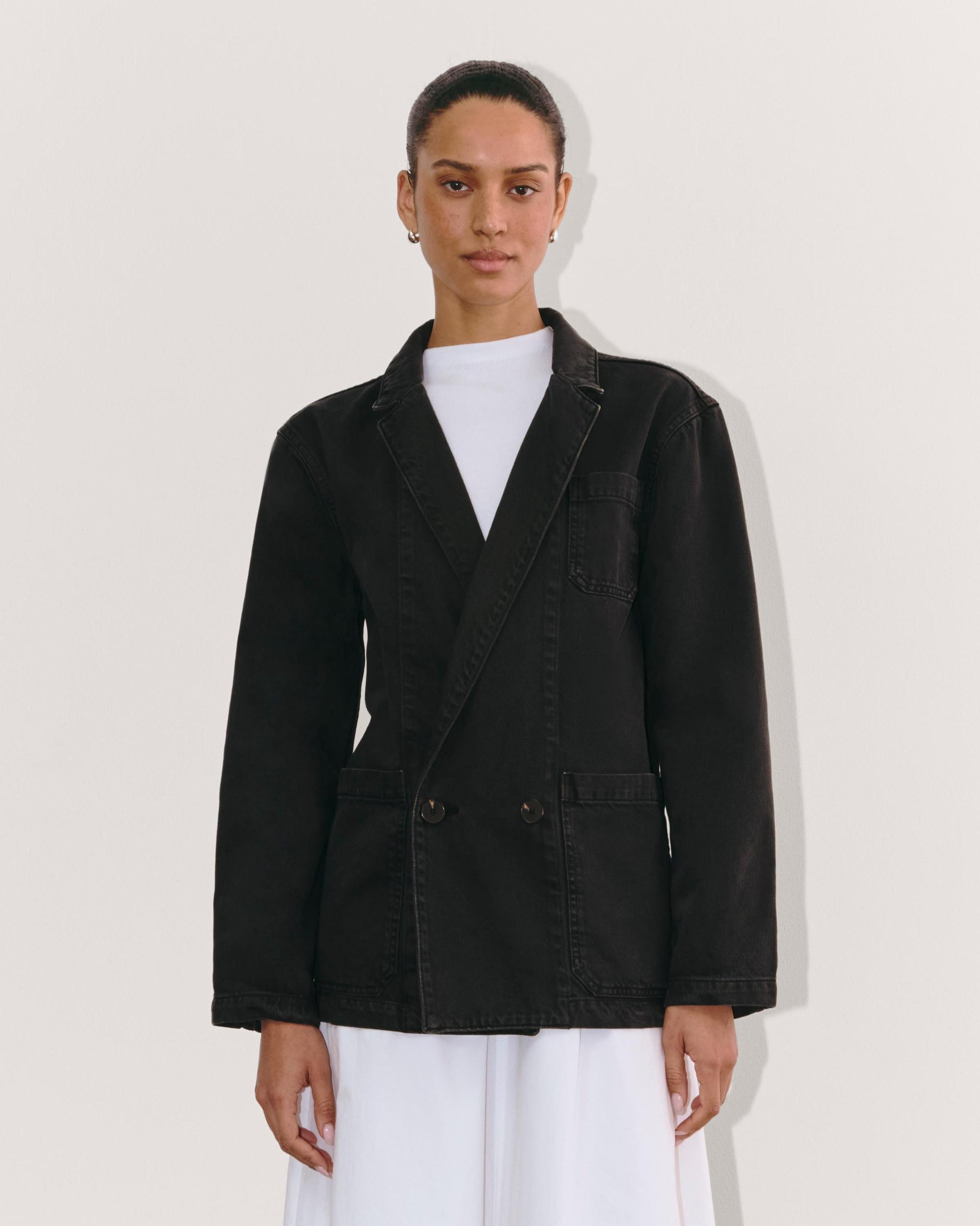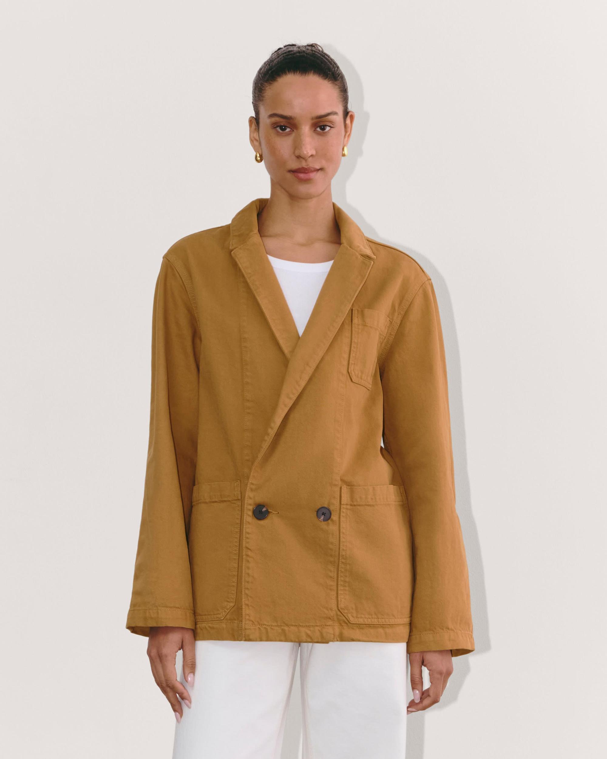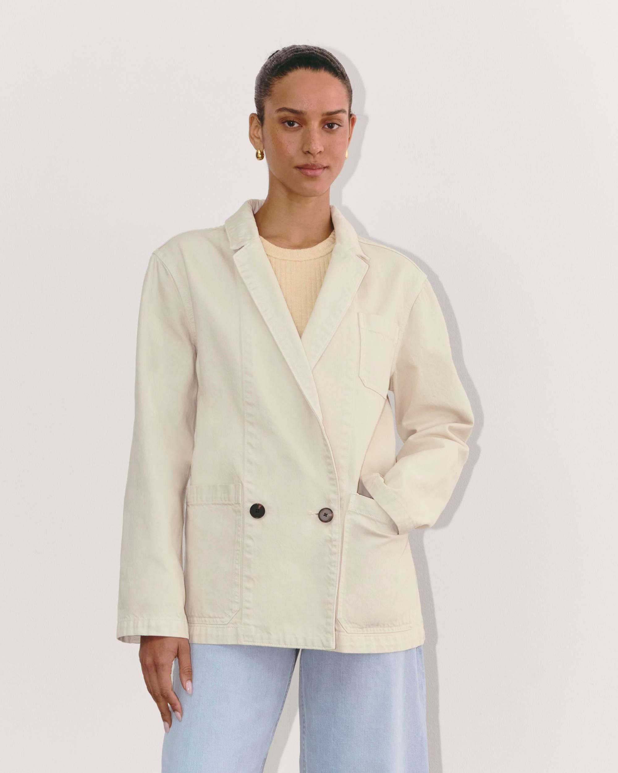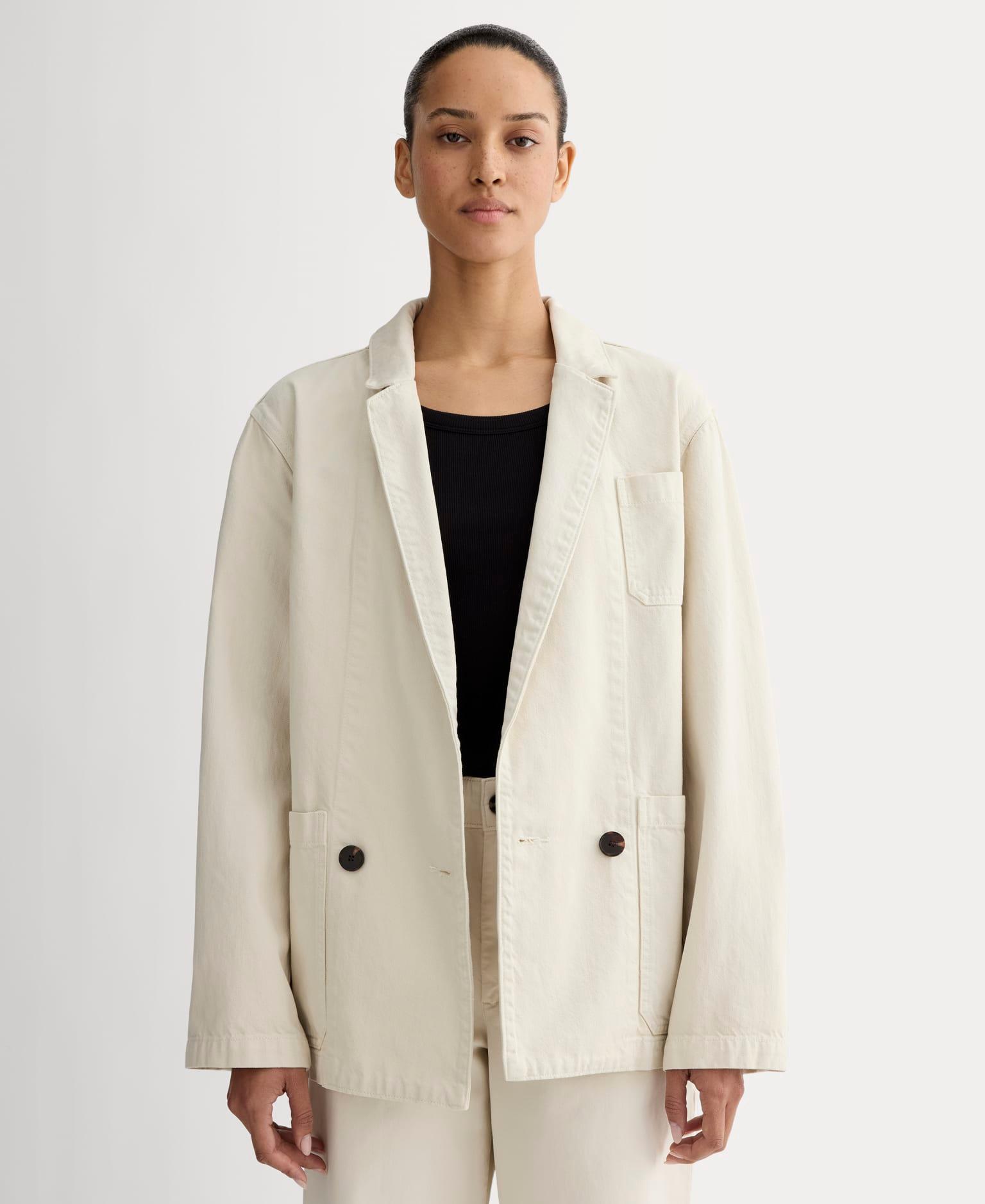 We reimagined our chore jacket with a modern twist. Featuring a notch collar and lapel, two patch pockets, a smaller breast patch pocket, and a double-breasted silhouette. Slip on this 100% organic cotton blazer for a casual look.