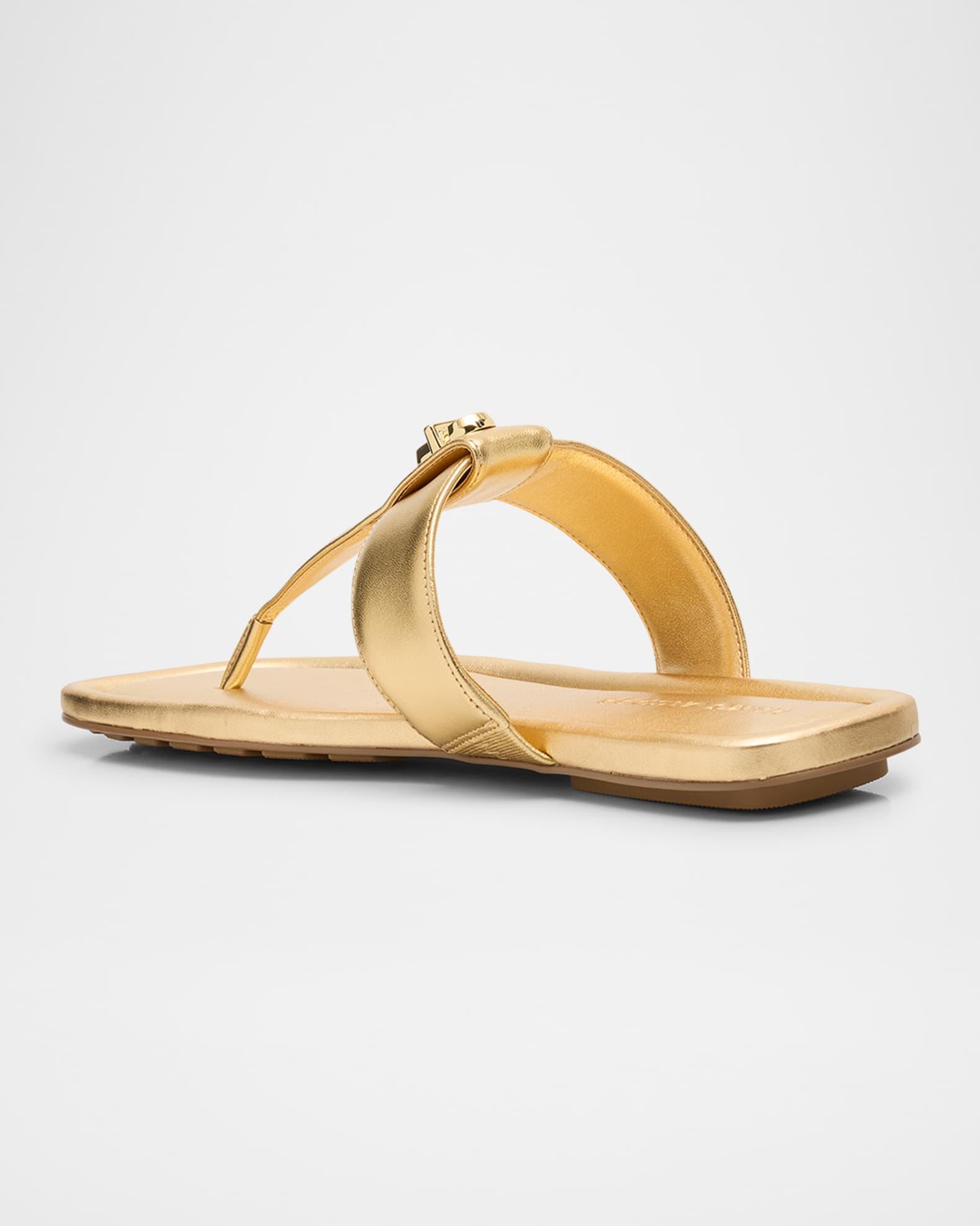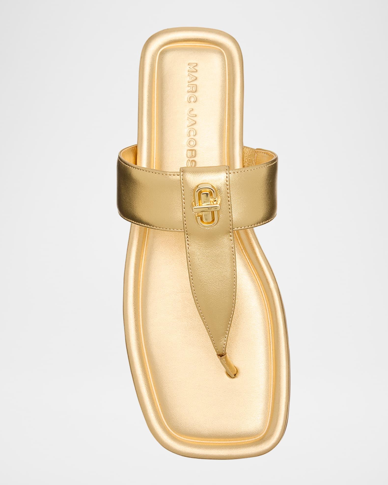 Marc Jacobs timelessly sophisticated and ultra-comfortable silhouette, these quintessential t-strap thong sandals elevate any warm-weather look. Expertly crafted in show-stopping metallic leather and branded with our signature turnlock hardware, these sandals effortlessly infuse luxury into the everyday. 0.17 in / 5 mm flat heel Thong strap Slide style Rubber outsole Lining: PU Spot clean Imported
