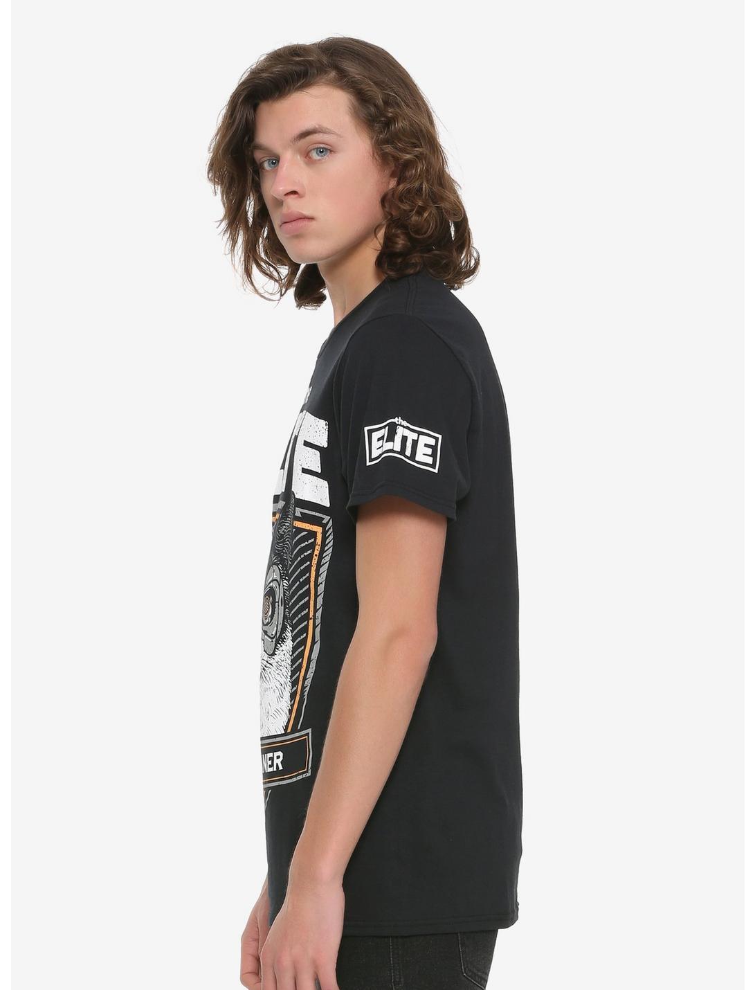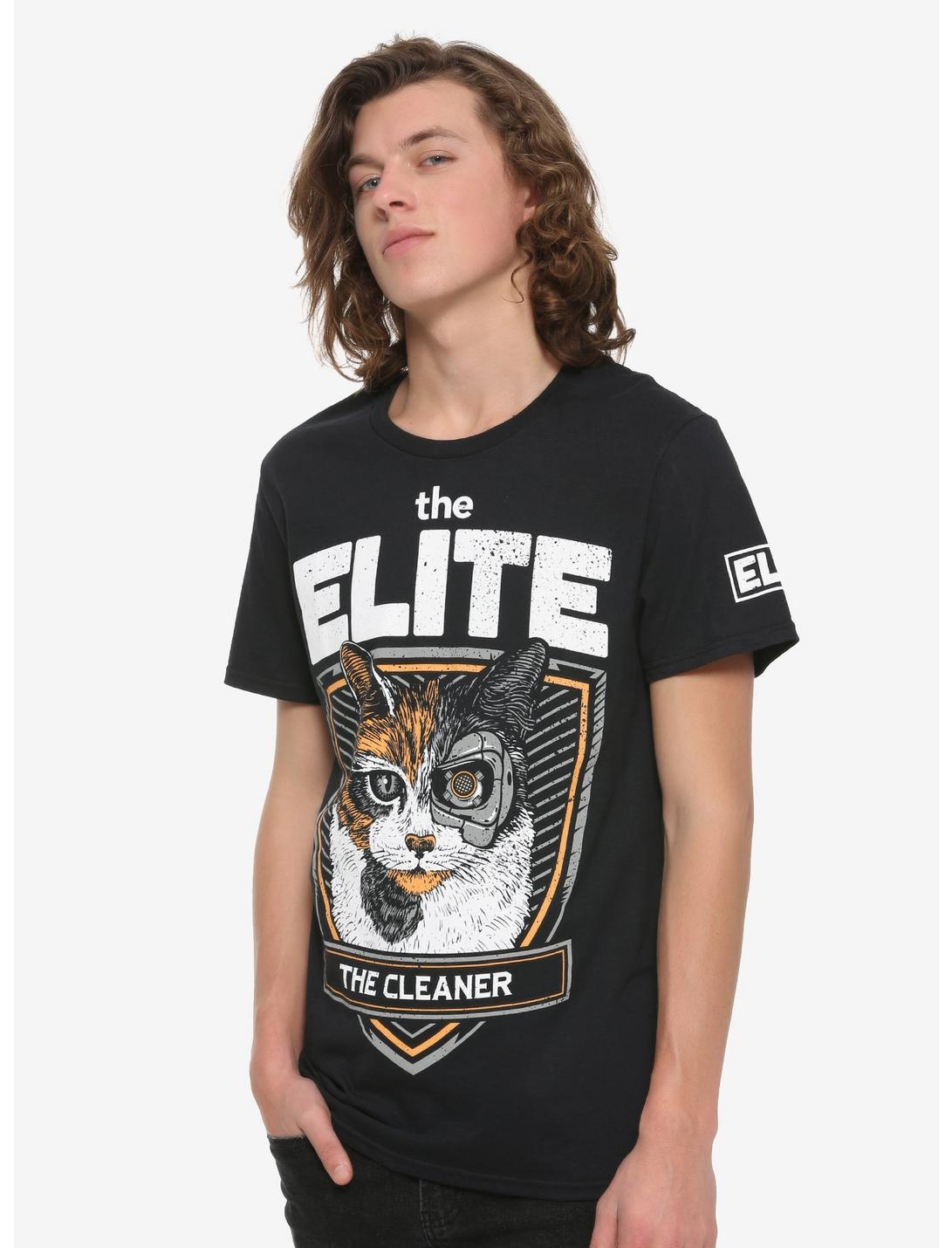 A black T-shirt from Pro Wrestling Tees reads "The Cleaner" below a cat graphic. "Elite" is printed on the sleeve.Only available at Hot Topic!100% cottonWash cold; dry lowImportedListed in men's sizes