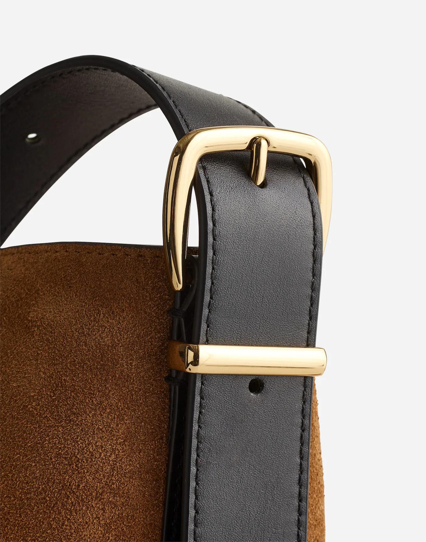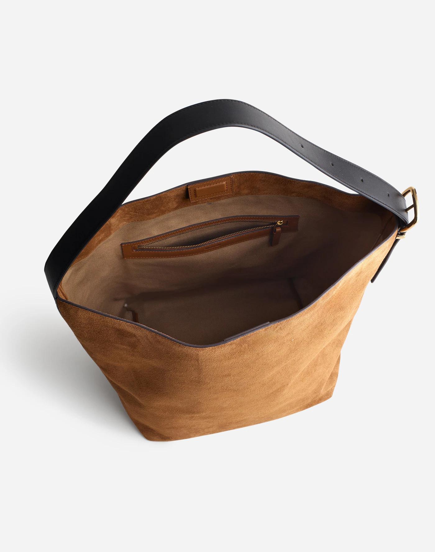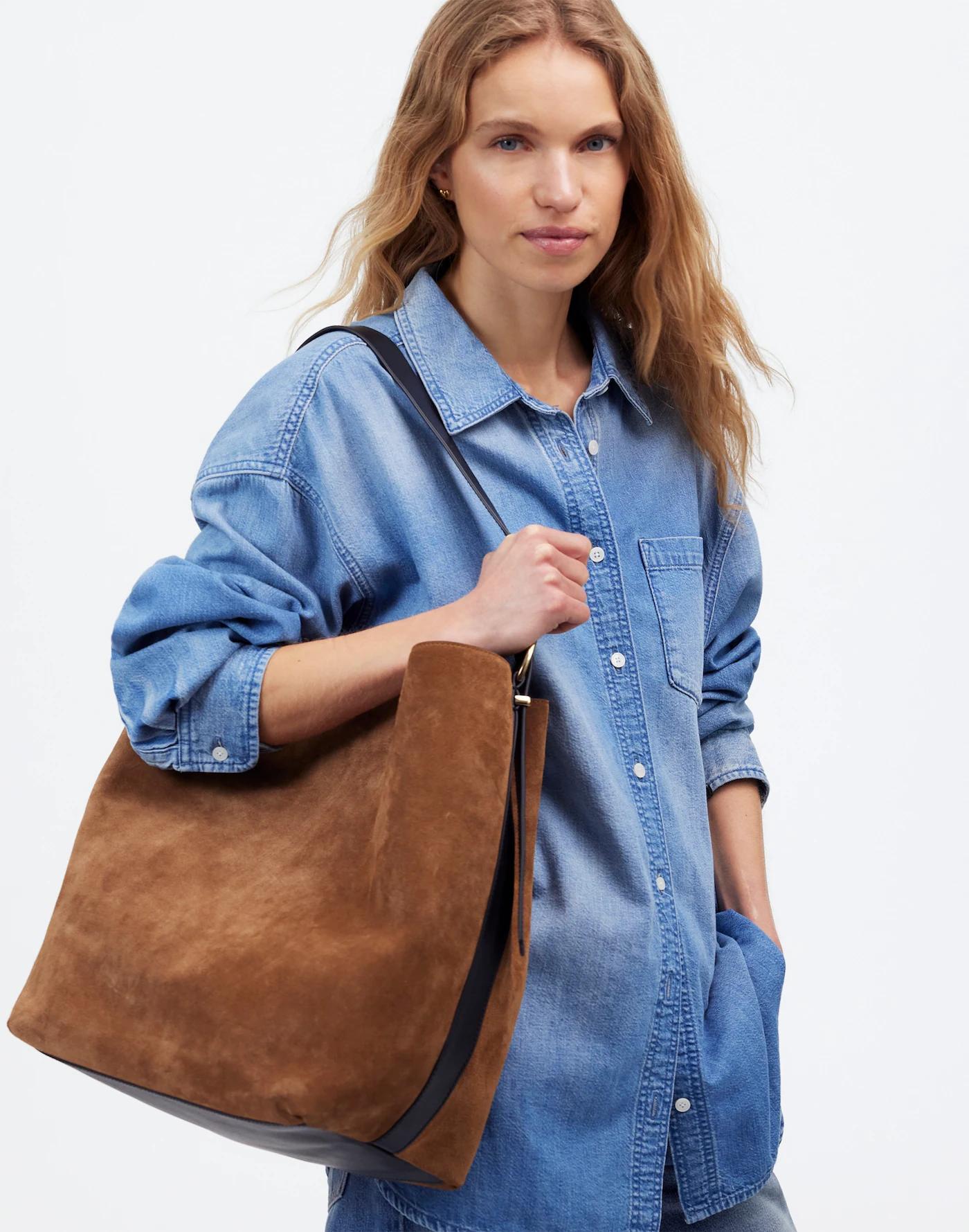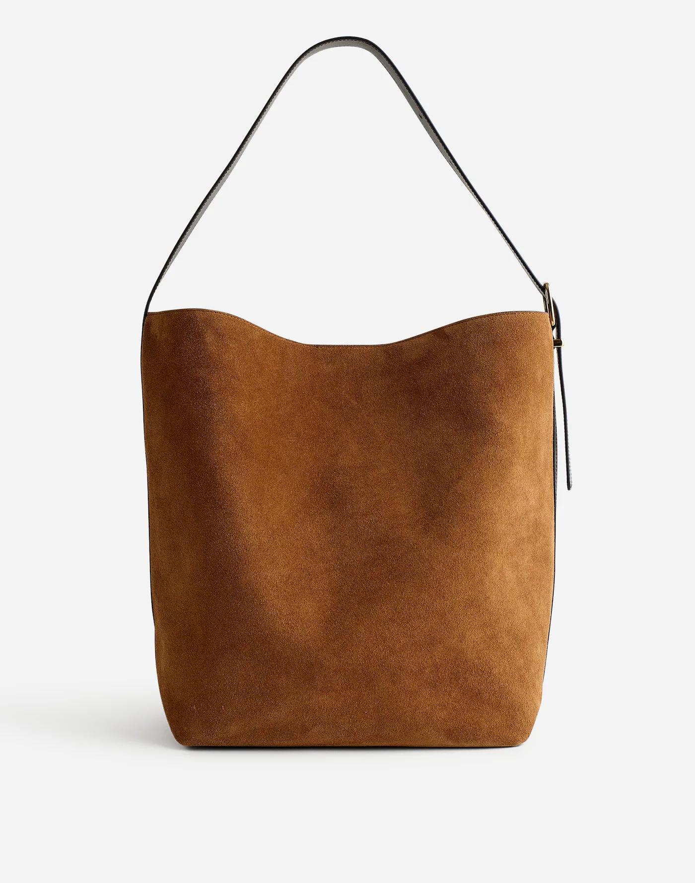 Our best-selling leather bag collection is cool, modern and quietly luxe. Now available in our largest size yet, this suede bucket tote features a magnetic closure, interior pocket and plenty of space to hold up to a 15" laptop, water bottle, phone, wallet, keys and more—plus, it has an adjustable shoulder strap. It's so good, it's Essential.