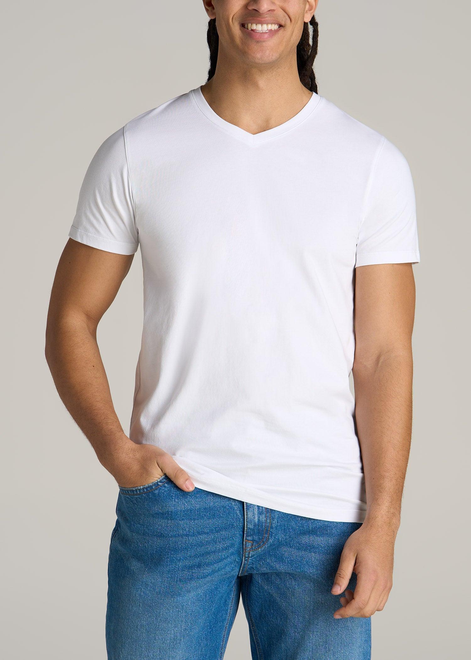 About Our Stretch Cotton V-Neck T-Shirt for Tall Men Searching for t-shirts for tall men can be difficult, with extra length often coming with extra width that you don’t need. That’s why we’ve designed this men’s tall v-neck t-shirt specifically for guys from 6’ to 7’1. It’s carefully tailored for your frame with added length and a slim, modern fit. Crafted from soft cotton, this short-sleeve tee is an essential building block in any wardrobe. The modern fit makes it perfect for layering while the clean finish looks polished on its own. We’ve added stretch to this men’s tall t-shirt for extra comfort and everyday flexibility. You'll want this basic in every color. SIZE & FIT: Modern fit V-neck Hip length Short sleeve Model is 6'4" wearing size M Tall Size M Tall: Body length: 31", Sleeve length: 16.5" FABRIC & CARE: 95% cotton, 5% spandex Stretch knit Pre-washed and shrinkage controlled Machine wash cold with like colors Do not bleach Tumble dry low Low heat iron