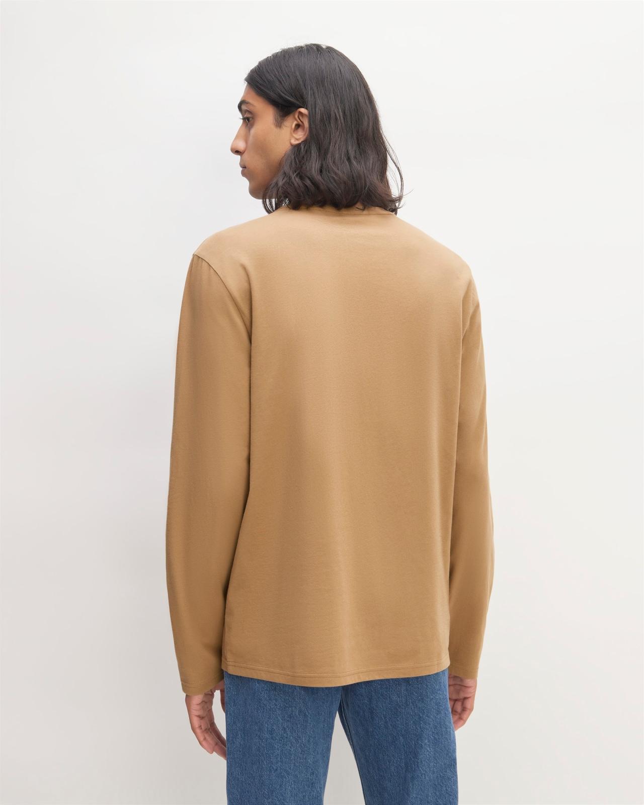 Soft sleeves. An iconic fit with clean lines and a classic crew neck now featuring long sleeves. The fabric is a mid-weight durable organic cotton that gets softer over time. Organic cotton uses crop rotation cover crops and organic fertilizers instead of toxic chemical fertilizers or pesticideswhich means cleaner water lower water usage lower pesticide use healthier soil and a safer working environment for cotton farmers compared to conventional cotton. Mens Essential Organic Long-Sleeve T-Shirt by Everlane in Light Brown, Size L