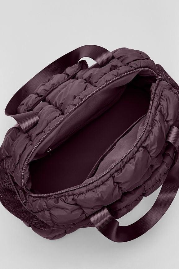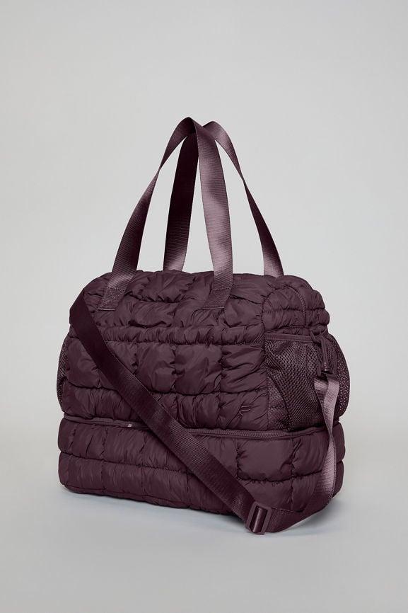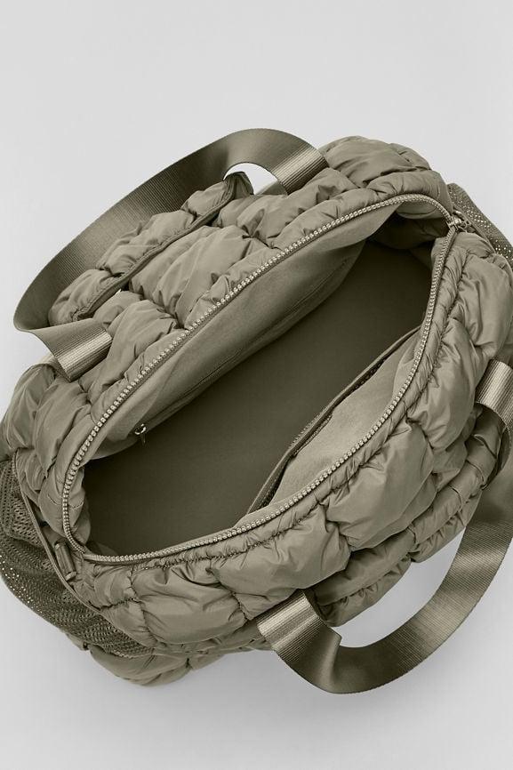 Quilted and durable for daily movement. The Essential Puff Gym Bag uses mildew resistant fabric to stay fresh through errands, commutes, and carry on travel. Soft, structured, and quietly refined, it packs easily and holds shape from locker to gate. Dimensions: 40cm x 21cm x 39.5cm; Volume: 34.5L. Shoe pocket Dimensions: 40.5cm x 21.5cm x 12.5cm; Volume: 11 L.