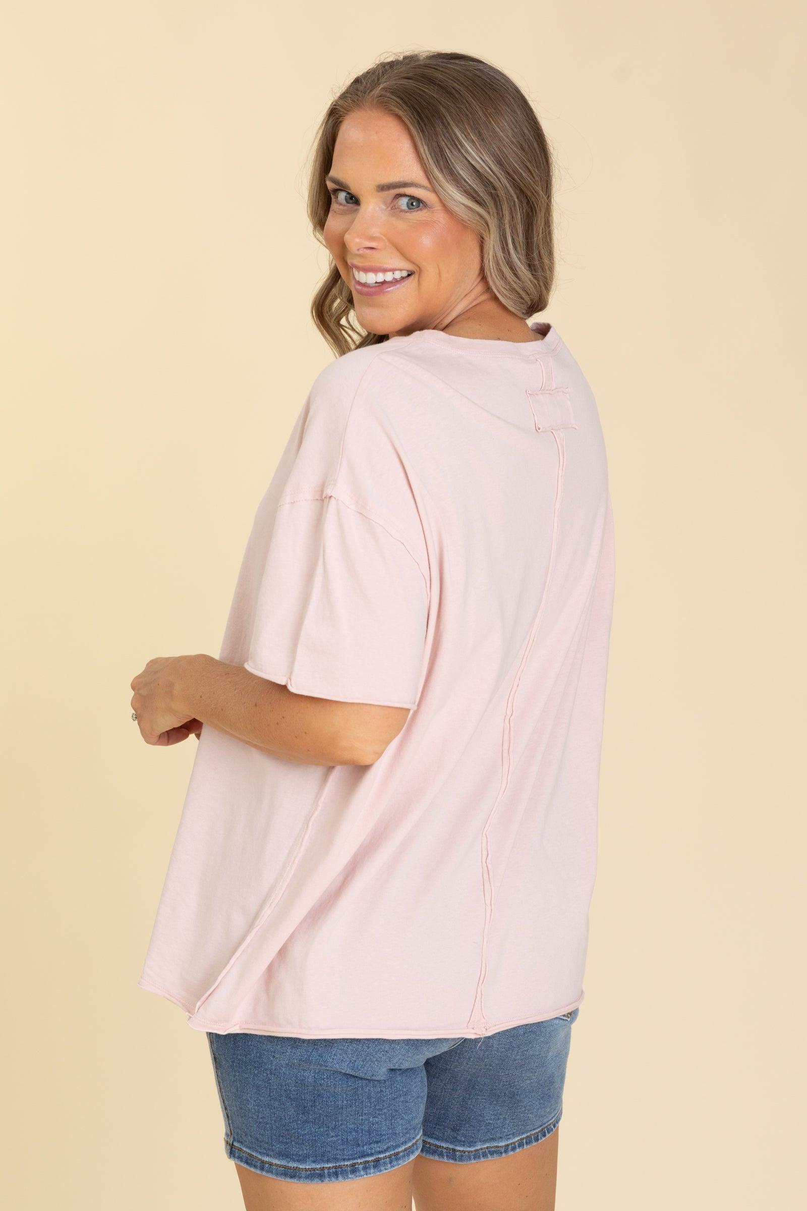 Product Details Colors: Black/ Denim/ Heather Grey/ Light Pink/ Mocha/ Orchard/ White Print: Solid Neckline: Round Sleeve: Short Sleeve Hemline: Straight/Raw Edge Other Details: These give the tee a slightly unfinished, edgy vibe, perfect for a modern look. Boxy, slightly oversized fit Brand: Yelete Material and Care 100% Cotton Hand Wash Cold Hang/Line Dry Size and Fit Small: Bust 48" Waist 48" Length 25.5" Medium: Bust 50" Waist 50" Length 26" Large: Bust 52" Waist 52" Length 26.5" X Large: Bust 54" Waist 54" Length 27" Erica is 5’7” and wearing her true size small