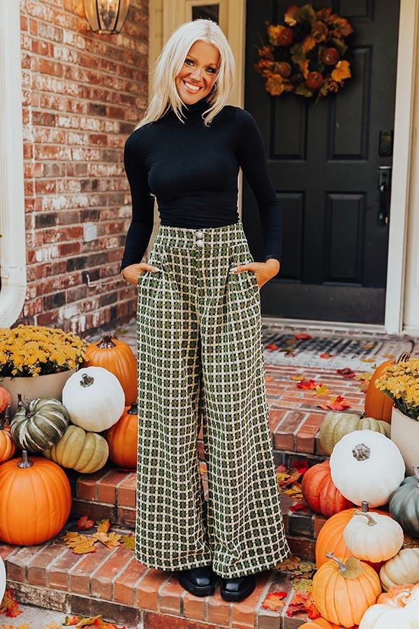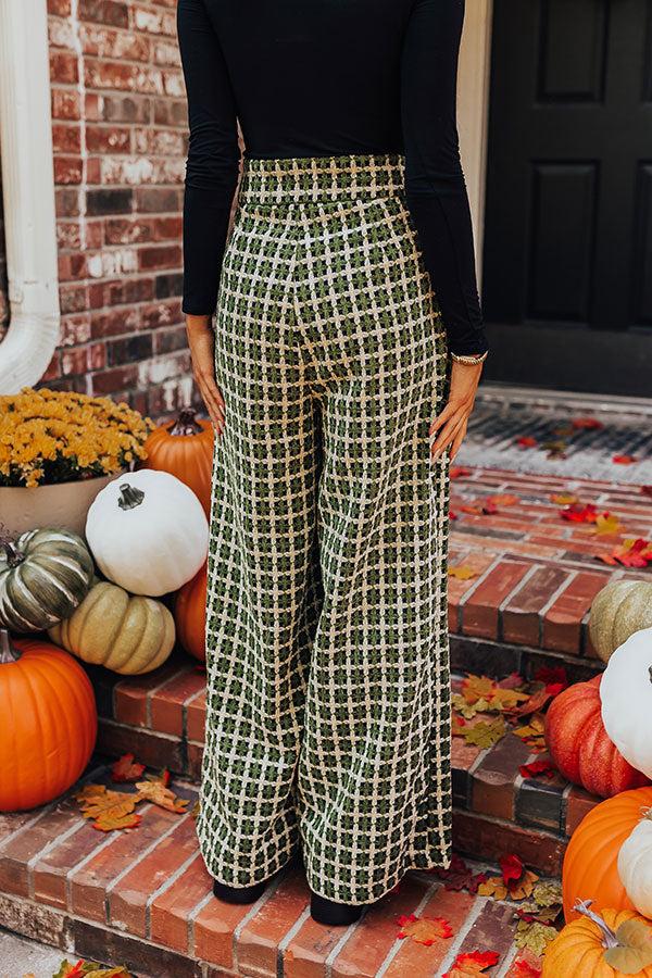 - These fabulous pants are pure style! With their chic chenille and faux pearl accents, they add a touch of sweet sophistication to your look. - Unlined material with a tweed woven chenille check design in cream and green hues - A hidden zip fly and double button closure featuring silver colored buttons with faux pearl embellishment - Functional side pockets - A wide leg silhouette that ends in straight hemlines