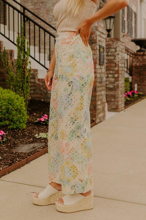 - These trendy wide leg pants are all about personality! The playful floral print paired with delicate eyelet details adds a cute twist to your everyday look. A standout piece that brings a little charm to your wardrobe. - Eyelet material with an abstract floral print featuring purple, orange, yellow, green, and blue hues - A built-in lining that ends above the knee - A waistline with an elastic back - A hidden zip fly and double button closure - Functional front pockets - A wide leg silhouette that ends in straight hemlines