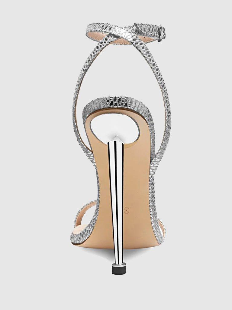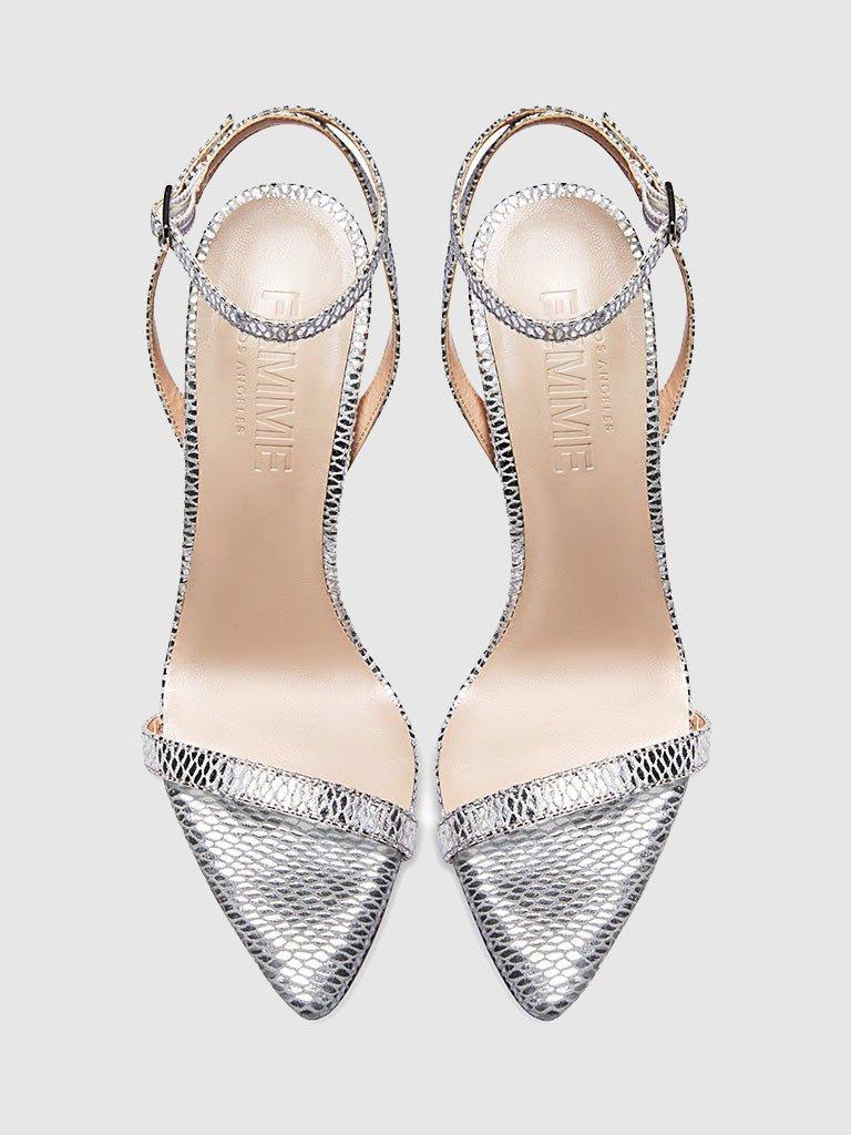 Ford Sandal: These sandals feature a striking and unique design that's perfect for adding a touch of sophistication to any outfit. Anchored by a cylinder spiked heel for a sculptural touch, the delicate strap detailing around the vamp adds an elegant and chic element to the design. The Ford Sandal is a must-have for any fashion-forward woman looking to elevate her style with a modern and stylish pair of sandals. Vegan upper Vegan Insole Vegan outsole Open-toe pointed heel Slip-on Handmade Designed in LA Coated stiletto heel, 4.48" (114mm)
