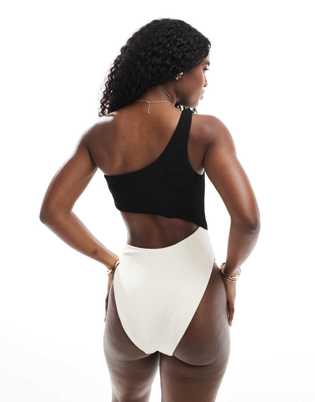 The Frolic exclusive one shoulder cut out swimsuit in black and cream color block
