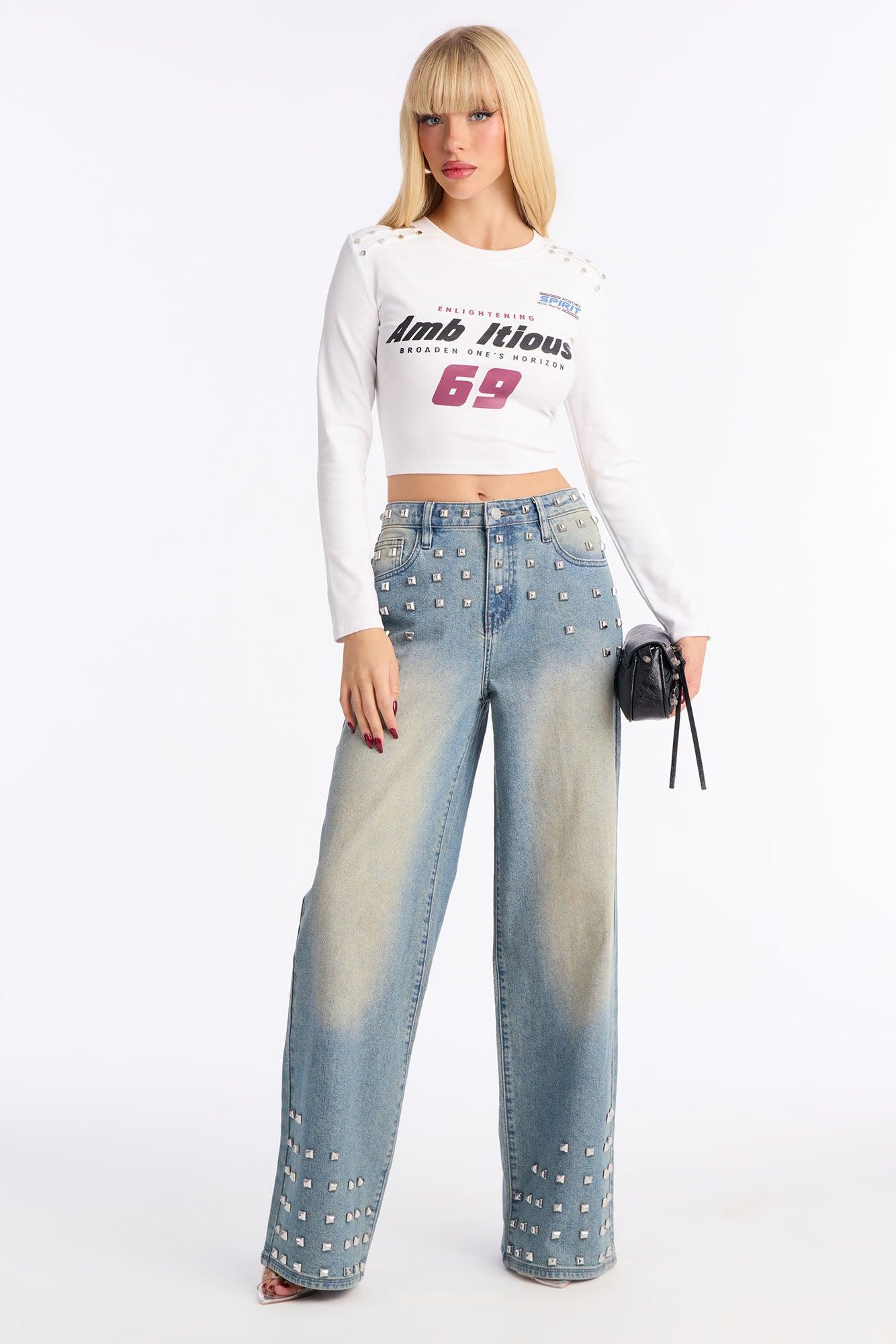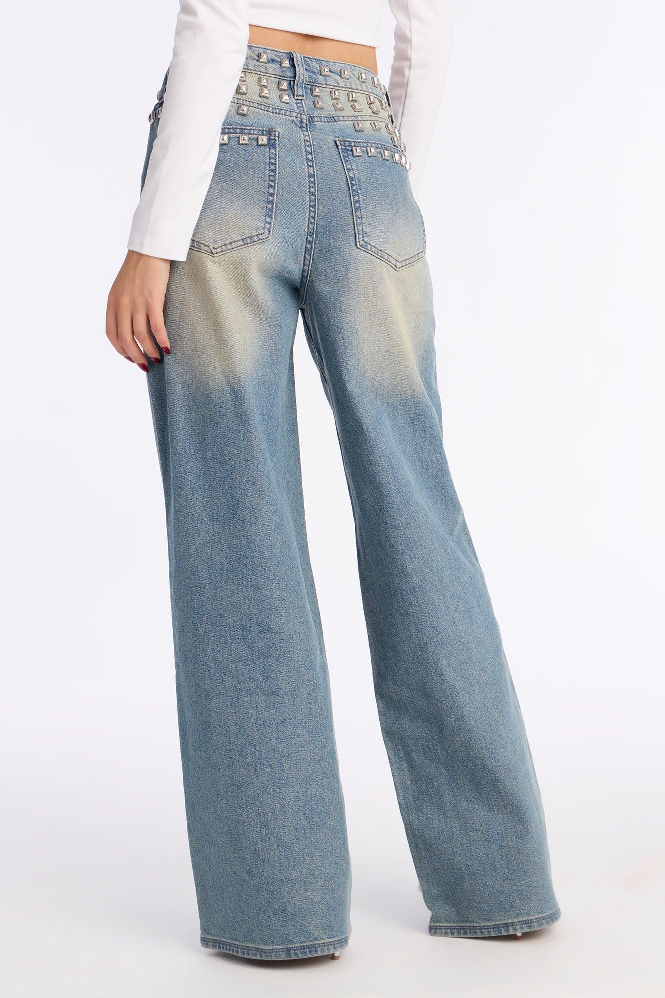 Available In Brown And Vintage Wash. Wide Leg Jean 5 Pocket Studded Tinted 11" Rise 33" Inseam Low Stretch Disclaimer: Due To The Specialized Wash Process, Each Garment Is Unique. Self: 99% Cotton 1% Spandex Imported California Proposition 65WARNING: Cancer and Reproductive Harm - www.P65Warnings.ca.gov.