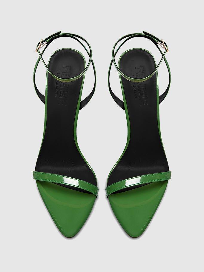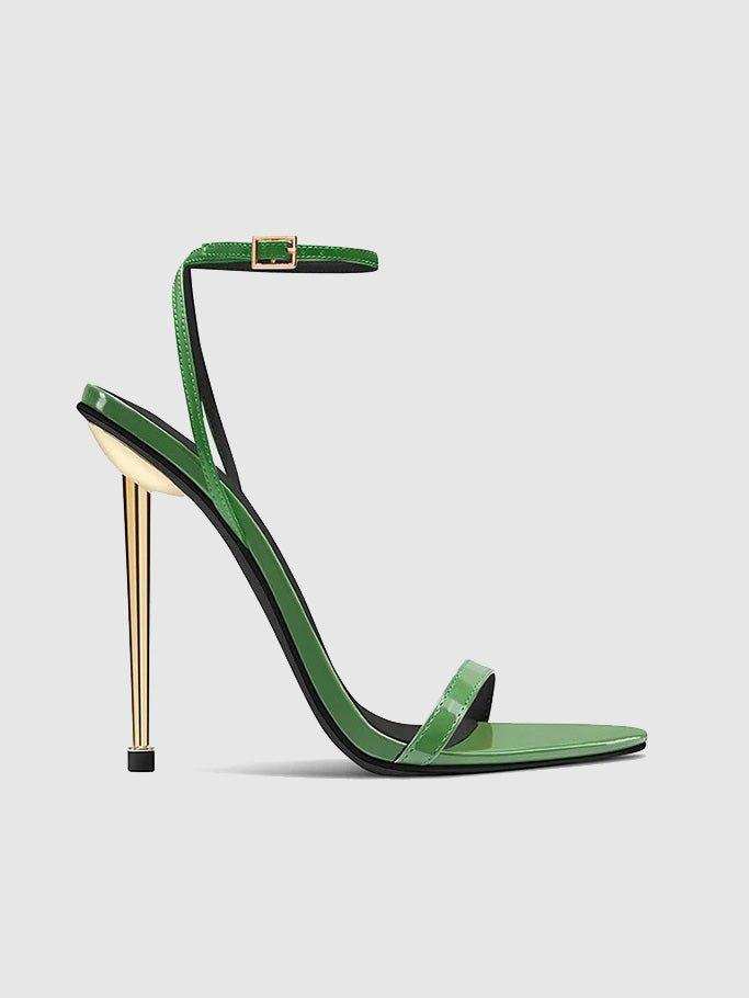 Ford Sandal: These sandals feature a striking and unique design that's perfect for adding a touch of sophistication to any outfit. Anchored by a cylinder spiked heel for a sculptural touch, the delicate strap detailing around the vamp adds an elegant and chic element to the design. The Ford Sandal is a must-have for any fashion-forward woman looking to elevate her style with a modern and stylish pair of sandals.Vegan upperVegan InsoleVegan outsoleOpen-toe pointed heelSlip-on HandmadeDesigned in LACoated stiletto heel, 4.48" (114mm)