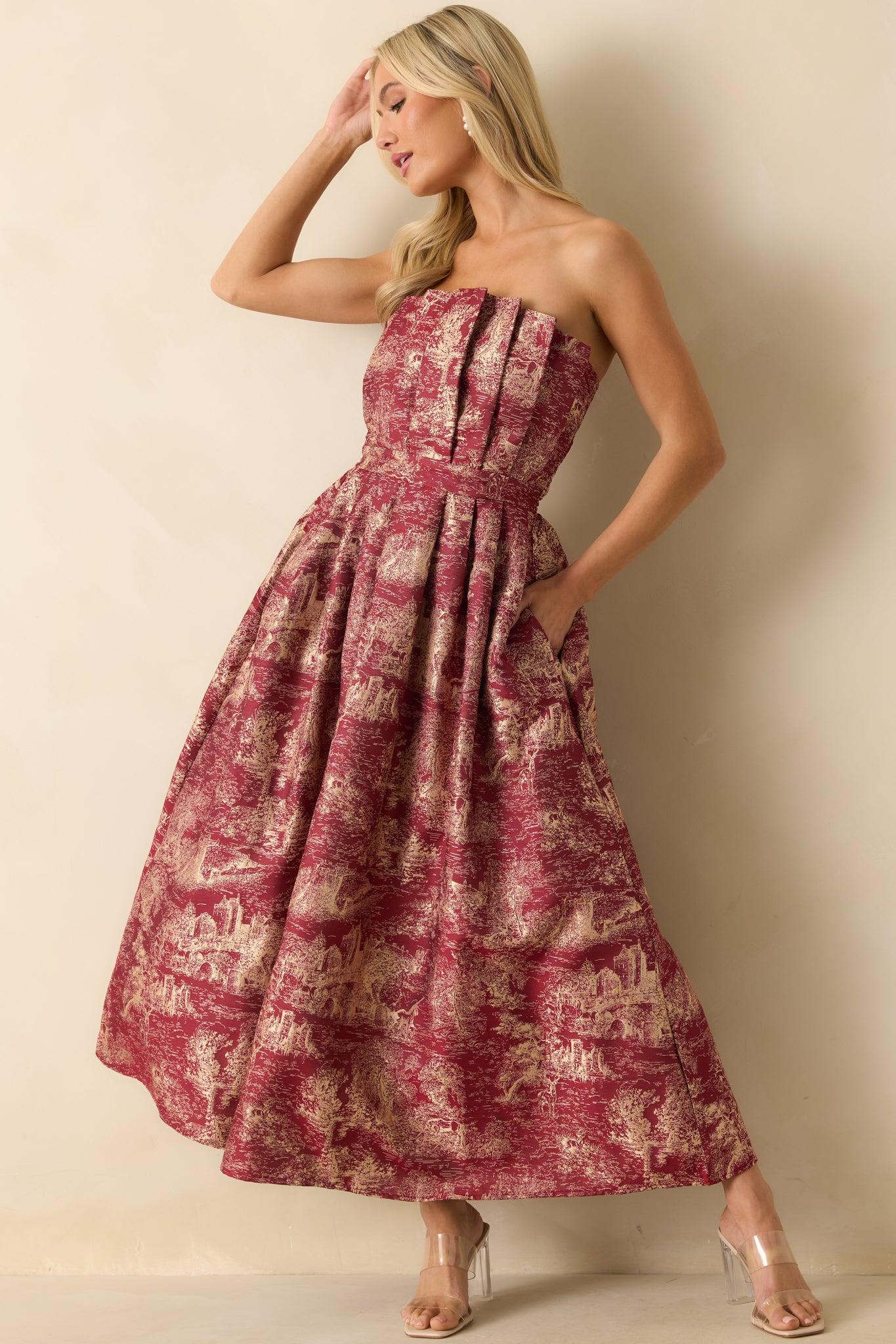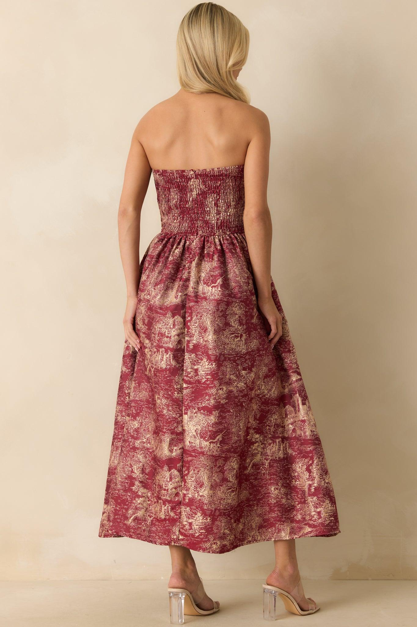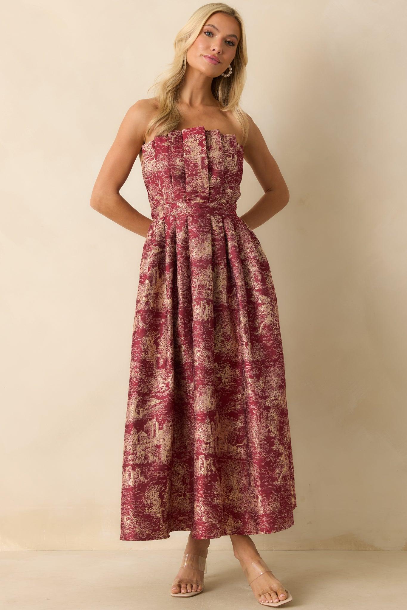 Step into a story all your own in the The Genevieve Burgundy Storybook Toile Jacquard Strapless Midi Dress. Woven with ivory jacquard castles and unicorns across a burgundy red base, this strapless silhouette feels timeless yet otherworldly. The structured pleated bodice and full midi skirt create a sculptural shape that’s both regal and romantic — a modern-day fairytale made to be seen. This burgundy strapless midi dress features an ivory jacquard pattern with castle and unicorn motifs, a pleated structured bodice, and a voluminous A-line skirt. Finished with a hidden back zipper and full lining. 100% Polyester Lined: 100% Polyester Hand Wash Cold Manufactured in China Designed in The USA Model is 5'8" and Wearing a Size Small, Clipped, Model is a True X-Small