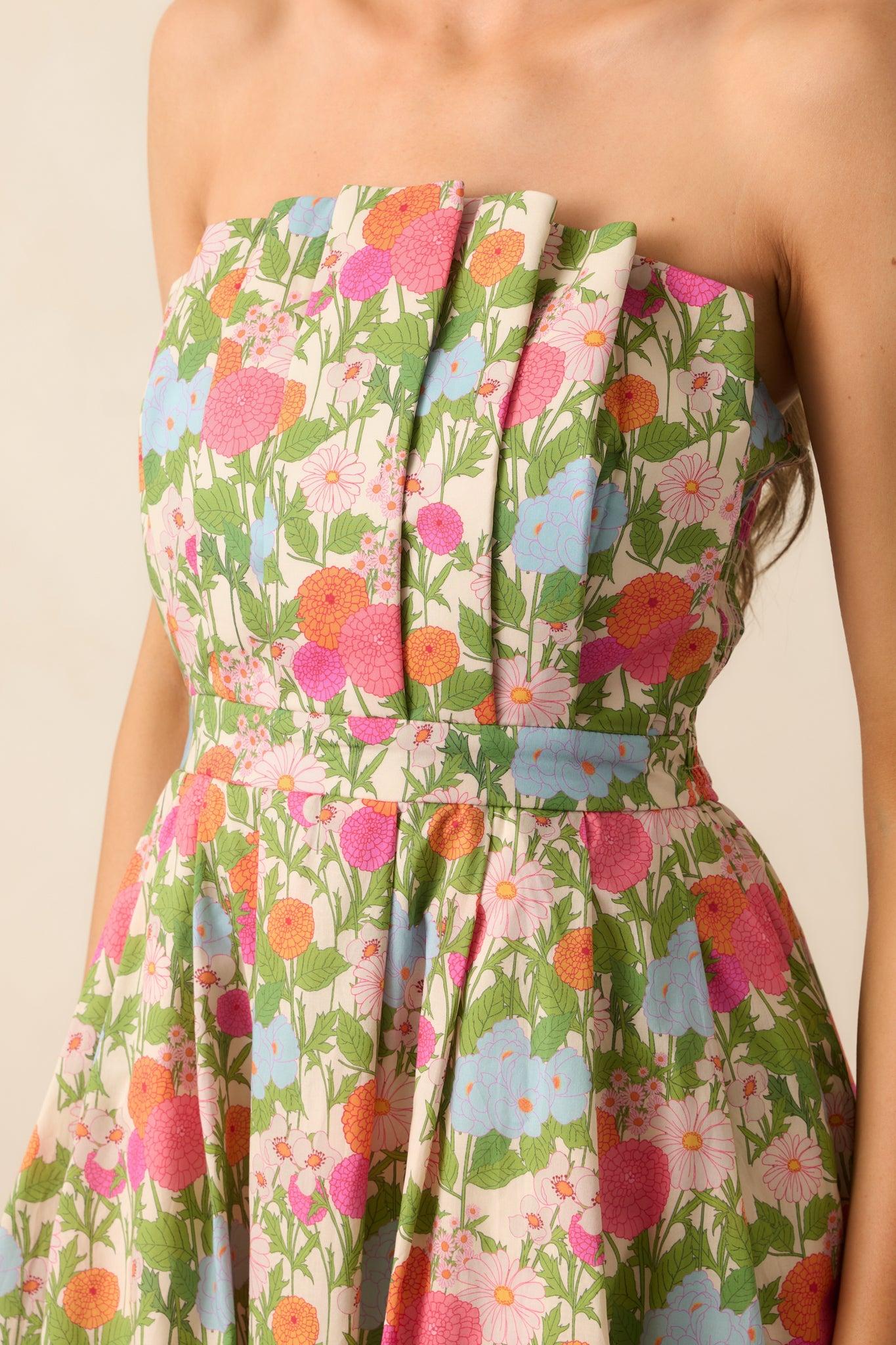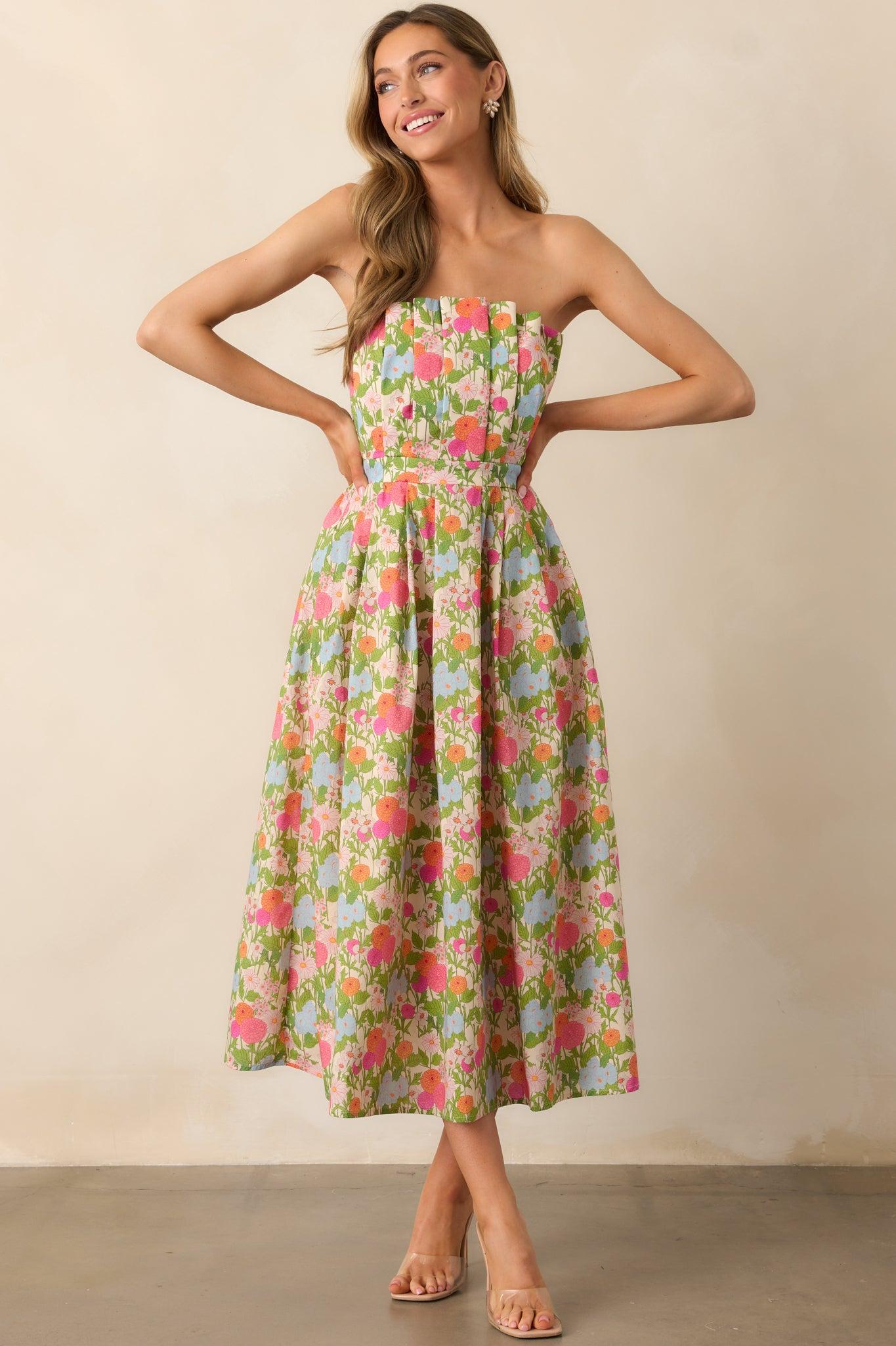 The Genevieve Green Multi Floral Cotton Strapless Midi Dress features a stunning floral design and a comfortable strapless neckline. Let our best selling silhouette embrace you as you dance the night away, feeling confident and stylish. This green dress features a multicolor floral print, pleated bodice, pleated skirt, functional hip pockets, a smocked back panel, a discrete back zipper, and a strapless design.