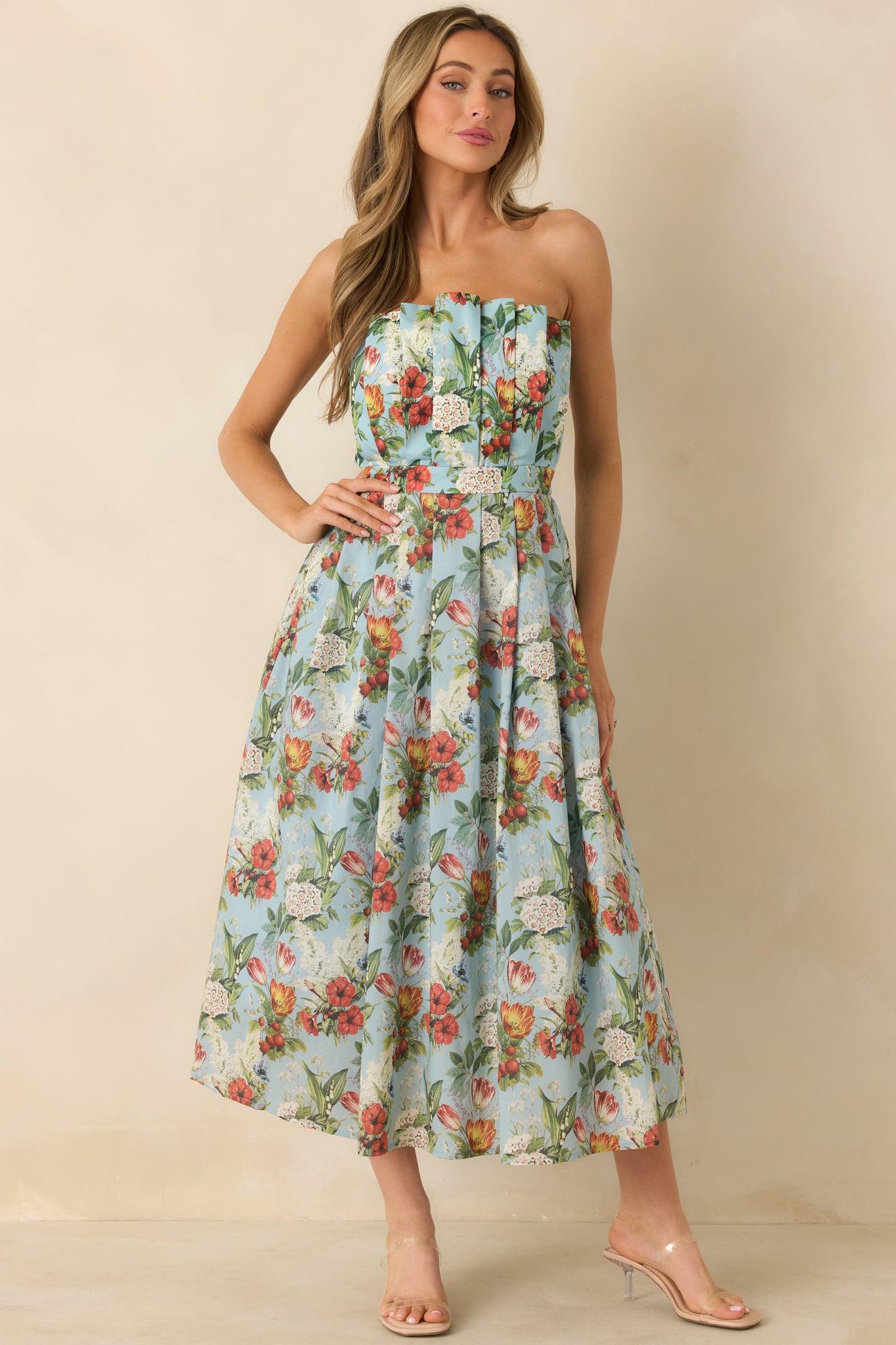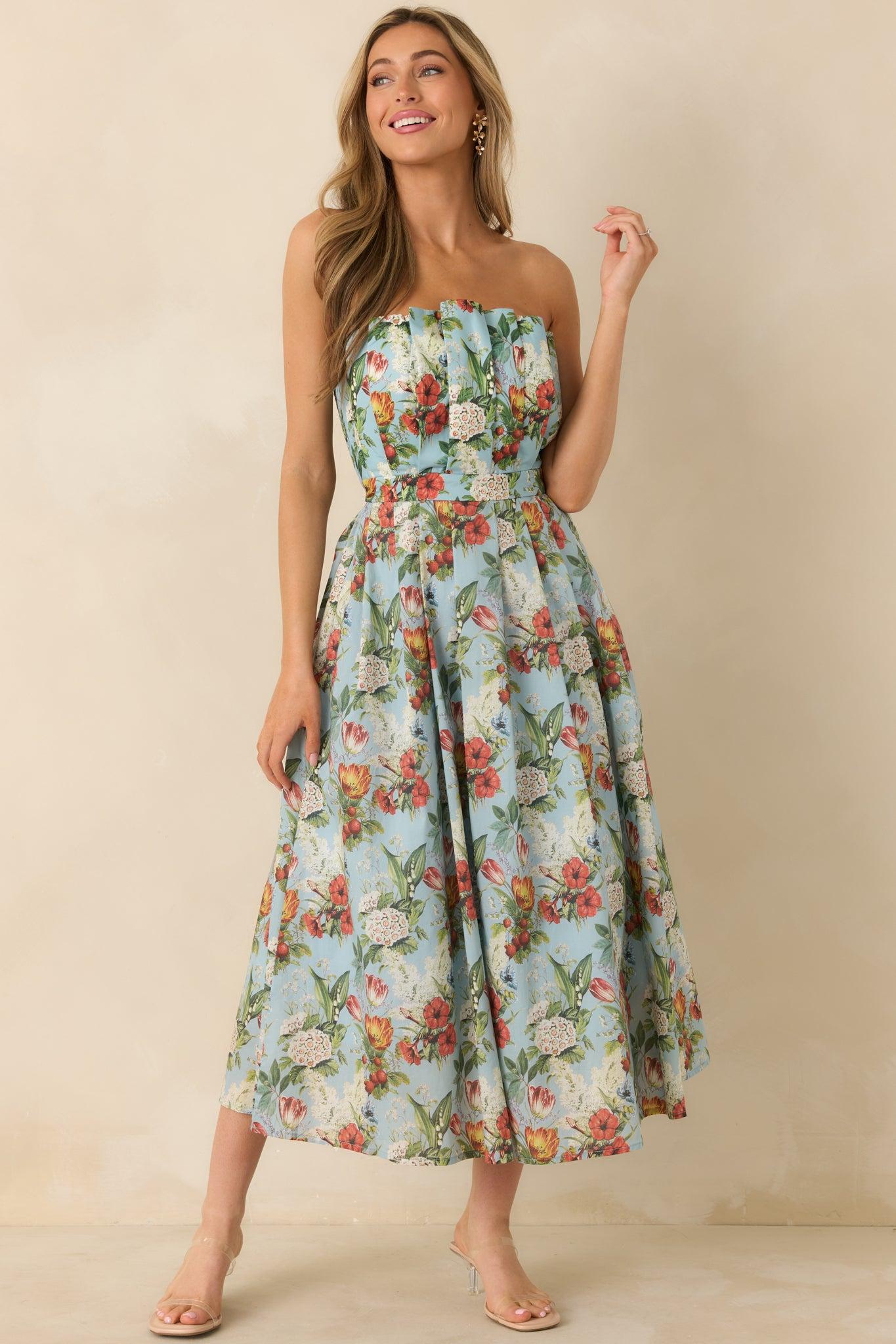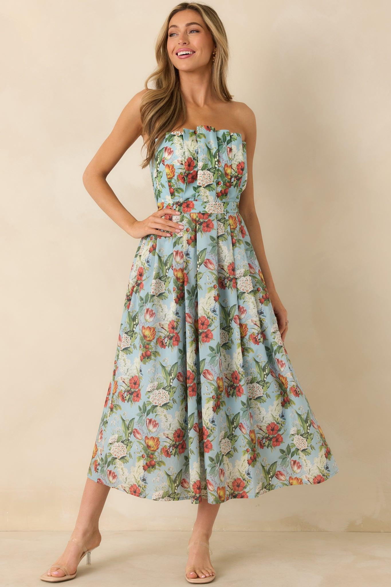 The Genevieve Sky Blue Multi Vintage Floral Print Cotton Strapless Maxi Dress features a stunning floral design and a comfortable strapless neckline. Let our best selling silhouette embrace you as you dance the night away, feeling confident and stylish. This blue dress features a multicolor floral print, pleated bodice, pleated skirt, functional hip pockets, a smocked back panel, a discrete back zipper, and a strapless design. 100% Cotton Lining: 80% Polyester & 20% Cotton Hand Wash ColdManufactured in ChinaDesigned in The USAModel is 5'8" and Wearing a Size Small, Clipped, Model is a True X-Small