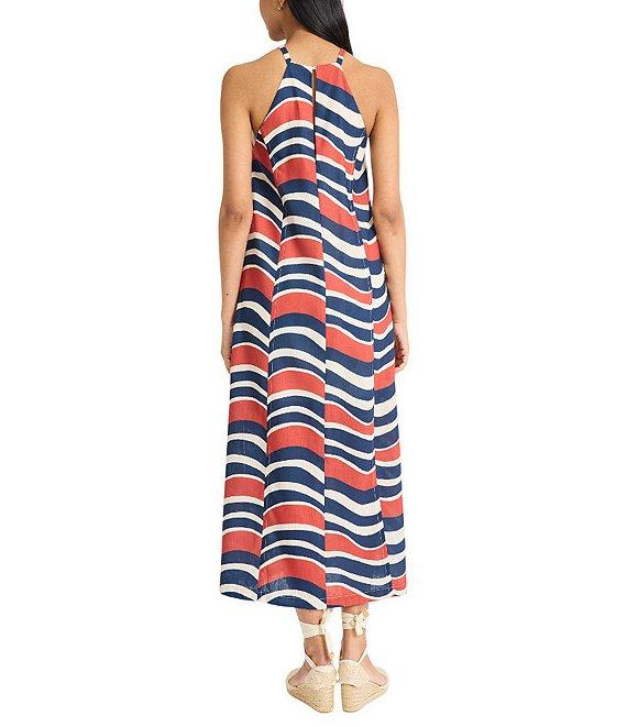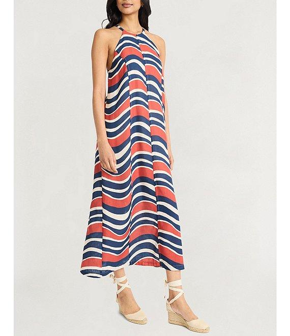 From The Good Journey, this dress features:Balboa linen fabricationCaftan silhouetteBold stripe print Halter neckline SleevelessFlowy fit Fully lined Straight hemline Center back zip closure Approx. 51" lengthPolyester Dry cleanImported.