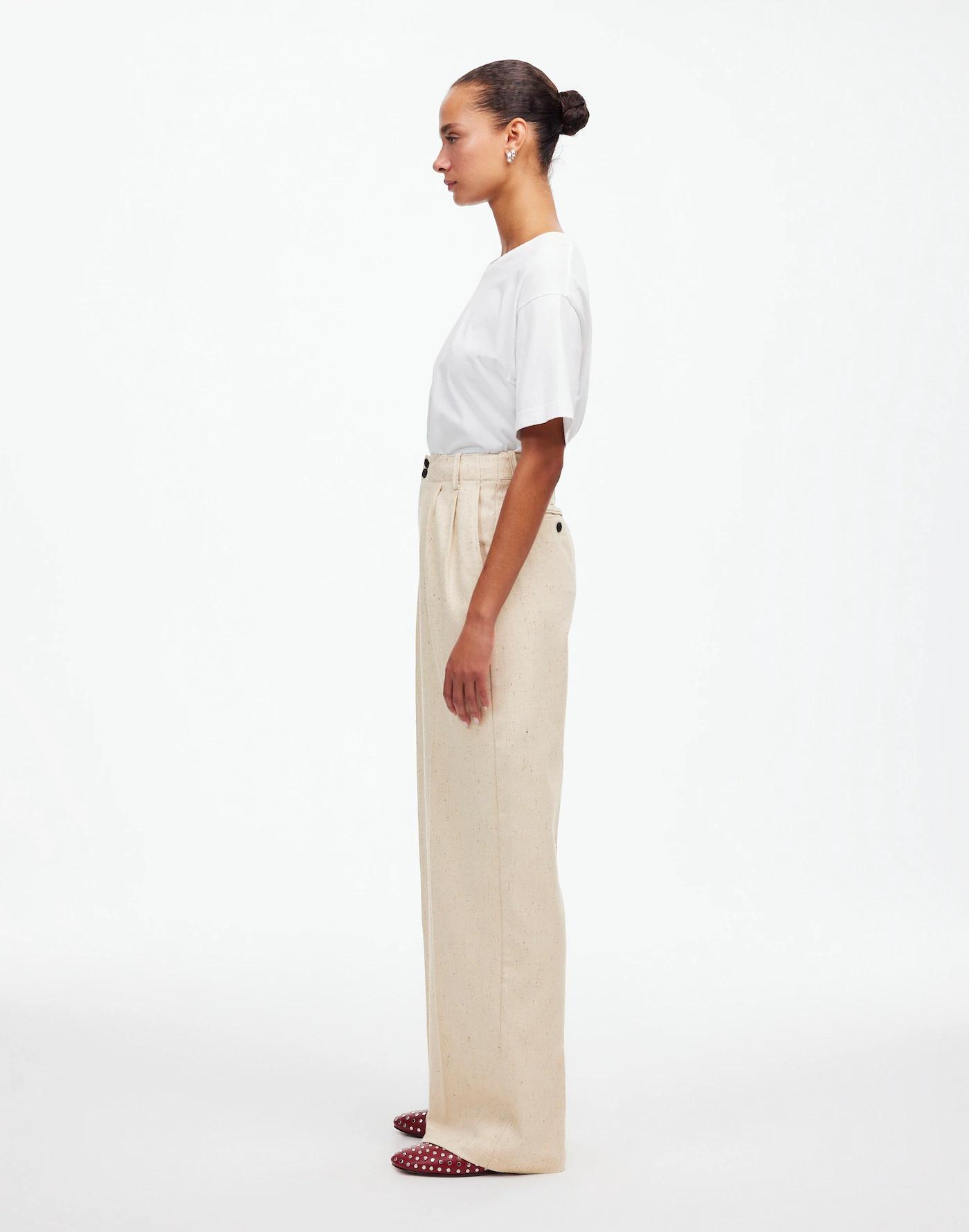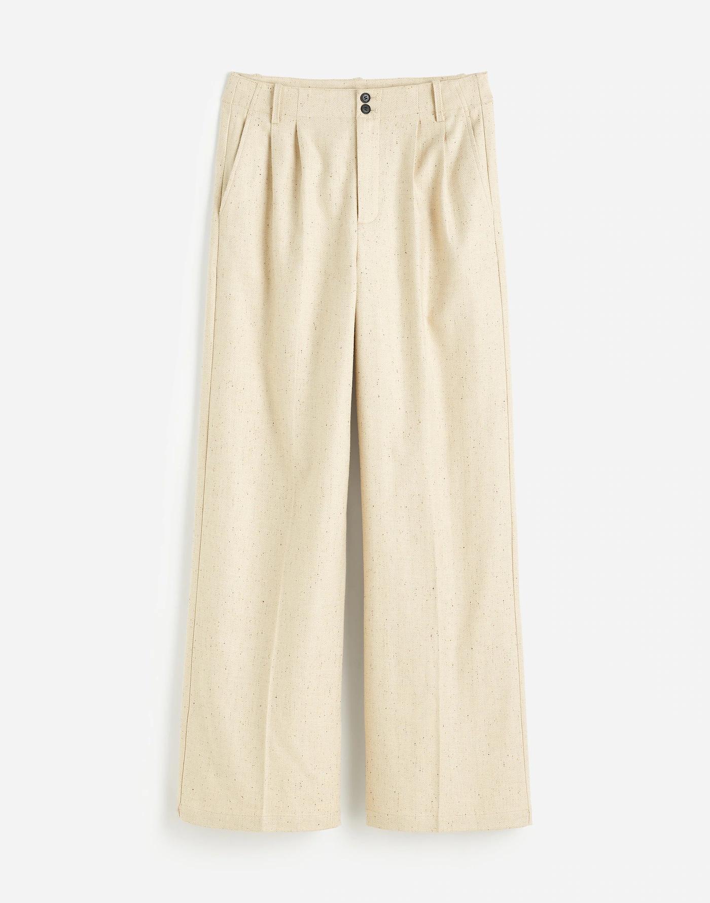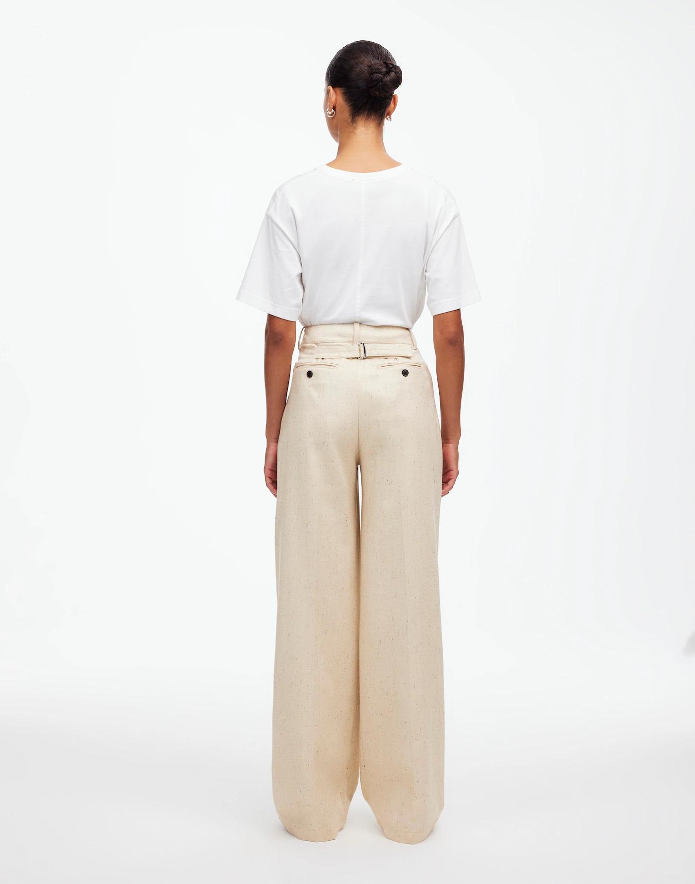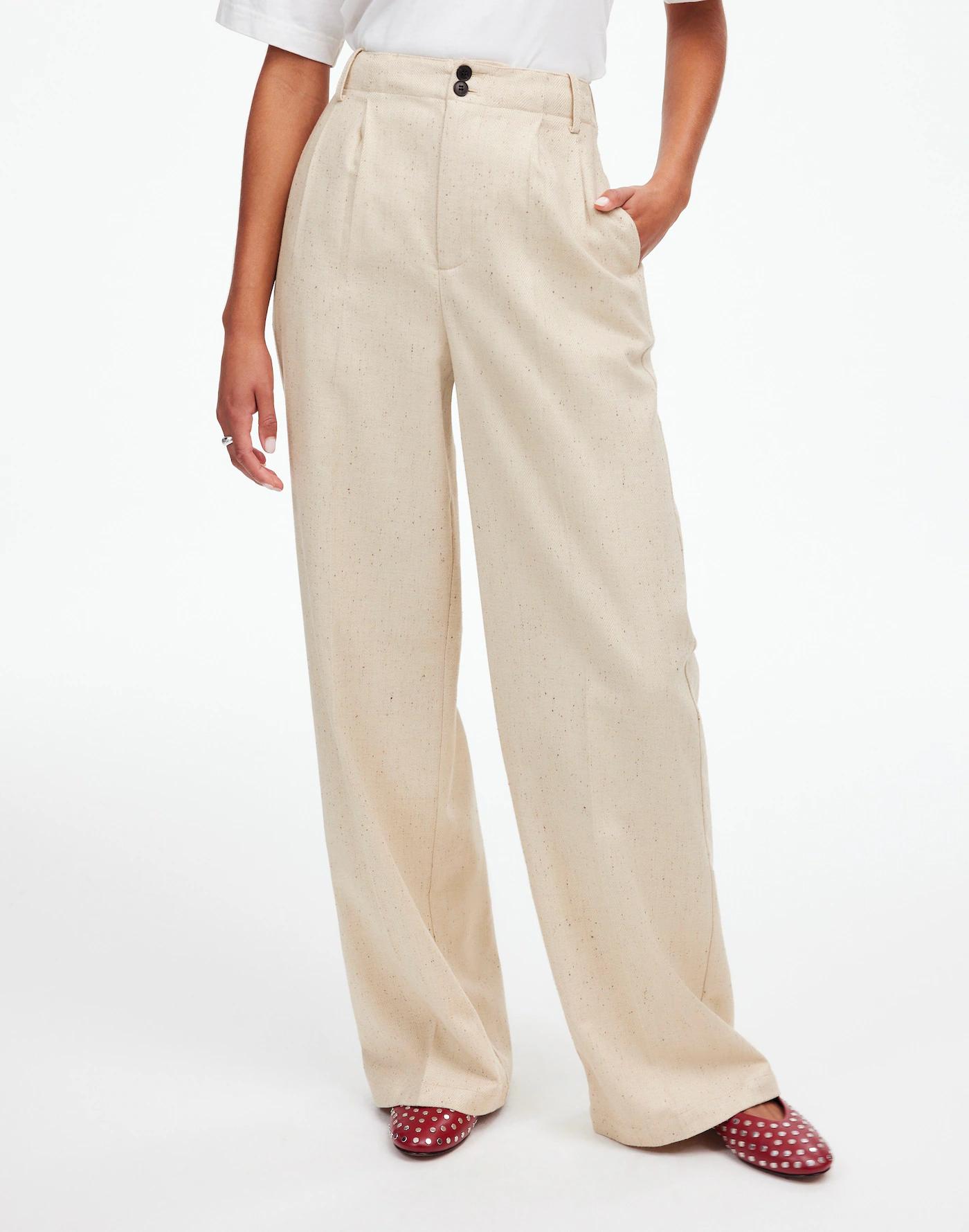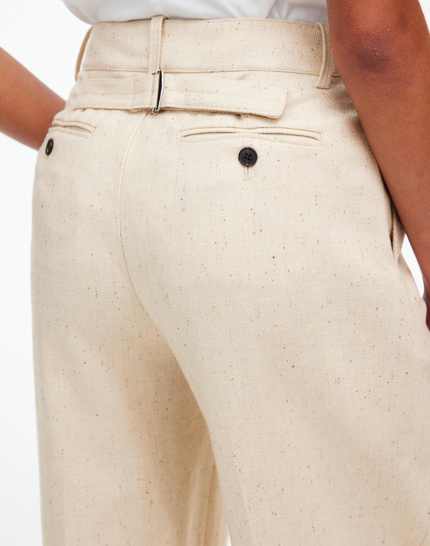 Our true best seller, these pants have a flattering high rise, slimmer wide legs with defined pleats, clean front and adjustable back slider tab for a cinched look. Coming in a luxe herringbone Italian suiting fabric, they are the quintessential wardrobe staple you can dress up or down with ease.