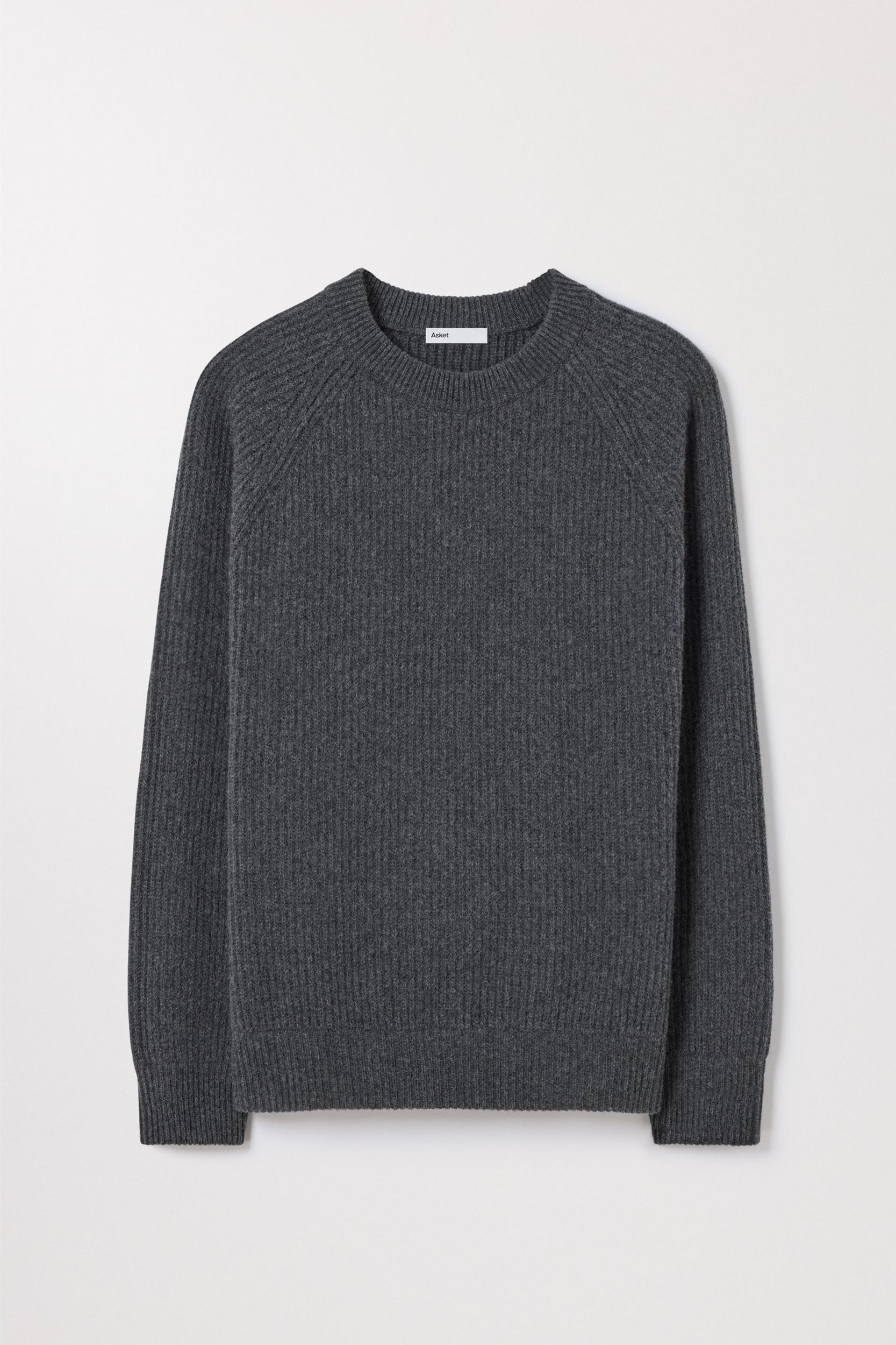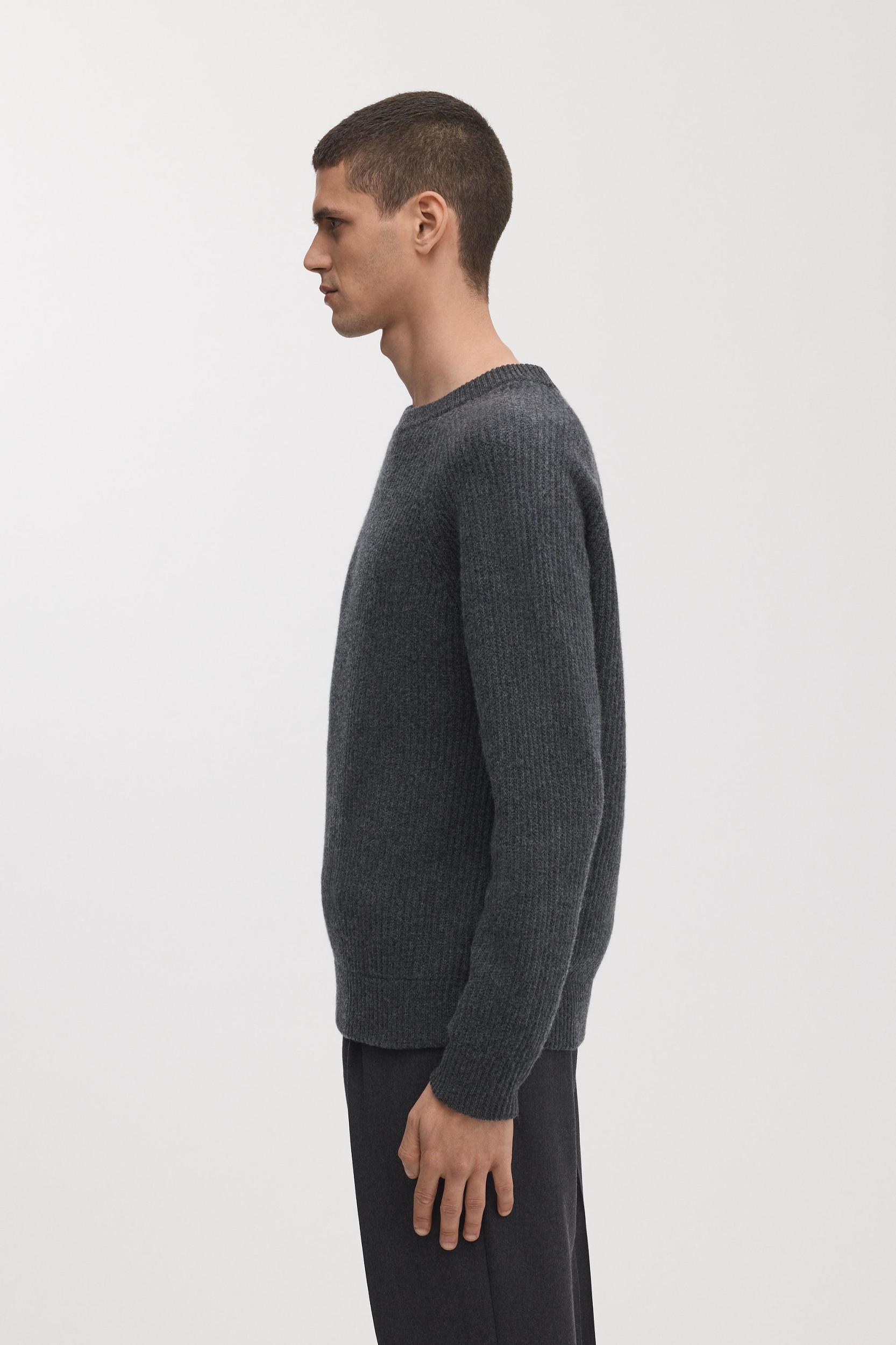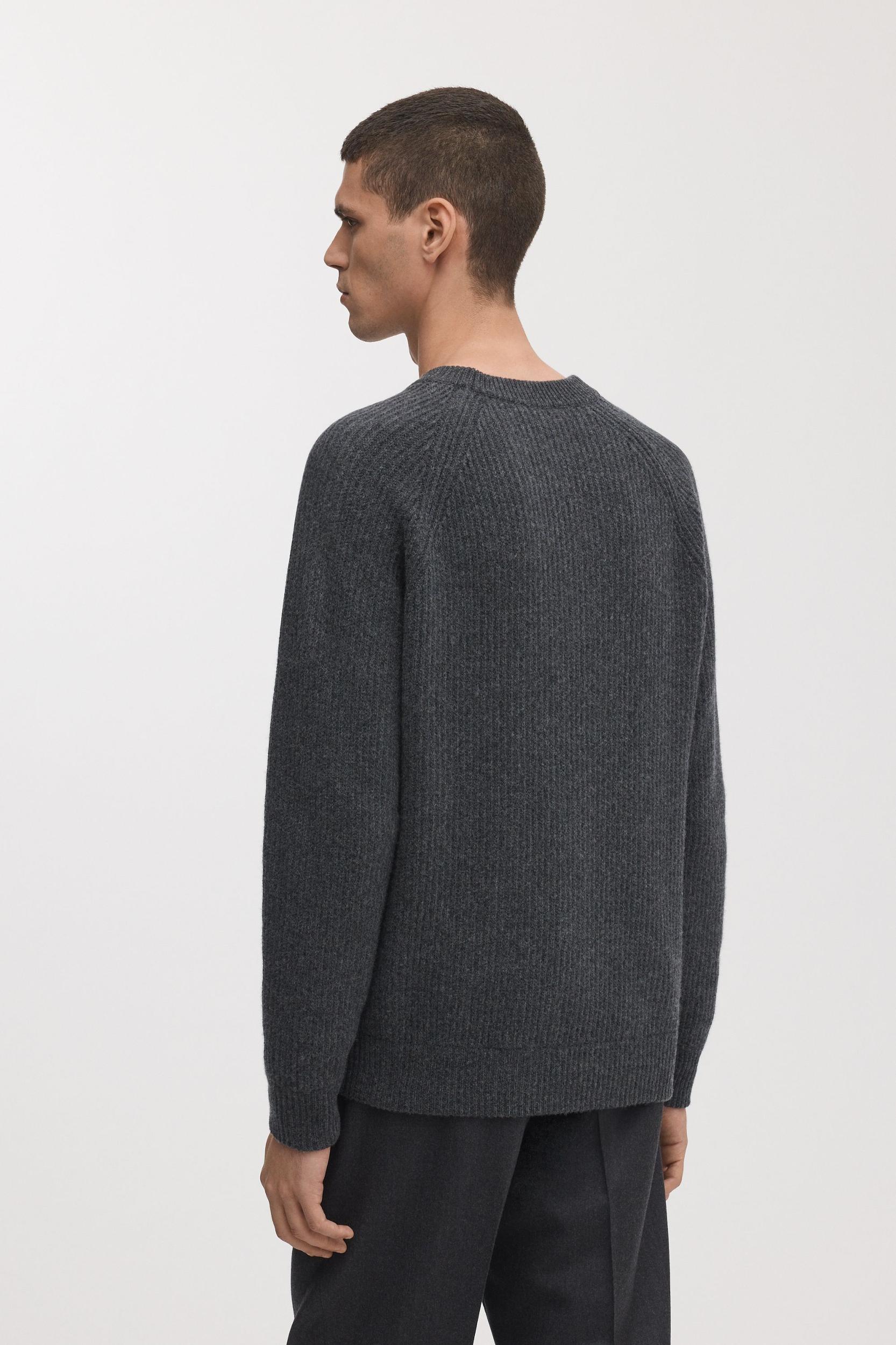 The Heavy Wool Sweater in Charcoal Melange: A chunky knit from 100% recycled wool with a straight fit and raglan shoulder, balancing simplicity with a cosy ruggedness.