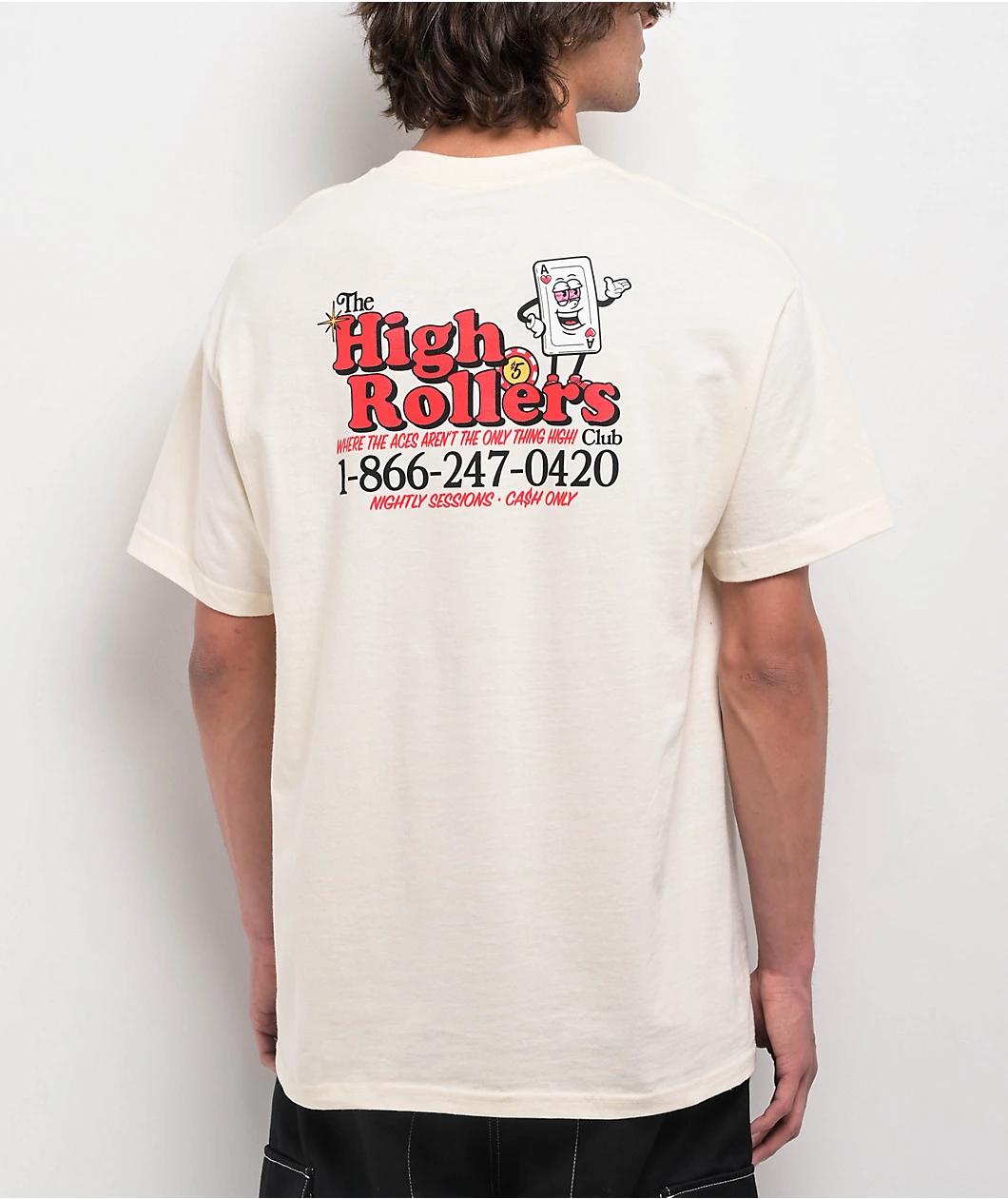 Inspired by weed, hip-hop and skateboarding, The High & Mighty welcomes the High Rollers t-shirt in a natural beige tone with printed graphics on the left chest and back for a casual look. Mimicking a gambling club motif with a 420-friendly innuendo,