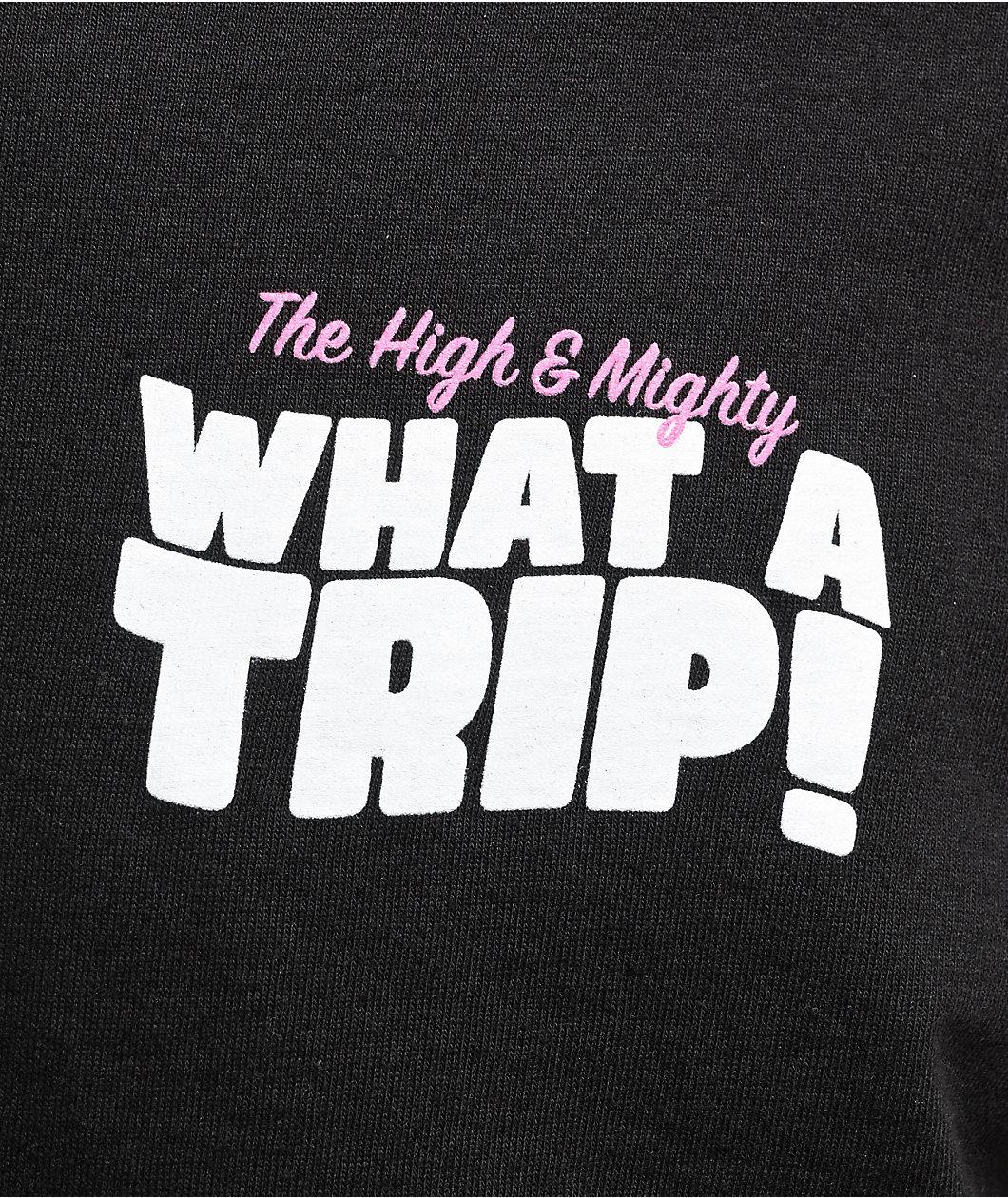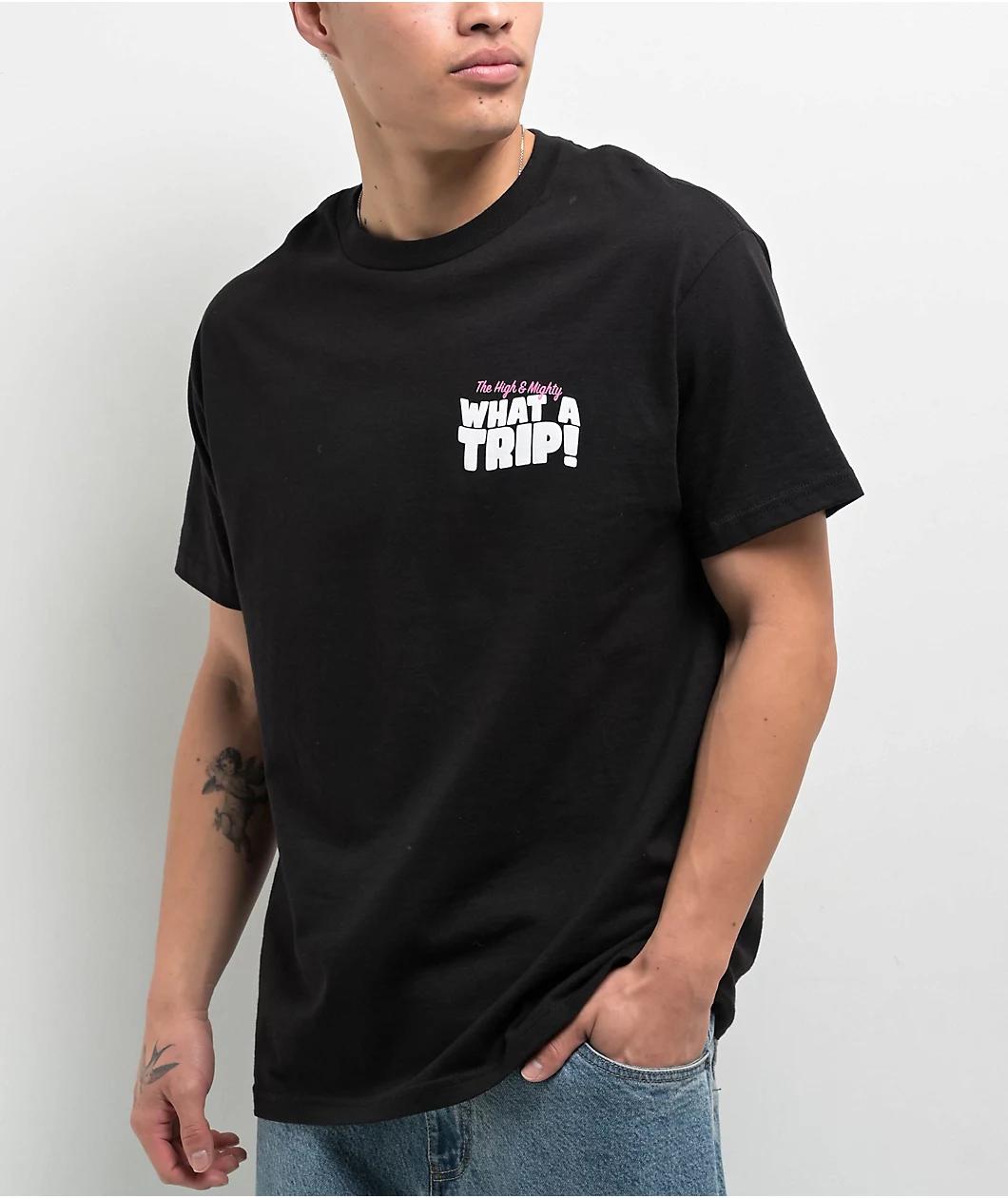 The High & Mighty introduces the Its Magic t-shirt in a sleek black color with screen-printed graphics on the front and back. The front left side reads "What a trip!" adorned by pink branding, whereas the back of the tee showcases a faux advertisemen