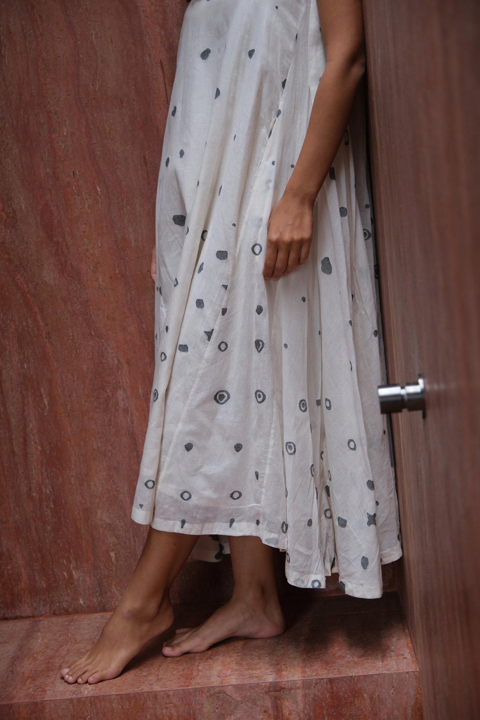 This holiday dress, collaboratively designed with Audrey E Leary and World of Crow, features a midi length, polka dot pattern, and off-white color. It is perfect for outings and can easily be styled and layered with a jacket.