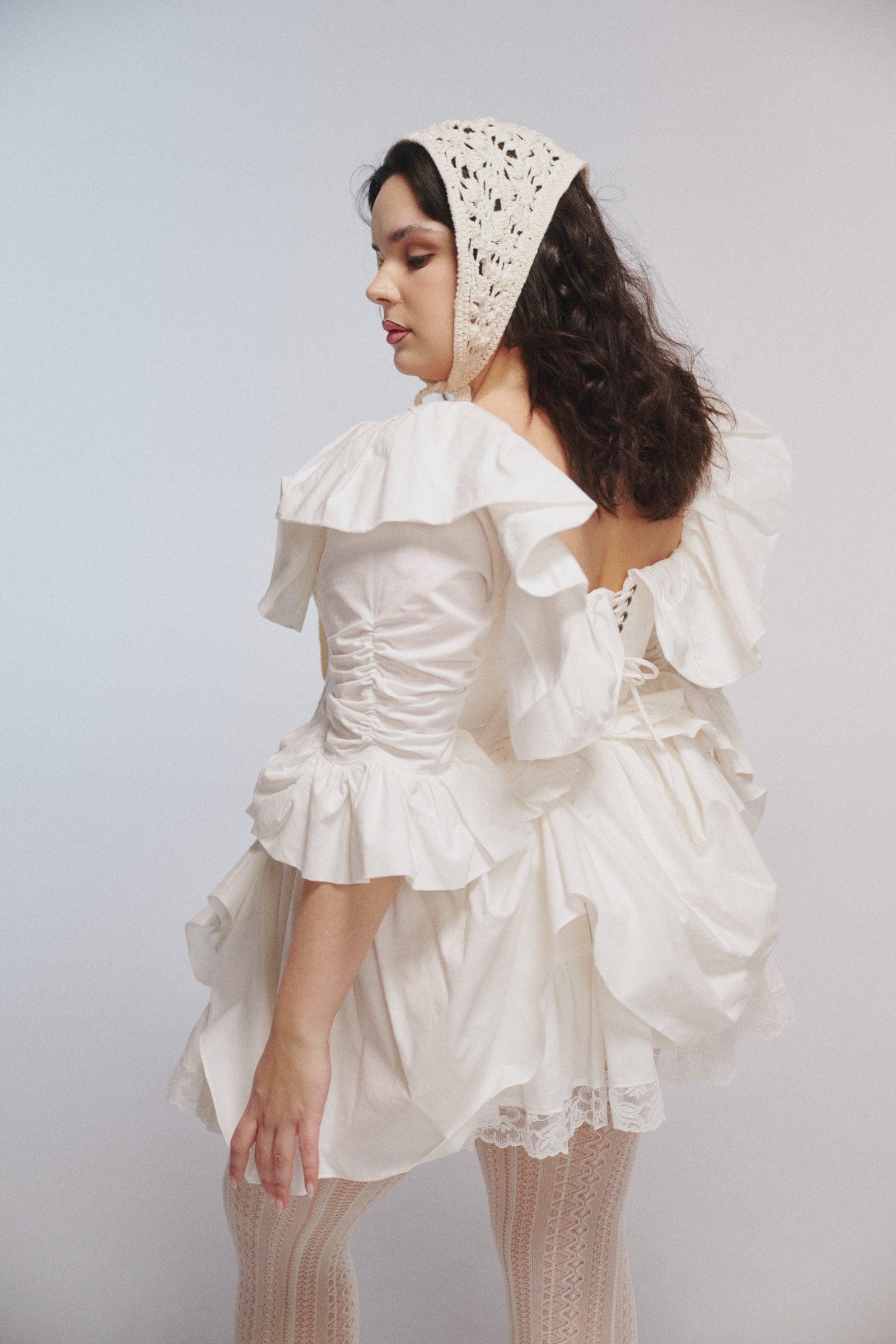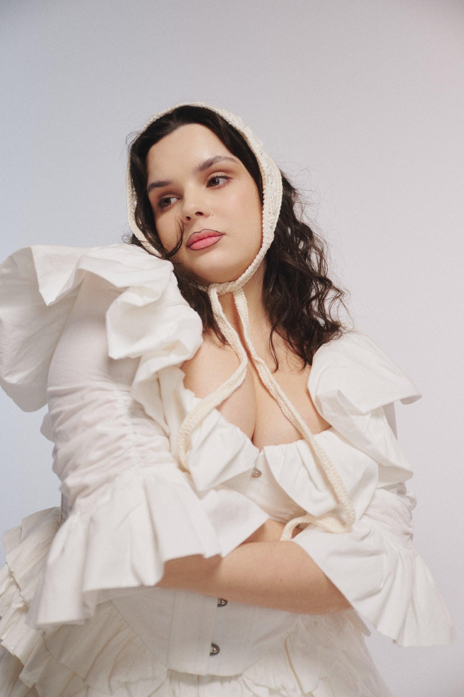 Part blouse, part corset, part something from a traveling circus. Ivory heavy cotton with an oversized ruffle collar, quarter-length sleeves, full boning, and dual drawcord lacing at back. Pair it with high-waisted skirts and let it steal the show. Unusual, romantic, a little bit strange. For performers and drifters alike. Style with the Ivory Kiera Skirt. Heavy cotton Basque waist corset top Oversized ruffle collar and sleeve cuffs Boning at bodice for structure Laces up the back with two draw cords Metal busk closure at front Fabric: 100% Heavy Cotton Alicia is 5’4” and a size XXL in Selkie. Her measurements are 38” bust, 37” waist, 47” hip.