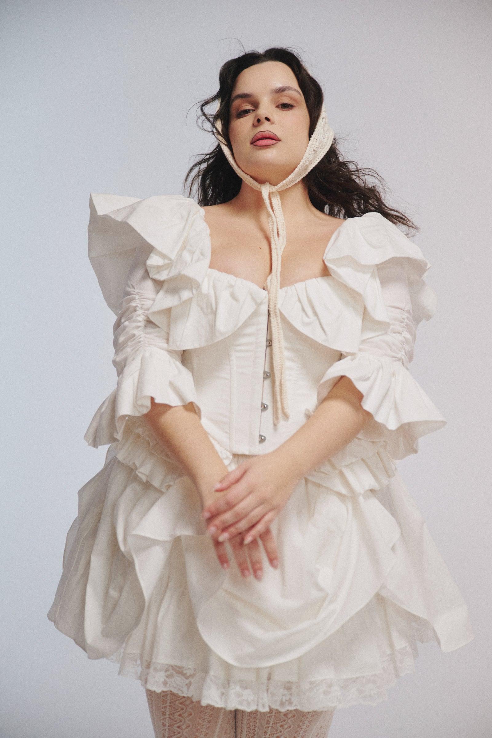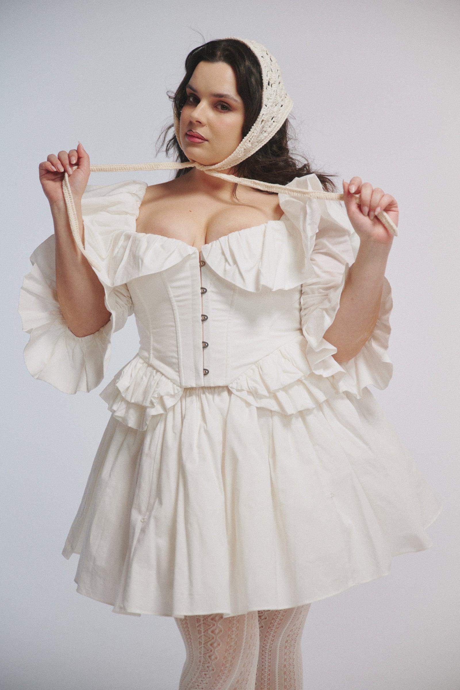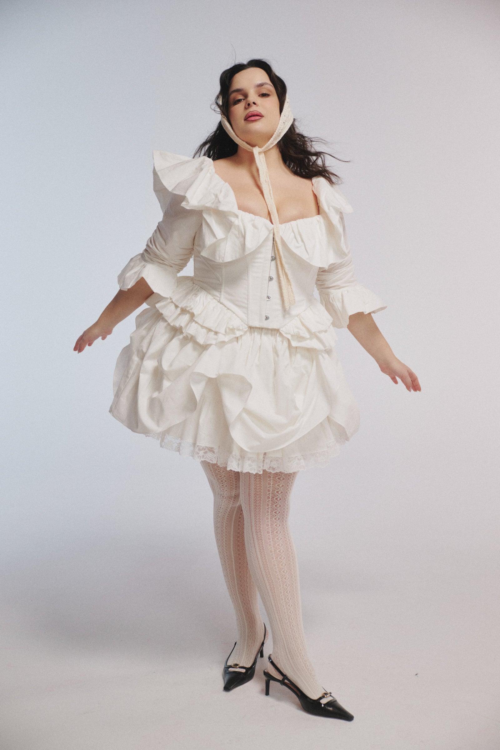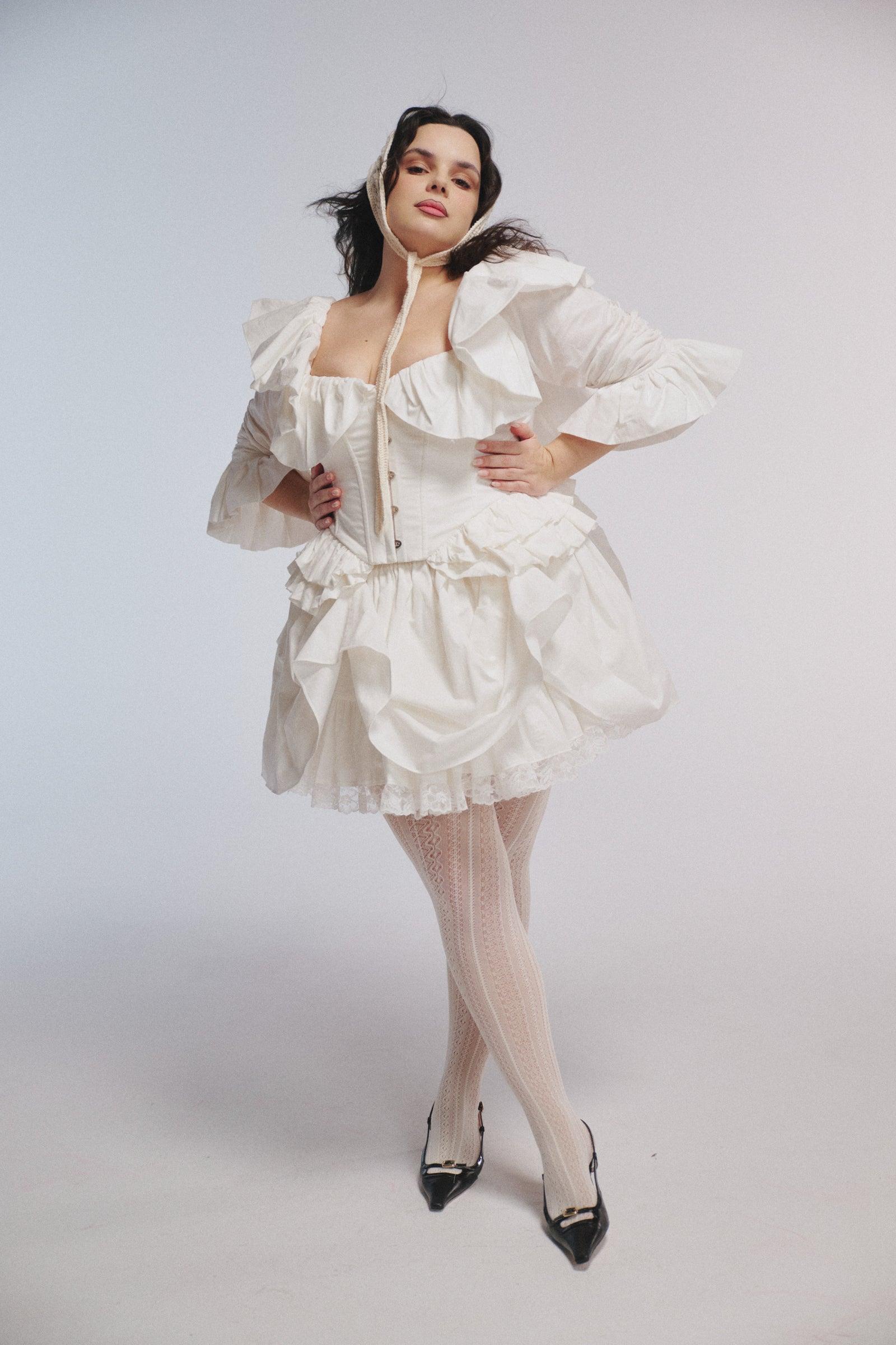 This heavy cotton mini skirt belongs on a traveling circus stage. This heavy cotton mini skirt features front and back bustle detailing with elastic loops and fabric-covered buttons, revealing layers of lace-trimmed underneath. Volume that moves. For performers and drifters alike. Style with the Ivory Frou Frou Corset. Heavy cotton pleated mini skirt Front and back bustle detailing with elastic loops and fabric covered buttons No natural stretch, base on waist size Lace trimmed cotton petticoat for volume Lined with cotton Fabric: 100% Heavy Cotton Alicia is 5’4” and a size XXL in Selkie. Her measurements are 38” bust, 37” waist, 47” hip.