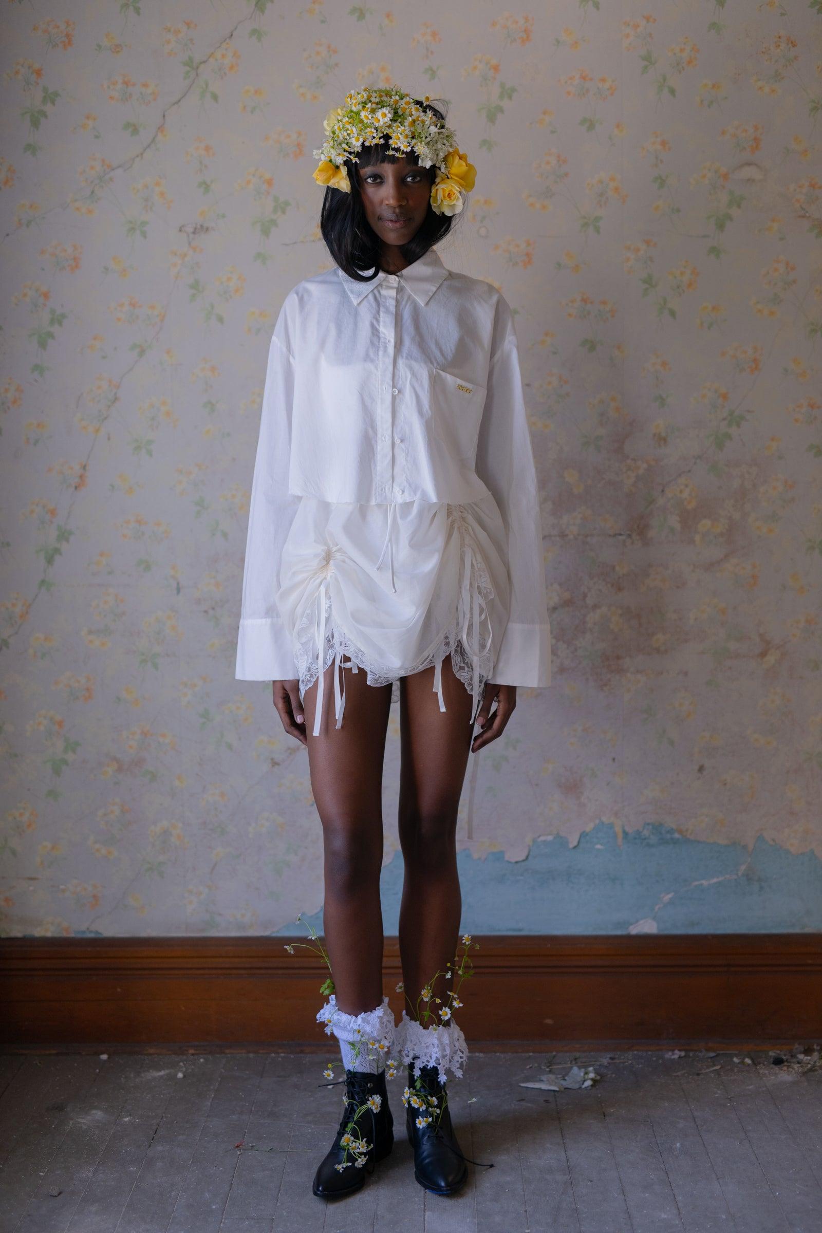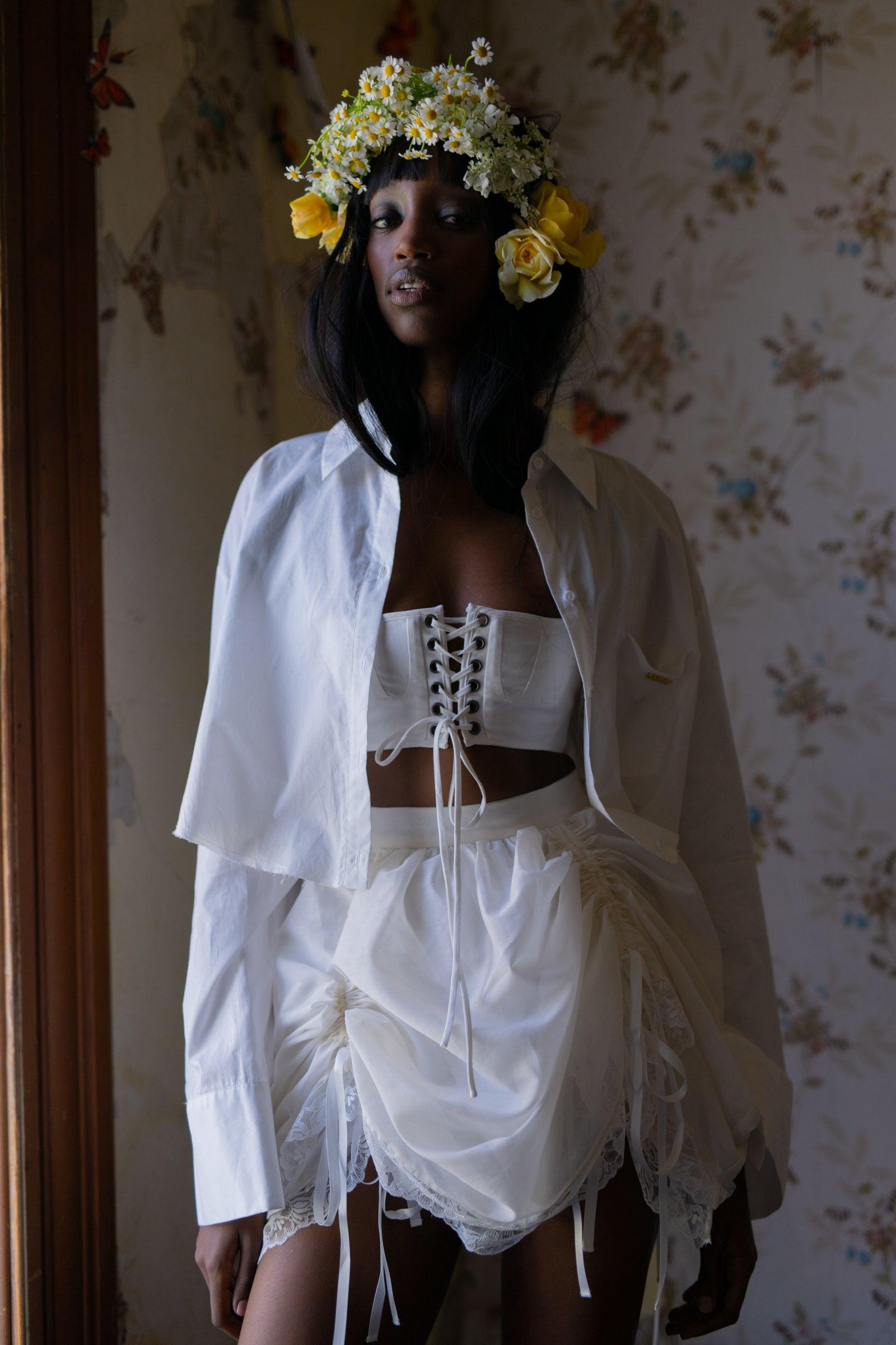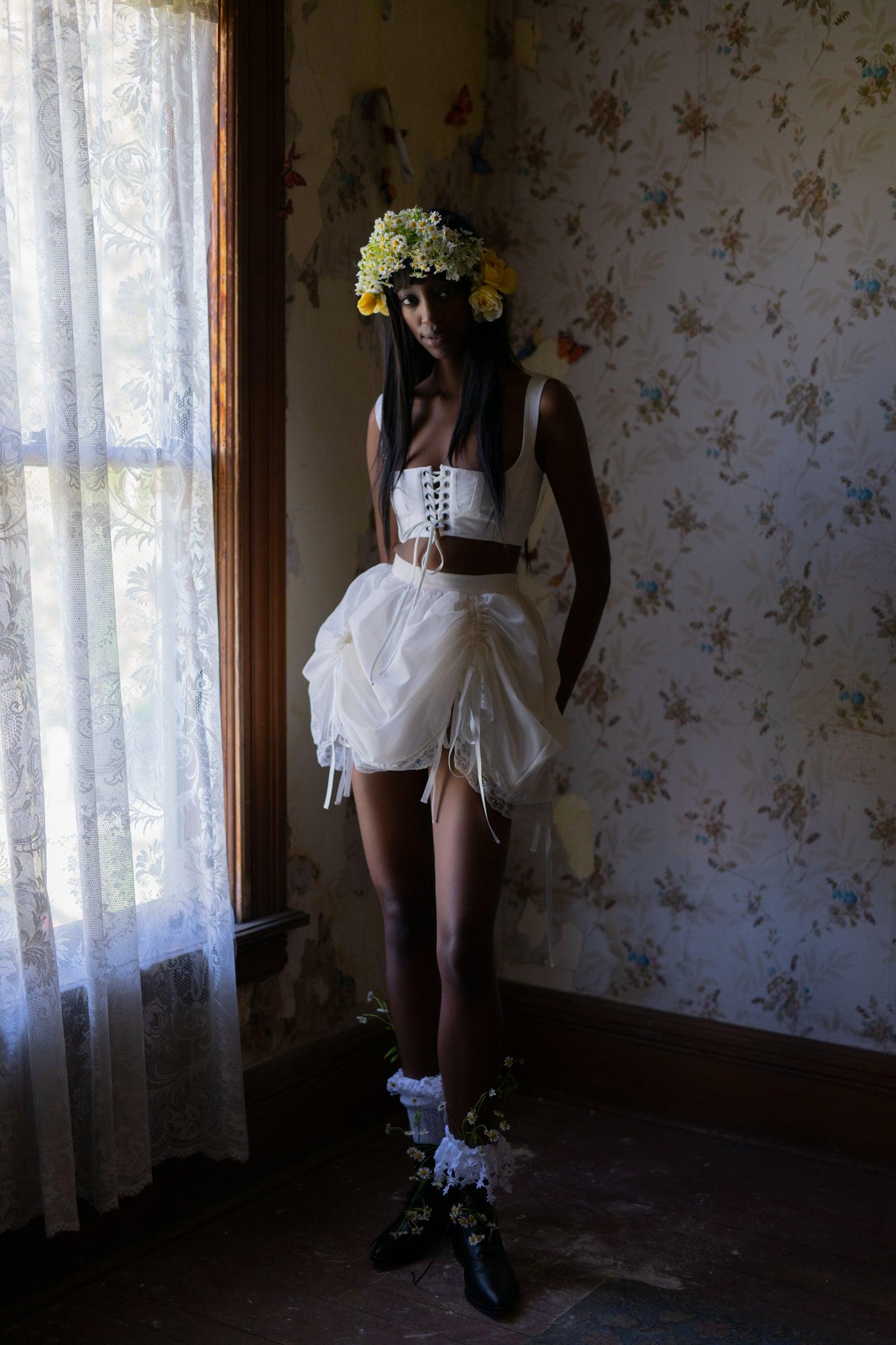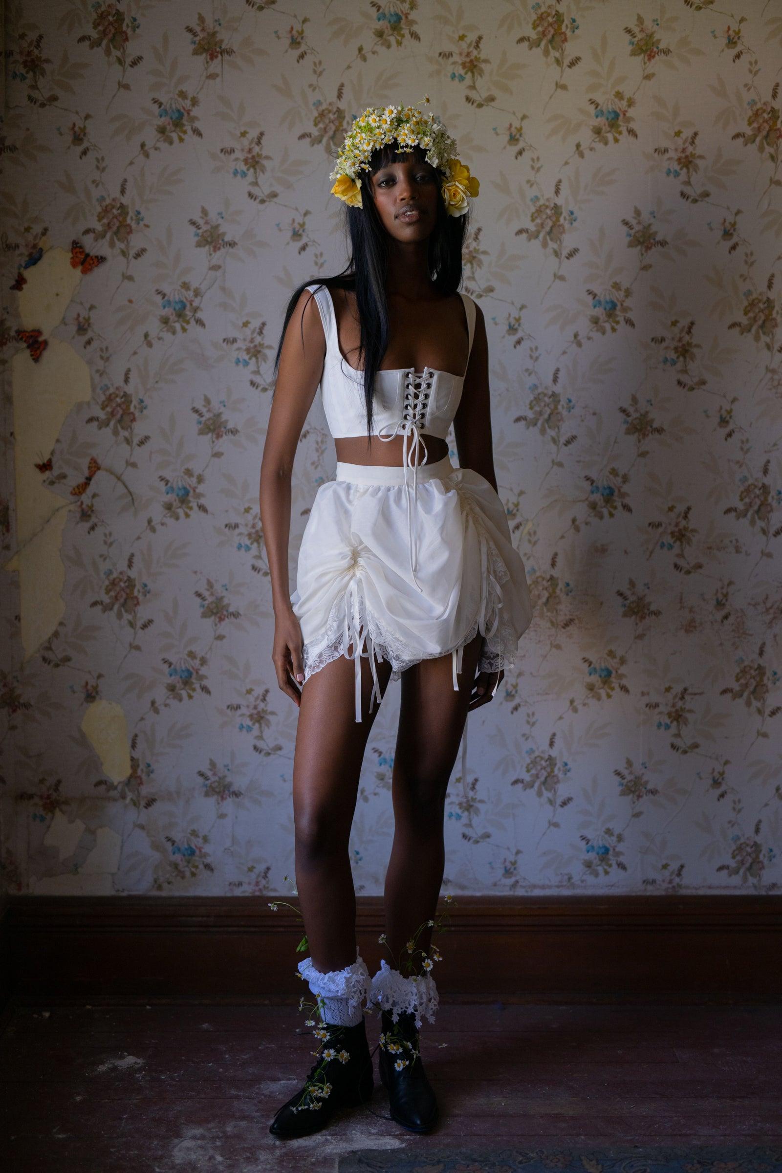 Lightweight and voluminous, this is no typical mini skirt—layers of cotton petticoat float beneath polyester organdy, which can bustle to your liking with adjustable drawstrings. It’s finished with ivory lace and satin ribbons, their pristine hue reminiscent of the commune's misty morning glow. Pair with the Ivory Empire Corset and Cropped Blouse to complete the look. Voluminous poly organdy mini skirt with layers of cotton petticoat Adjustable bustling drawstrings Lace at hem and satin ribbon details To ensure the best fit, measure your across high waist before ordering and steam for optimal beauty. Rembo is 5’11” and wearing a size XS in Selkie. Her measurements are 29” bust, 24” waist, 35” hip. Fabric: 100% Polyester Organdy Petticoat fabric: 100% Cotton Designed and fit in LA, Made in partnership with our reputable and expert production team in Jianying, China. Our products are made with the utmost in quality by some of the best craftsman in the industry. Learn more about our team and see our facilities!