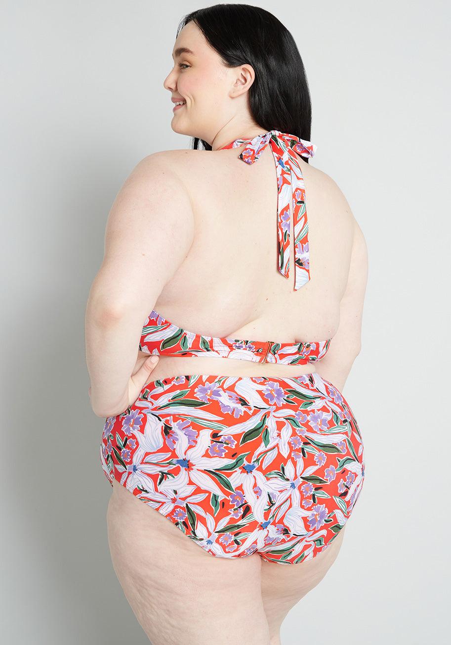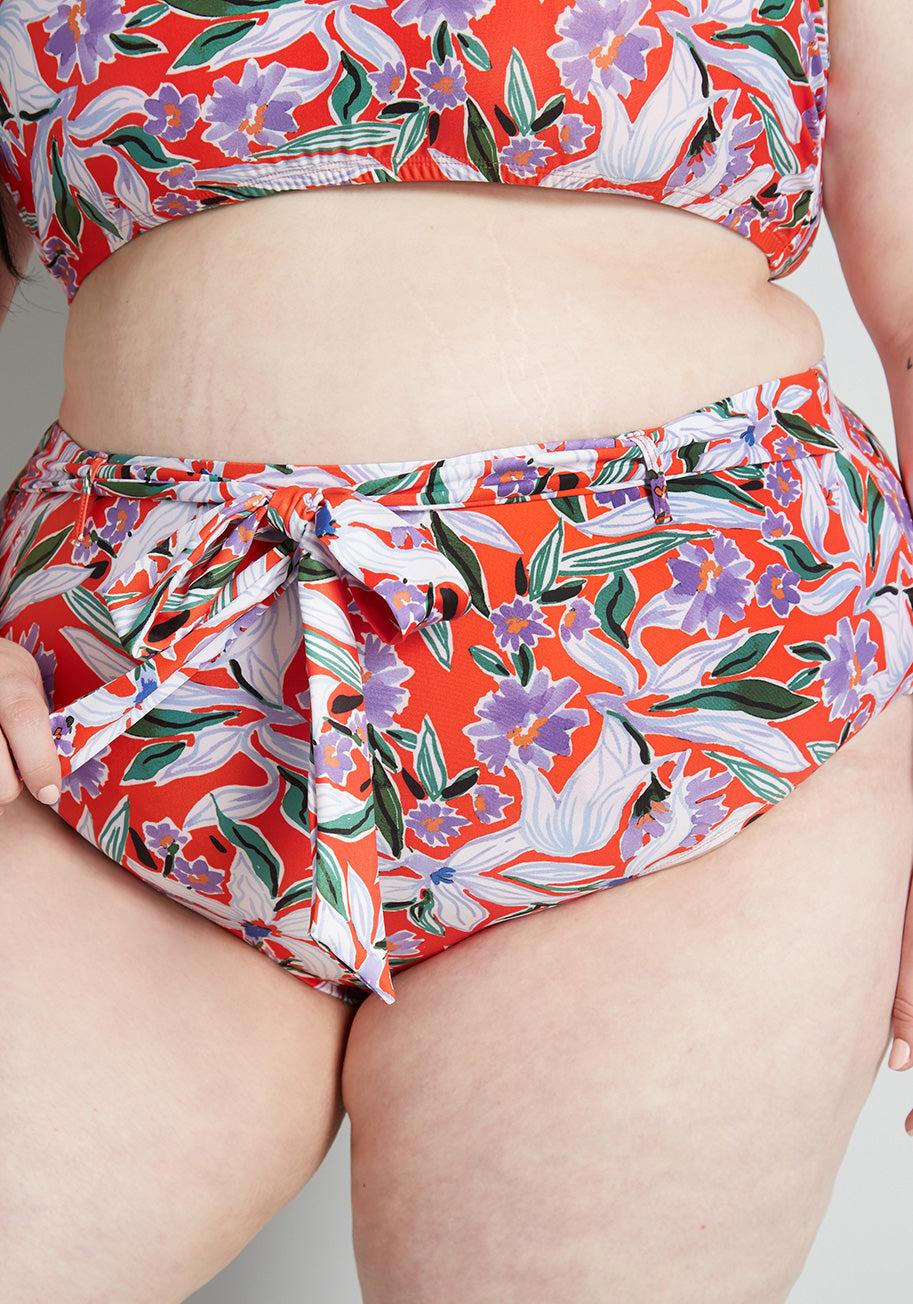 With an adjustable sash tie-front at the waist and a figure-flattering cut, this fiery orange high-waisted bikini bottom from our ModCloth namesake label is all about elevating the details. Featuring an all over vintage-inpsired floral print of painted flowers and stems in hues of purple, green, ivory, and powder blue, with pops of golden yellow throughout, this swimsuit bottom is without a doubt a must-have in your latest set-up in swimwear rotation. Shell: 88% Polyester, 12% Spandex. Lining: 86% Nylon, 14% Spandex. Hand wash. Fully lined. Imported