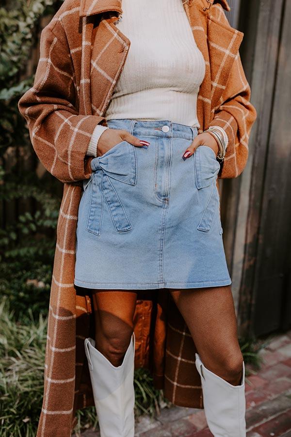 - This denim mini skirt is all about charming vibes with a touch of sweetness! Featuring adorable bow accents, it brings a playful twist to a classic silhouette. The perfect blend of casual and cute, this skirt is easy to style for a fun day out or a laid-back brunch with friends. Its flirty length and delicate details make it a must-have for anyone looking to add a bit of charm to their everyday wardrobe. - Unlined stretch denim material - Belt loops - A hidden zip fly and button closure - Functional side pockets featuring bow accents - A relaxed silhouette that ends in a straight hemline