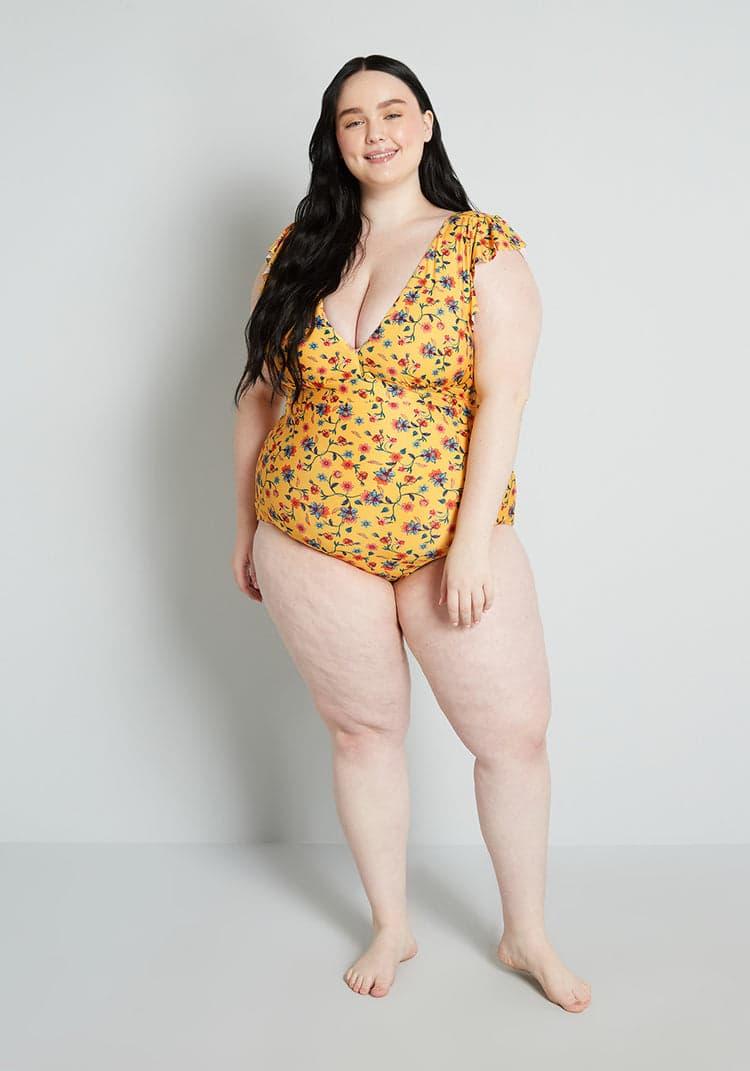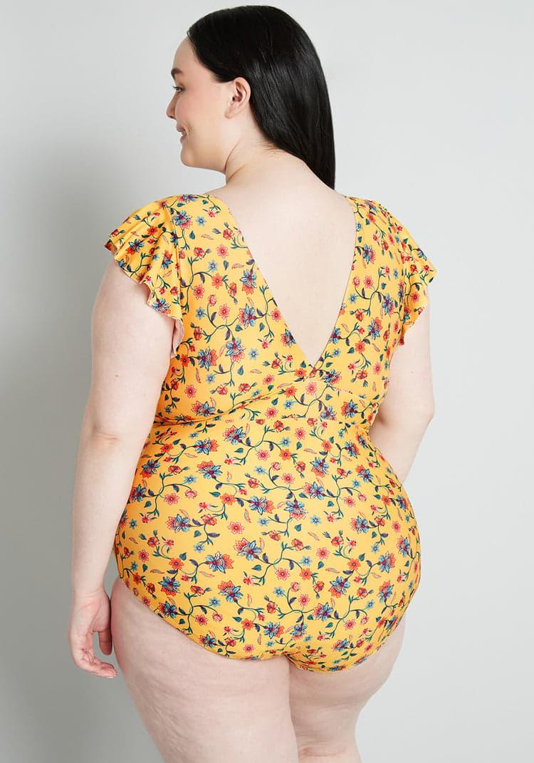 We love a cute swimsuit that allows mobility for outdoor activities - and we’re sure you can relate! With those things in mind, we present you with this yellow one-piece from our ModCloth namesake label with ruffle cap sleeves, a plunging V-neckline, removable pads at the bust, and a stunning, vintage-inspired floral pattern made-up of pink and blue flowers on winding vines with dainty green leaves. Whether you’re up for an active day outside or are simply down to lounge in the sun, this bathing suit excels at both.Shell: 88% Polyester, 12% Spandex. Lining: 86% Nylon, 14% Spandex. Hand wash. Fully lined. Removable bust cups. Imported