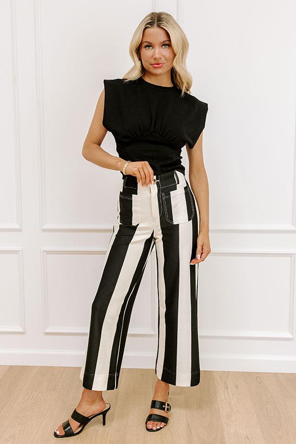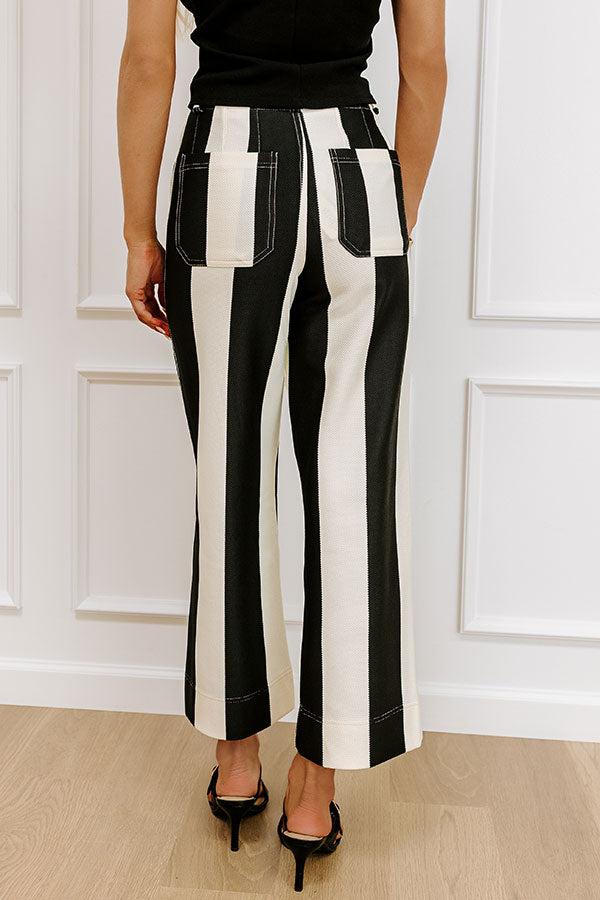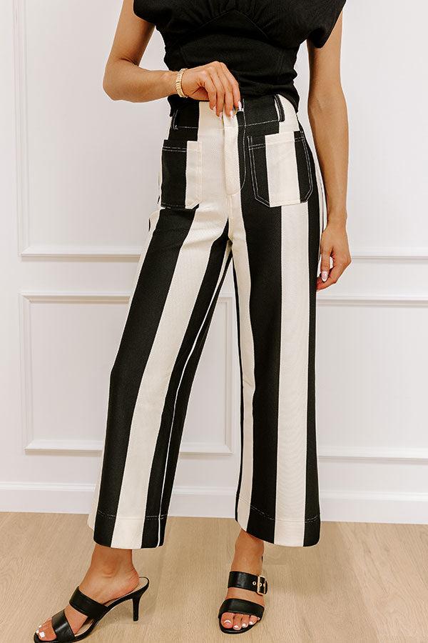 - Make a trendy statement with these cute pants! The striped design brings just the right amount of bold energy for standout moments. - Unlined textured material with a black and cream colored striped pattern - Belt loops - A hidden zip fly and button closure - Functional front and back pockets - A relaxed silhouette that ends in straight hemlines Measurements S : Front Rise 12.5", Hip 32", Inseam 26", Length 37", Waist 27". M : Front Rise 12.5", Hip 34", Inseam 26", Length 37.5", Waist 29". L : Front Rise 13", Hip 36", Inseam 26.5", Length 38", Waist 31".