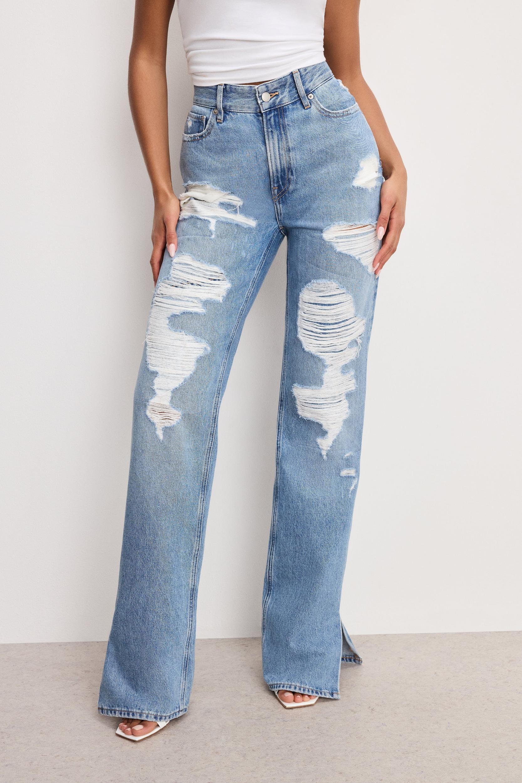 We took everything Khloé loves about our denim and put it into these jeans. These super high-rise jeans have extra-long legs fitted through the hips and thighs, with a vintage-inspired straight silhouette. Extreme distressing adds a bold, edgy, worn-in look. Crafted from signature rigid denim, The Khloé Jean offers a structured, flattering fit with excellent shape retention, even after multiple washes. Super high-rise Relaxed legs Side slits at the hem Distressed detailing Rigid denim Classic 5-pockets Front zip-fly closure Gap-proof waistband Reinforced belt loops Medium light blue wash Inseam: 36" Fabric: 75% Regenerative Cotton, 25% Recycled Cotton Care: Wash inside out in cold water with like colors. Do not bleach. Tumble dry on low. Iron on low heat. Do not dry clean.