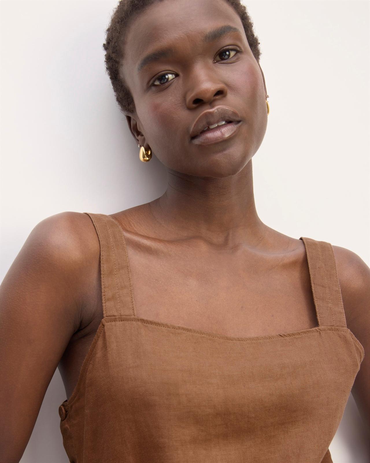 About This Style. This piece features a relaxed fit cropped straight leg square neckline elasticized back side button detail with self covered buttons a clean front and made from 100% European Flax Linen. Did You Know? This style is made using European Flax Linen which comes from flax fibers cultivated and processed according to the standards set by the European Confederation of Flax and Hemp (CELC). Sourced exclusively from Belgium France and the Netherlands it uses no GMOs little-to-no irrigation and a 100% mechanical process for zero-waste operation during extraction. It also boasts a significantly lower environmental impact compared to conventionally grown linendemonstrating reduced carbon emissions eutrophication and water usage throughout the production process. Womens Linen Side-Button Jumpsuit by Everlane in Carob Brown, Size 16