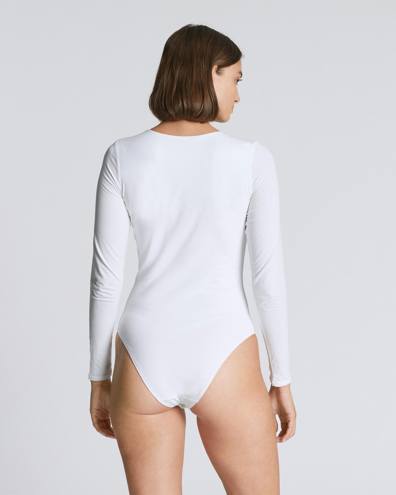 An understated and elevated base layer. Slip into a foundational piece that fits like a hug. Made from a blend of soft breathable Supima cotton and stretchy elastane The Long-Sleeve Supima Square-Neck Bodysuit features a classic square neckline form-fitting shape and snap closure for extra ease. Style underneath a tailored blazer or wear on its own with high-waisted denim. Say hello to Supima cotton. Were transitioning our existing Pima basics to Supimaa domestically sourced cotton with licensing programs giving us full supply chain visibility right down to the farm level. Grown in the United States in just over 500 farms Supima cotton is distinguished by its extra-long fiber length which gives it more durability and a softer hand feel plus it absorbs colors much better than conventional cotton. Womens Long-Sleeve Supima Square-Neck Bodysuit by Everlane in White, Size L