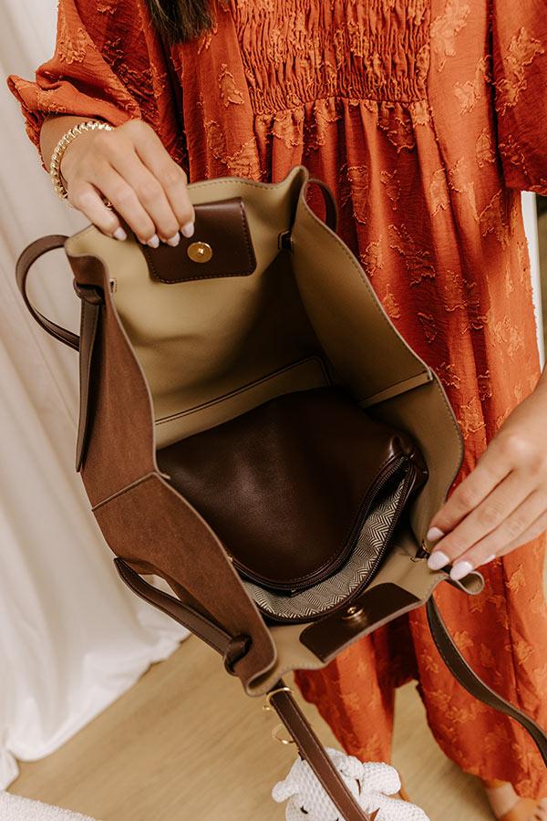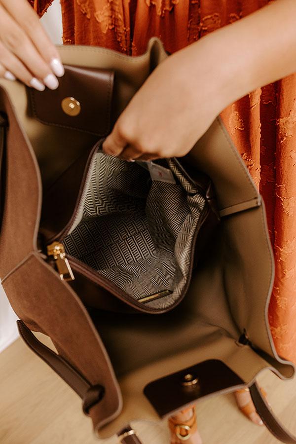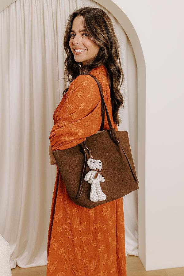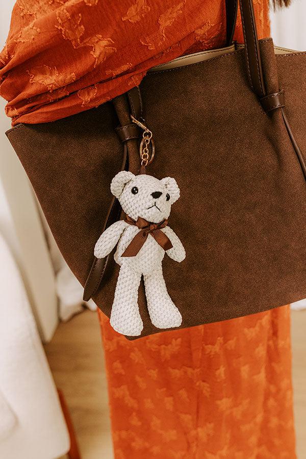 - Keep your look on point with this trendy tote! Teddy bear charm and extra pouch bring playful energy to your daily adventures. - Faux suede material - Sleek faux leather accents - Two shoulder straps with knot details - An ivory colored bear purse charm that clips on to a strap - Button closure - An unlined interior - A separate faux leather pouch with zip closure