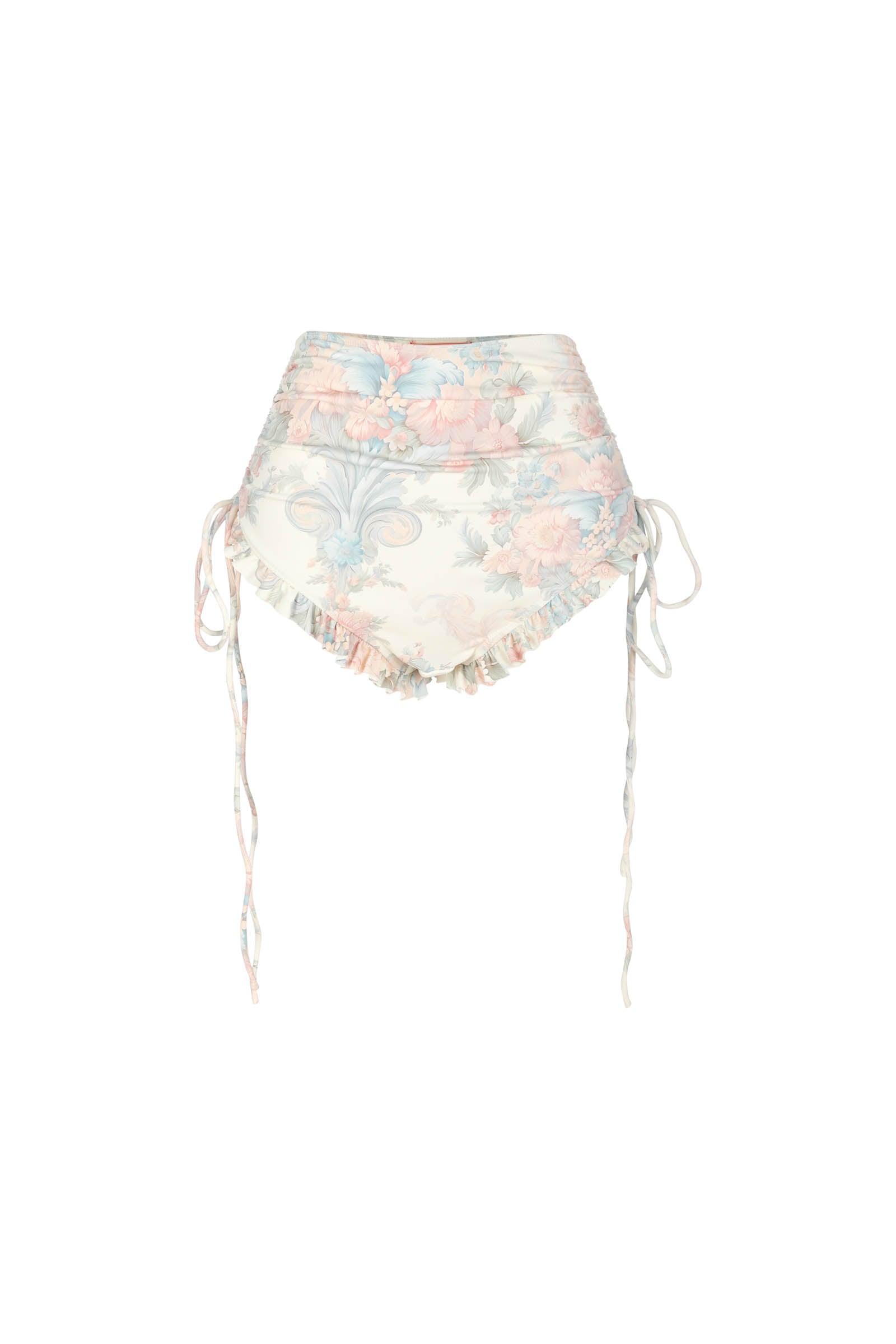Designed for the avant-garde bombshell, these bikini bottoms combine the opulence of 18th century France with the gaudy flamboyance of the swinging sixties. Embellished with pastel-hued florals and filigrees in the sweet shades of French macarons, these bottoms feature a high-waisted, 1960s design and adjustable drawstring ties at the hip, while the pleated mini ruffle infuses a hint of rococo-inspired glitz. Pair with the Macaron Ruffle Bikini Top. Style with the Macaron Beverly Hills Cover-Up and Dauphine Cover-Up Skirt to complete the look. High waisted bikini bottoms with adjustable drawstring ties at hip Stretch fabric Pleated mini ruffle details Medium-full coverage Pull-on style To ensure the best fit, measure your across high waist before ordering and steam for optimal beauty. Bintou is 5’8” and wearing a size XXL in Selkie. Her measurements are 45” bust, 38.5” waist, 45” hip. Jordyn is 5’9” and wearing a size XS in Selkie. Her measurements are 35” bust, 27.5” waist, 39.5” hip. Fabric: 85% Nylon 15% Spandex Lining: 92% Nylon 8% Spandex