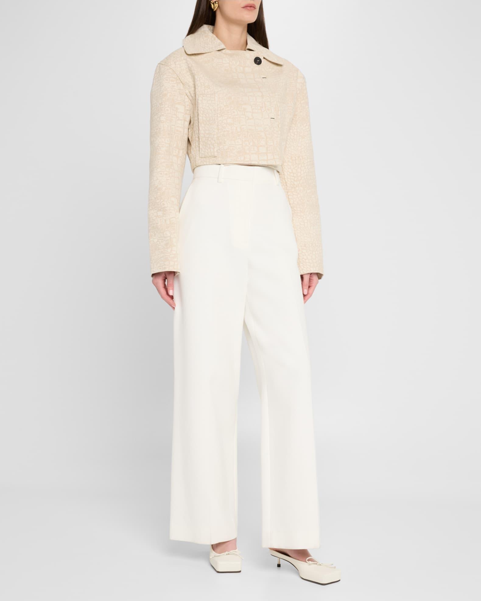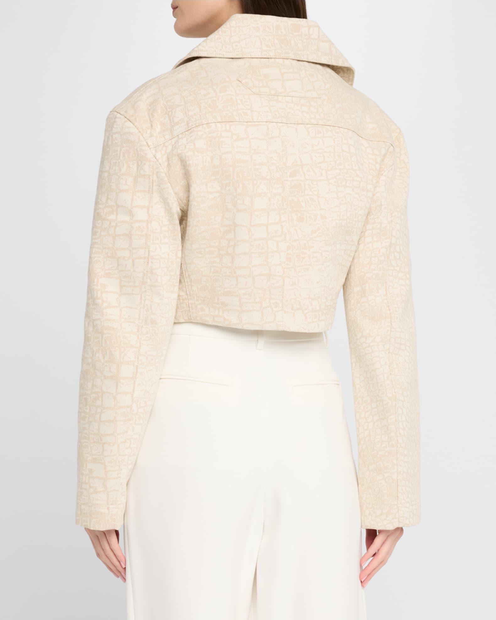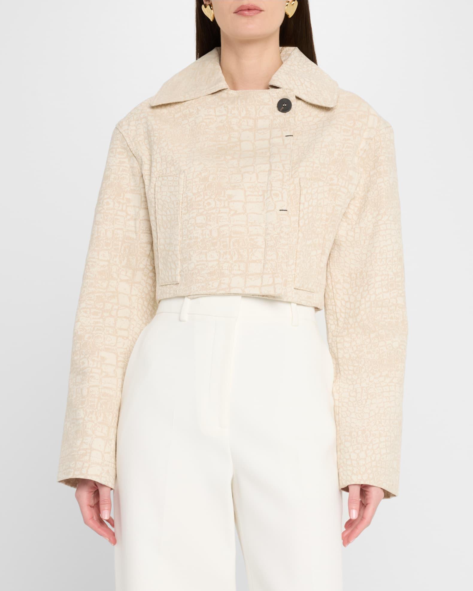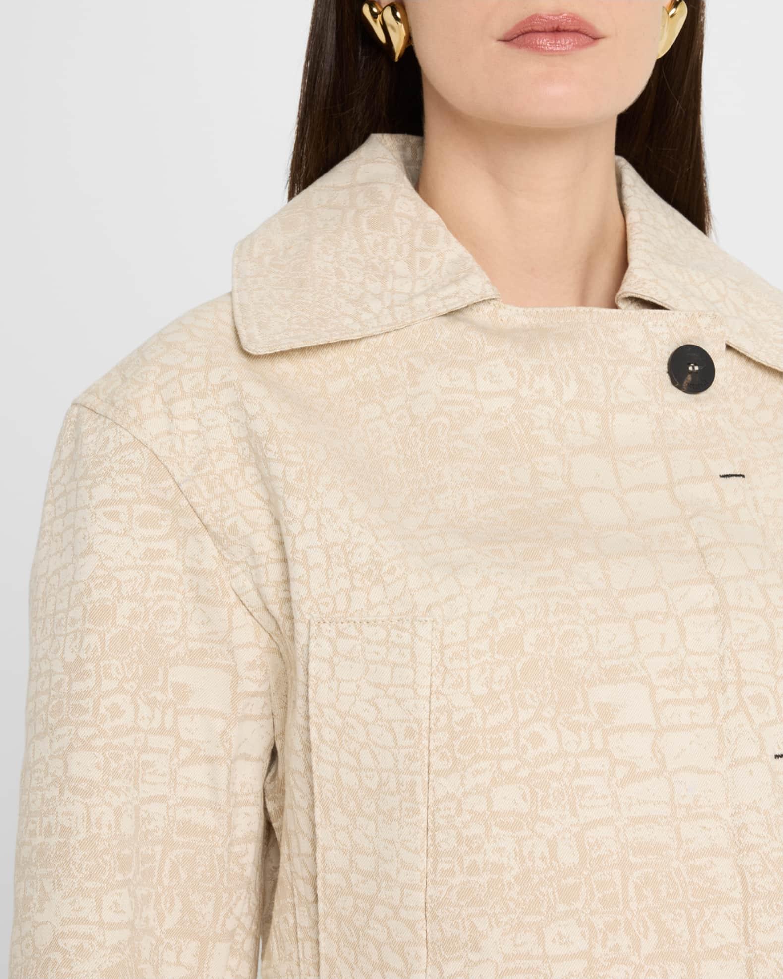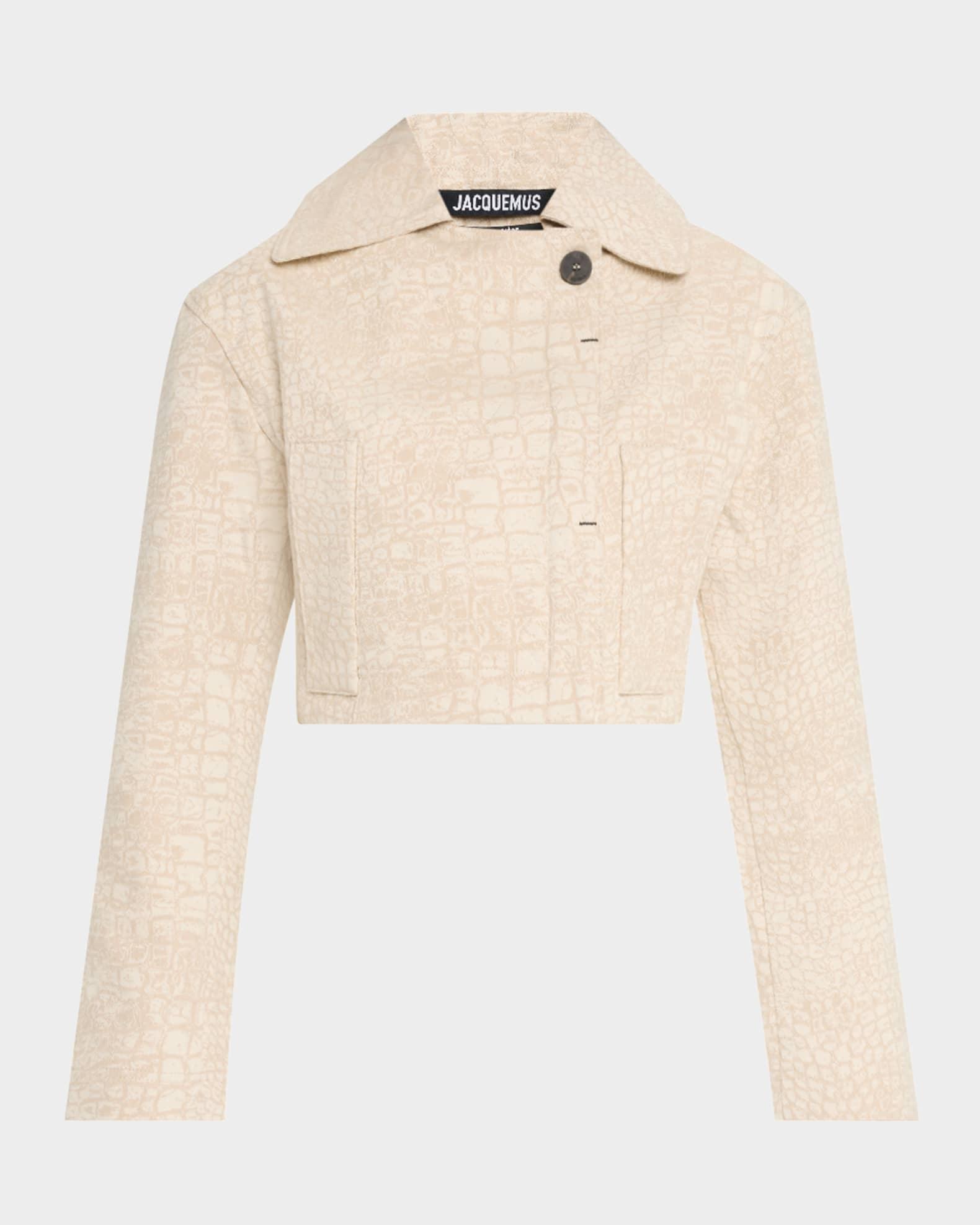 Jacquemus "The Marino de-Nîmes" denim jacke featuring a crocodile print Spread collar; concealed double-breasted front Long sleeves Side welt pockets Loose fit Cropped length Cotton Made in Italy