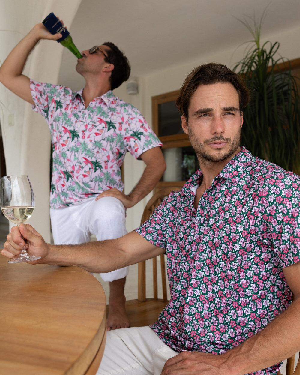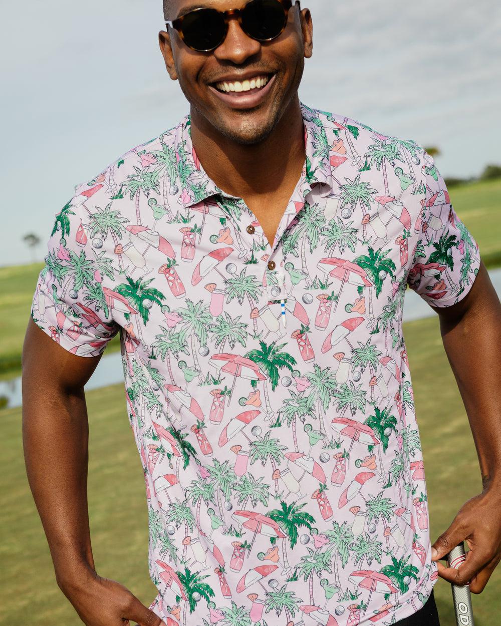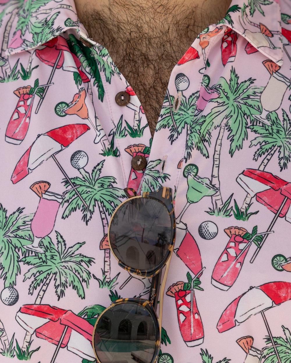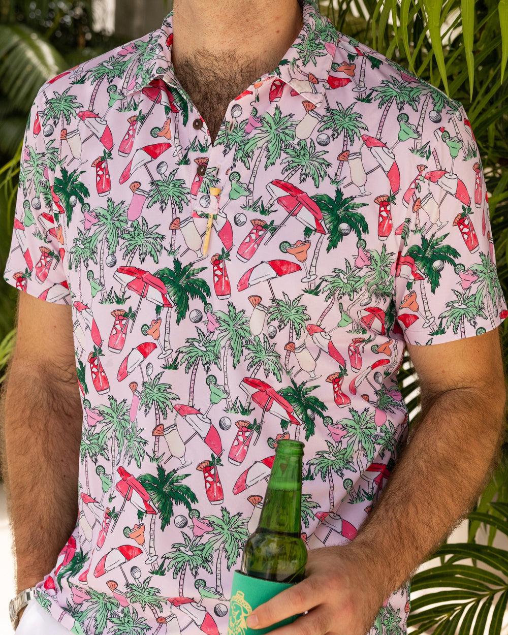 A vacation golf shirt like no other. Whether you're having a little fun during your round, or knocking 'em back while watching the tourney in the clubhouse, you can officially swing into spring fashionably with The Masters of Leisure mens polo.