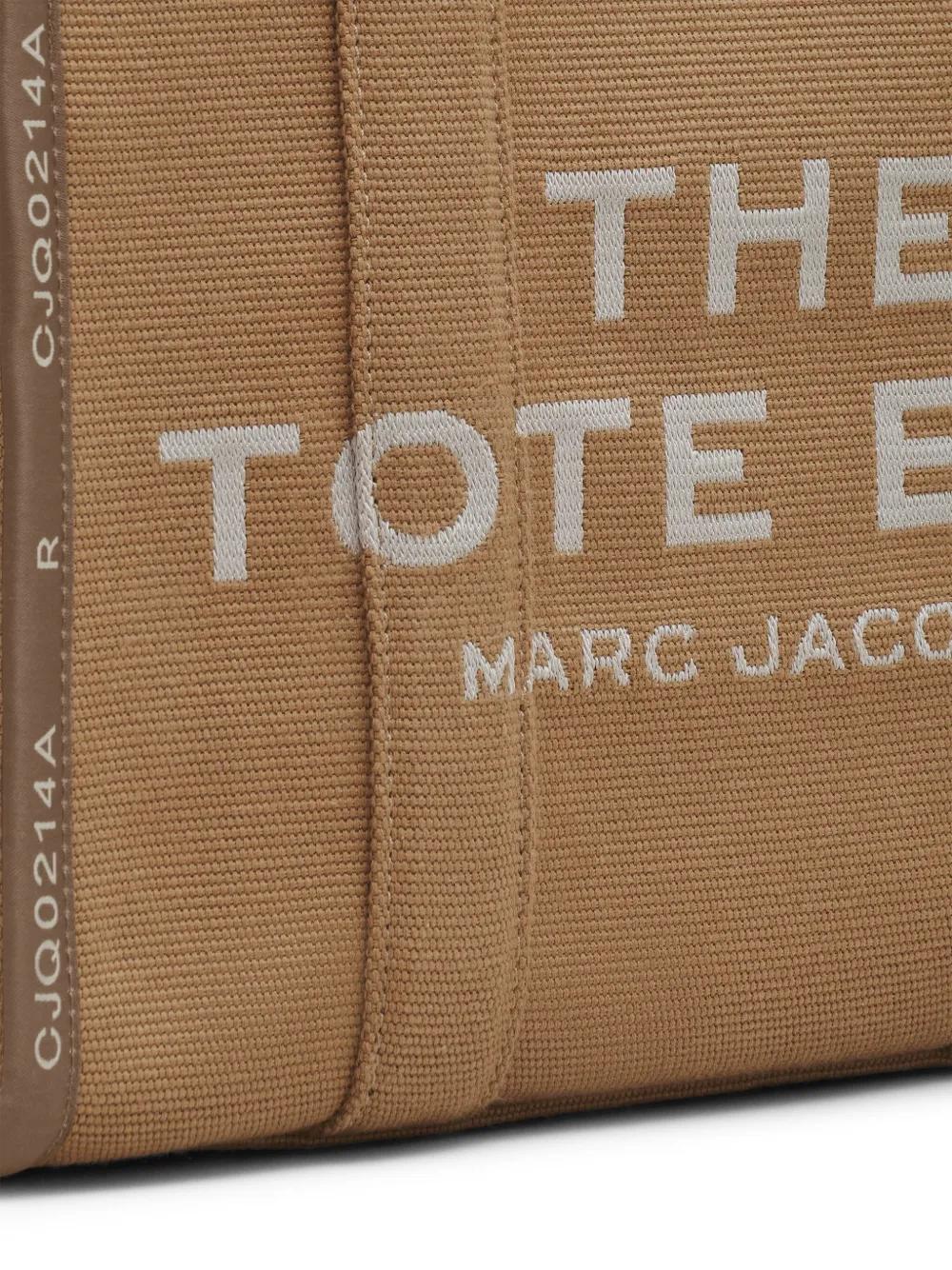 Designed with a jacquard construction, this The Jacquard Tote bag from Marc Jacobs is embroidered with a logo detail on the front. The camel-brown and off-white canvas accessory is topped with two handles and a detachable shoulder strap.