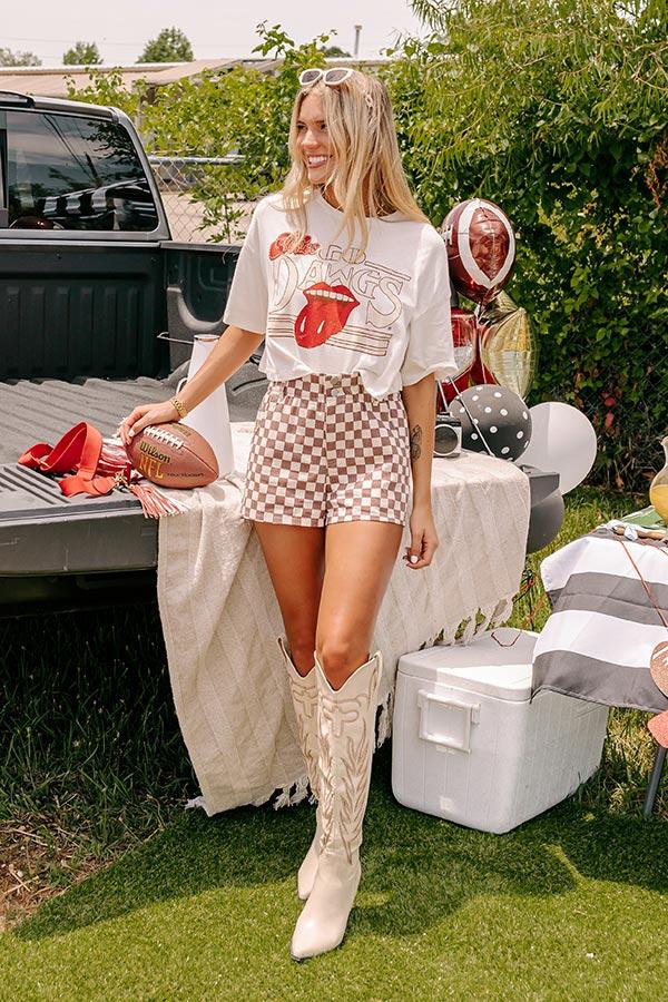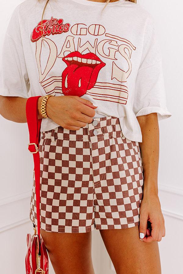 - Step into vibrant style with these fabulous shorts! With a super cute checkered print and a trendy design, they ensure you stand out from the crowd. Whether you pair them with your favorite band tee or create a stylish game day look that is uniquely your own, these adorable shorts are perfect for letting your playful side shine. - Unlined denim material with a checkered print - A wide, elastic banded waistline with belt loops and subtle ruffle detailing - A hidden zip fly and double button closure - Functional side pockets - A relaxed yet flattering silhouette that ends in upper-thigh length hemline