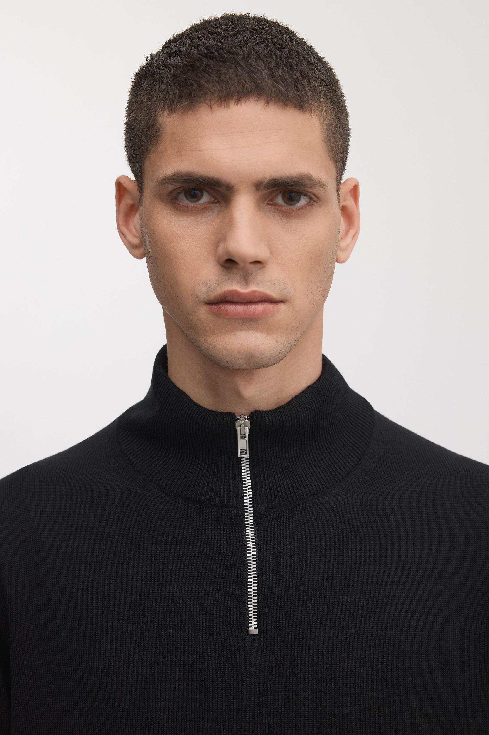 The Merino Half Zip Sweater: 100% extra-fine Merino wool, 12-gauge knit with a stiff double collar. Made in Romania from Tollegno 1900 yarn. Available in three lengths.