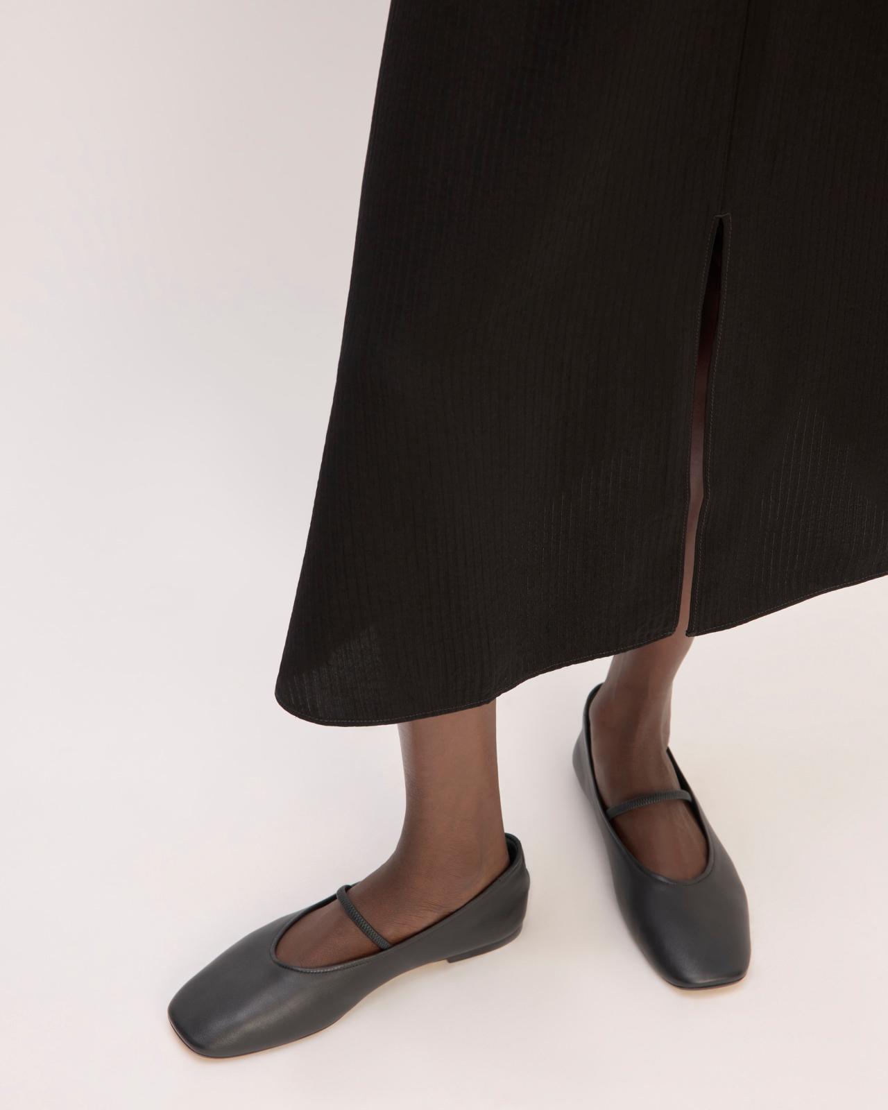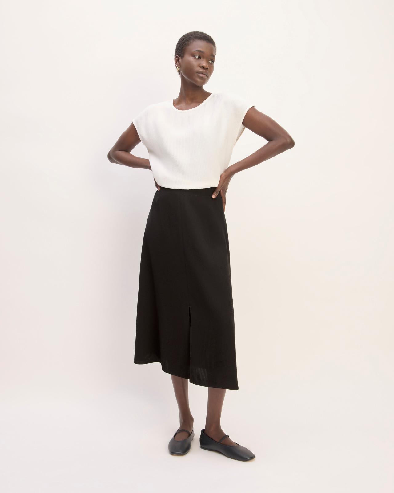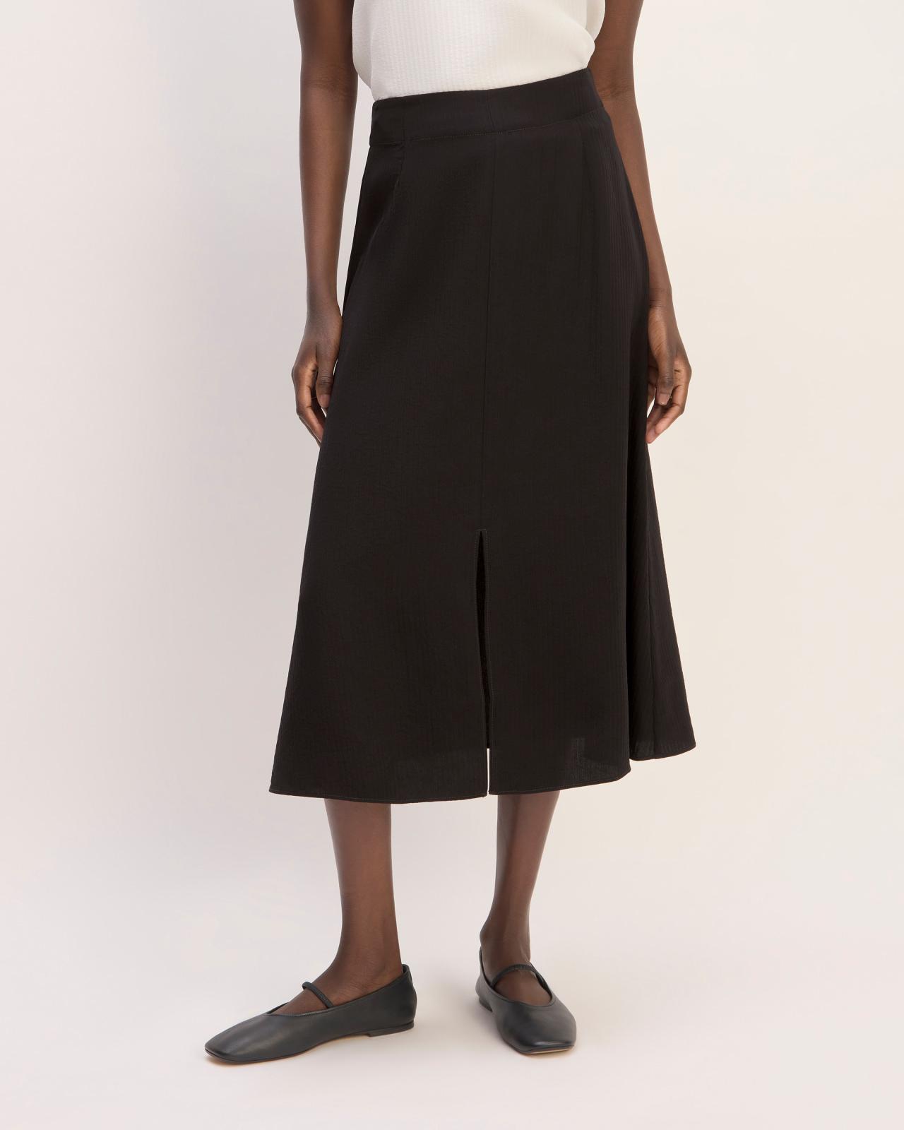 About This Style. This piece features a high rise, A-line slip silhouette, midi length, center front slit, and invisible side zipper, in a textured jacquard FSC-certified viscose and recycled polyester.